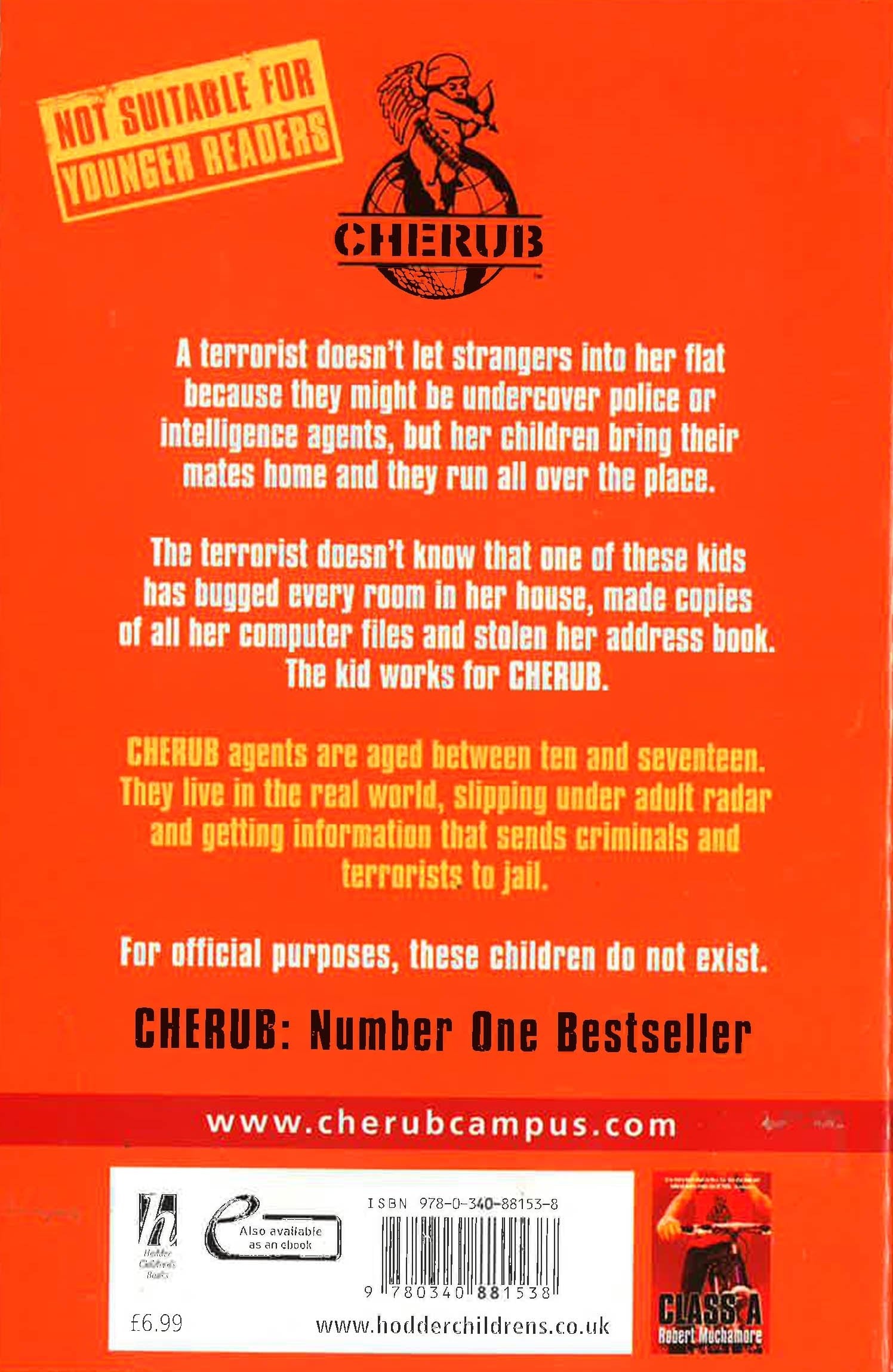 A terrorist doesn't let strangers in her flat because they might be undercover police or intelligence agents, but her children bring their mates home and they run all over the place. The terrorist doesn't know that one of these kids has bugged every room in her house, made copies of all her computer files and stolen her address book. The kid works for CHERUB. CHERUB agents are aged between ten and seventeen. They live in the real world, slipping under adult radar and getting information that sends criminals and terrorists to jail. For official purposes, these children do not exist. And now: a new cover look for this number one bestselling series, which was chosen to be part of World Book Night 2014!