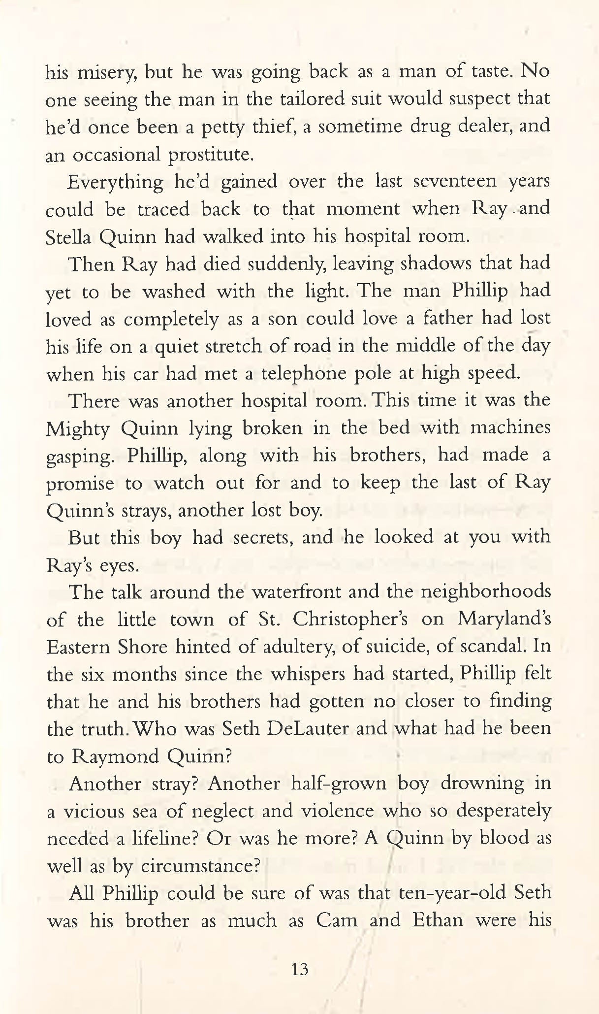 A dangerous secret is coming to shore . . .Philip Quinn has done everything to make his life perfect. With his career on the fast track and a condo overlooking the Inner Harbour, his life on the streets is firmly in the past. But one look at his adopted brother Seth and the memories come flooding back. In Seth he sees the boy he once was.Seth’s future seems assured – until Dr Sybill Griffin shows up in the sleepy town of St Christopher’s. She claims to be researching the town for her new book, but Philip is sure she is hiding something. While he is determined to uncover her motives, Sybill cannot deny her own growing feelings for the intense and mysterious Quinn – but the secret she hides has the power to shatter the brothers’ lives for ever .And when one day Duncan doesn’t come home from exploring in the forest, no one – least of all his grandmother – appears to care about his disappearance. The police, who’ve found the bodies of other missing boys, offer little hope of finding Duncan alive.Yet Maisy refuses to give up.Though she doesn’t know the woods well, she knows someone who does. The strange old woman who lives at their heart . . .Dare Maisy enlist the help of the woman in the wood?And what will she find if she does?