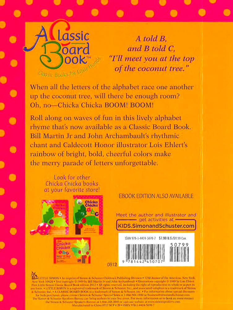 top of the coconut tree" In this lively alphabet rhyme, all the letters of the alphabet race each other up the coconut tree. Will there be enough room? Oh, no--Chicka Chicka Boom! Boom! Countless children--and their parents--can joyfully recite the familiar words of this beloved alphabet chant. Bill Martin, Jr., and John Archambault's rhythmic text keeps the beat with Caldecott Honor illustrator Lois Ehlert's bold, cheerful art. This winning combination has made the Chicka Chicka series an enduring classic.