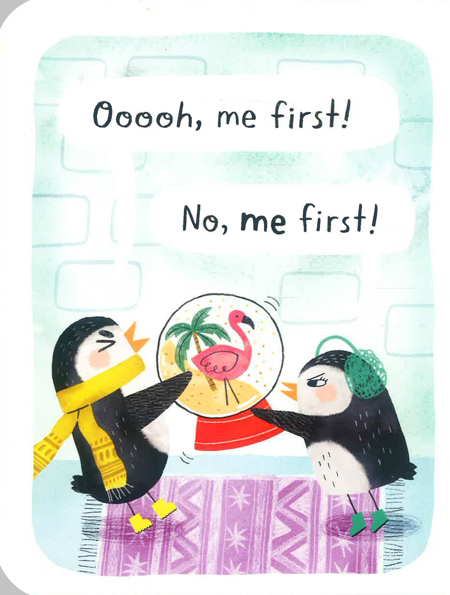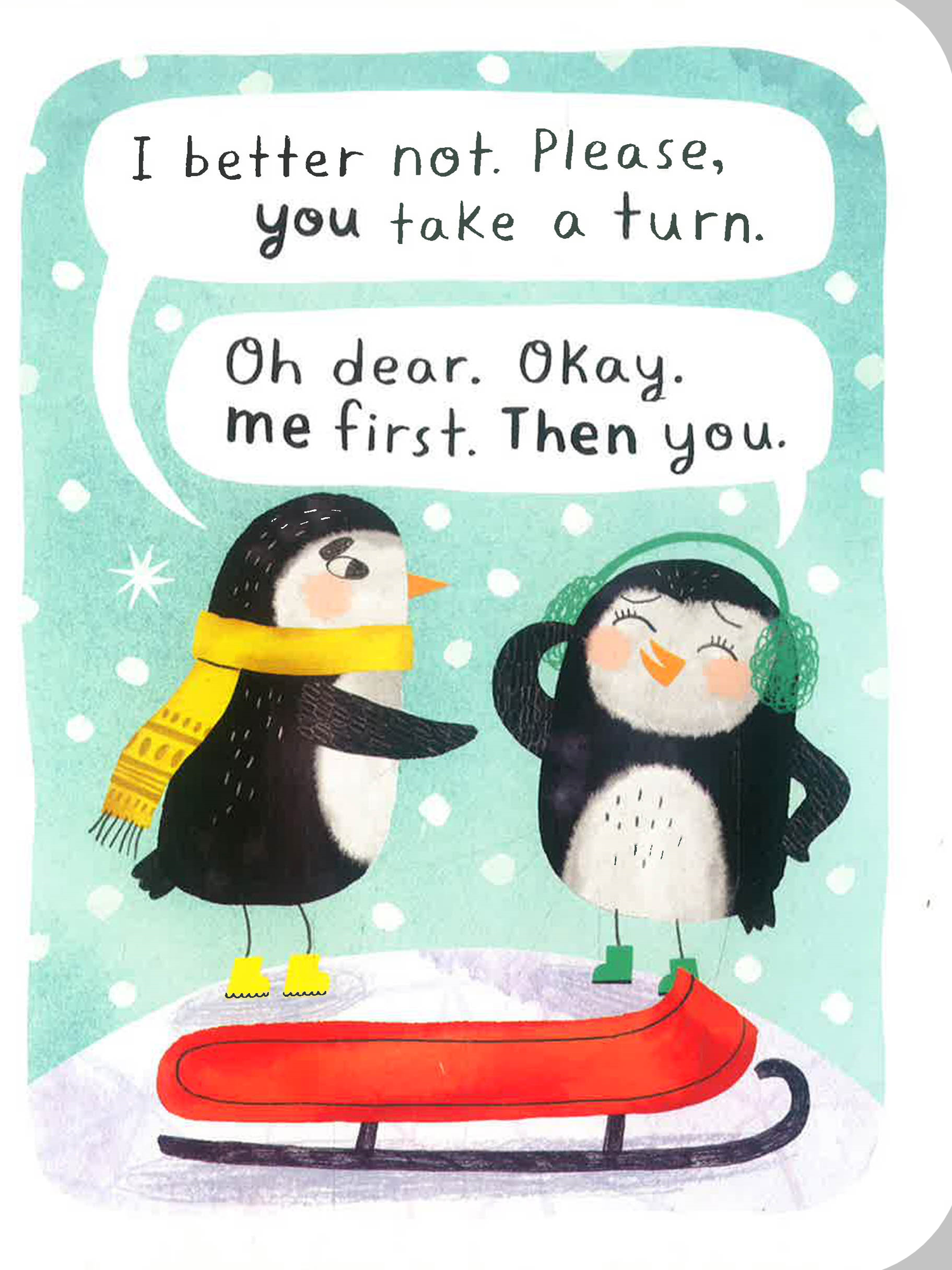 Two baby penguins fight and fuss over the iceberg slide, and then try sharing by taking turns. Can they figure out how to share a cuddle with Daddy, too?