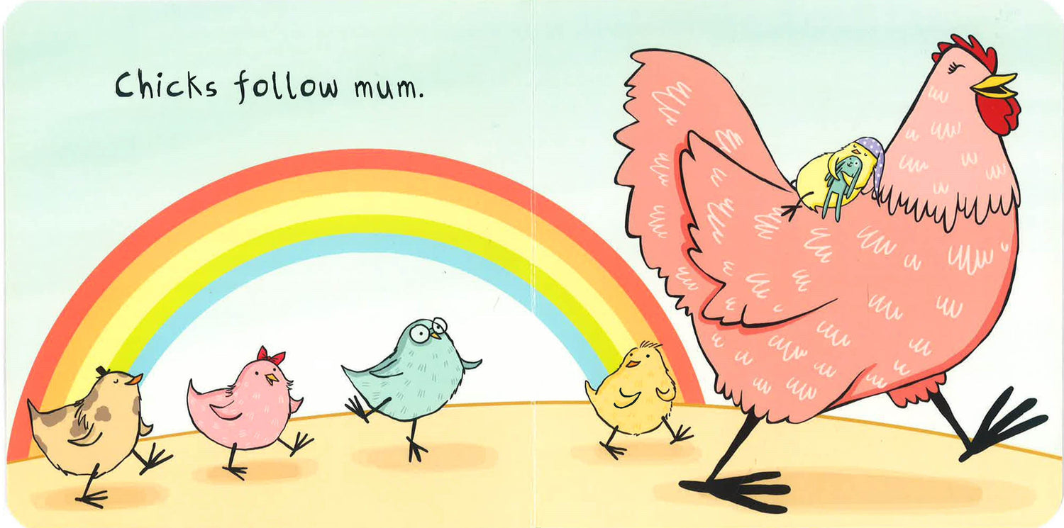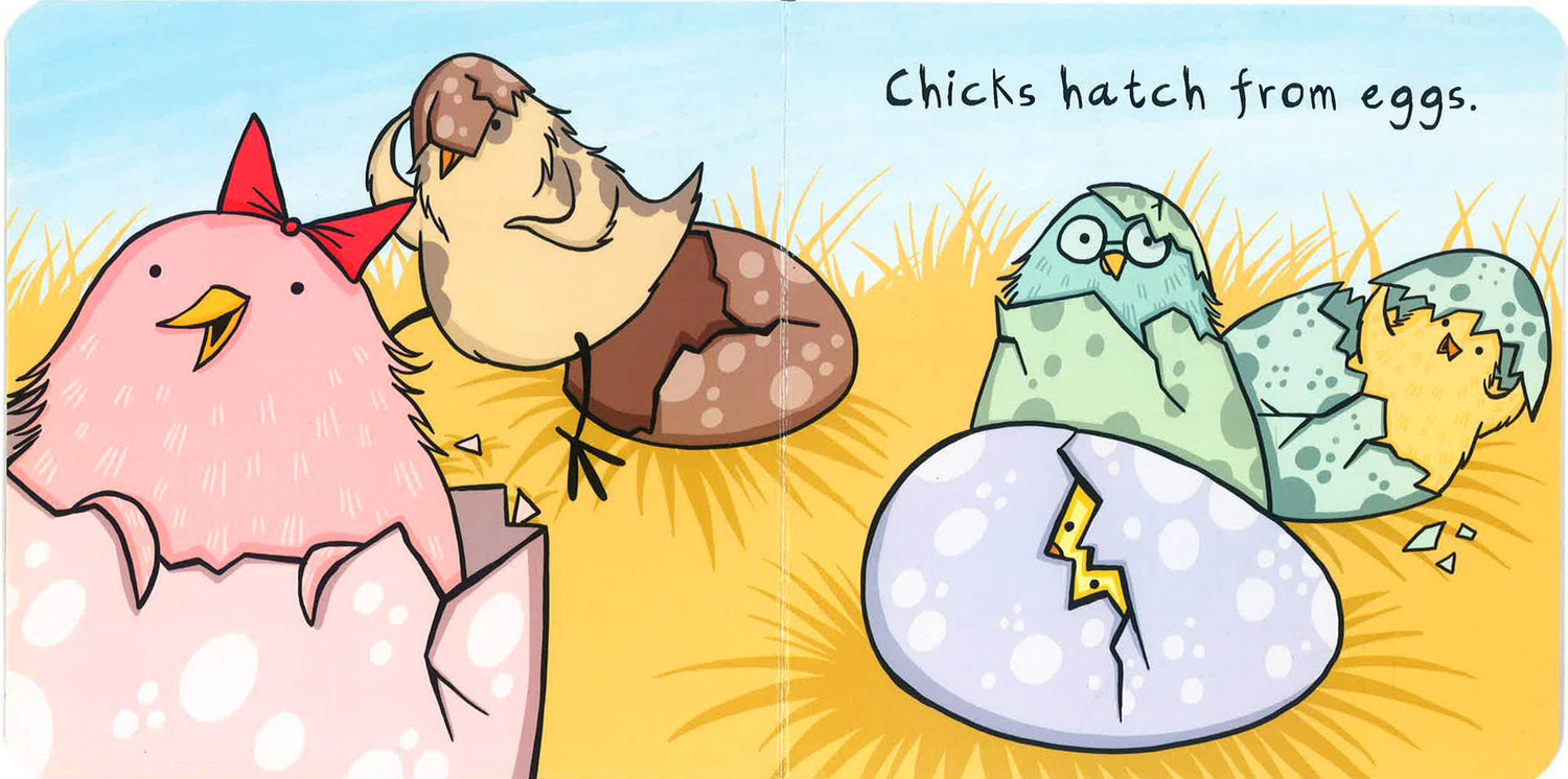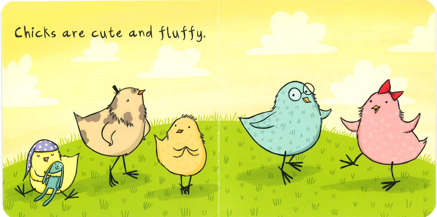 What's cute and fluffy and goes "cheep, cheep, cheep?" Chicks! These sweet creatures love each other and mom very much, and they're having a great time dancing in puddles, hiding among the flowers, peck-peck-pecking in the dirt, and playing with some friendly bunnies.