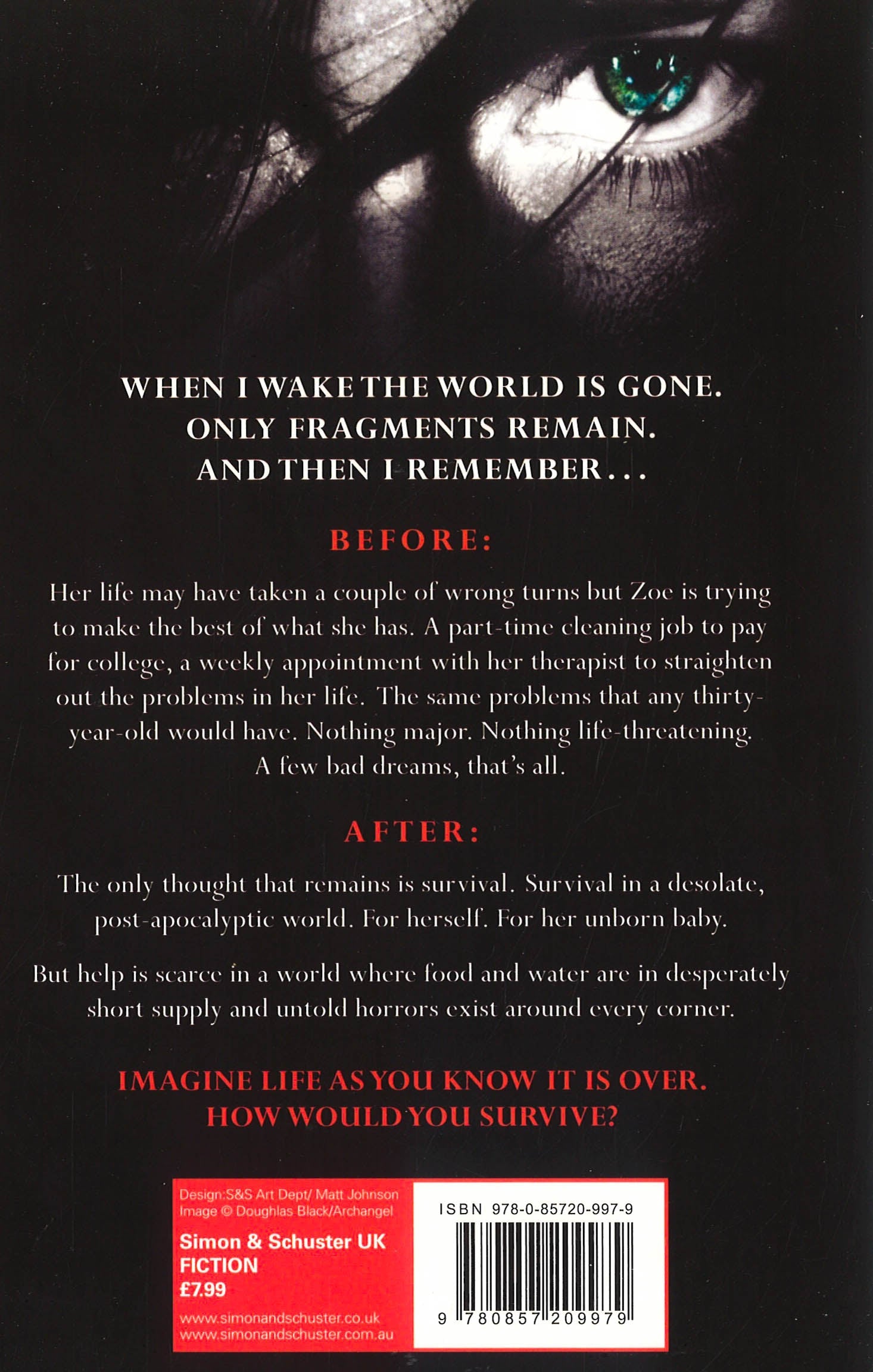 When I wake the world is gone. Only fragments remain. And then I remember . . .Before: Her life may have taken a couple of wrong turns but Zoe is trying to make the best of what she has. A part-time cleaning job to pay for college, a weekly appointment with her therapist to straighten out the problems in her life. The same problems that any thirty-year-old would have. Nothing major. Nothing life-threatening. A few bad dream, that's all. After: The only thought that remains is survival. Survival in a desolate, post-apocalyptic world. For herself. For her unborn baby. But help is scarce in a world where untold horrors exist around every corner, where food and water are in desperately short supply, and the only chance of happiness is half a world away.