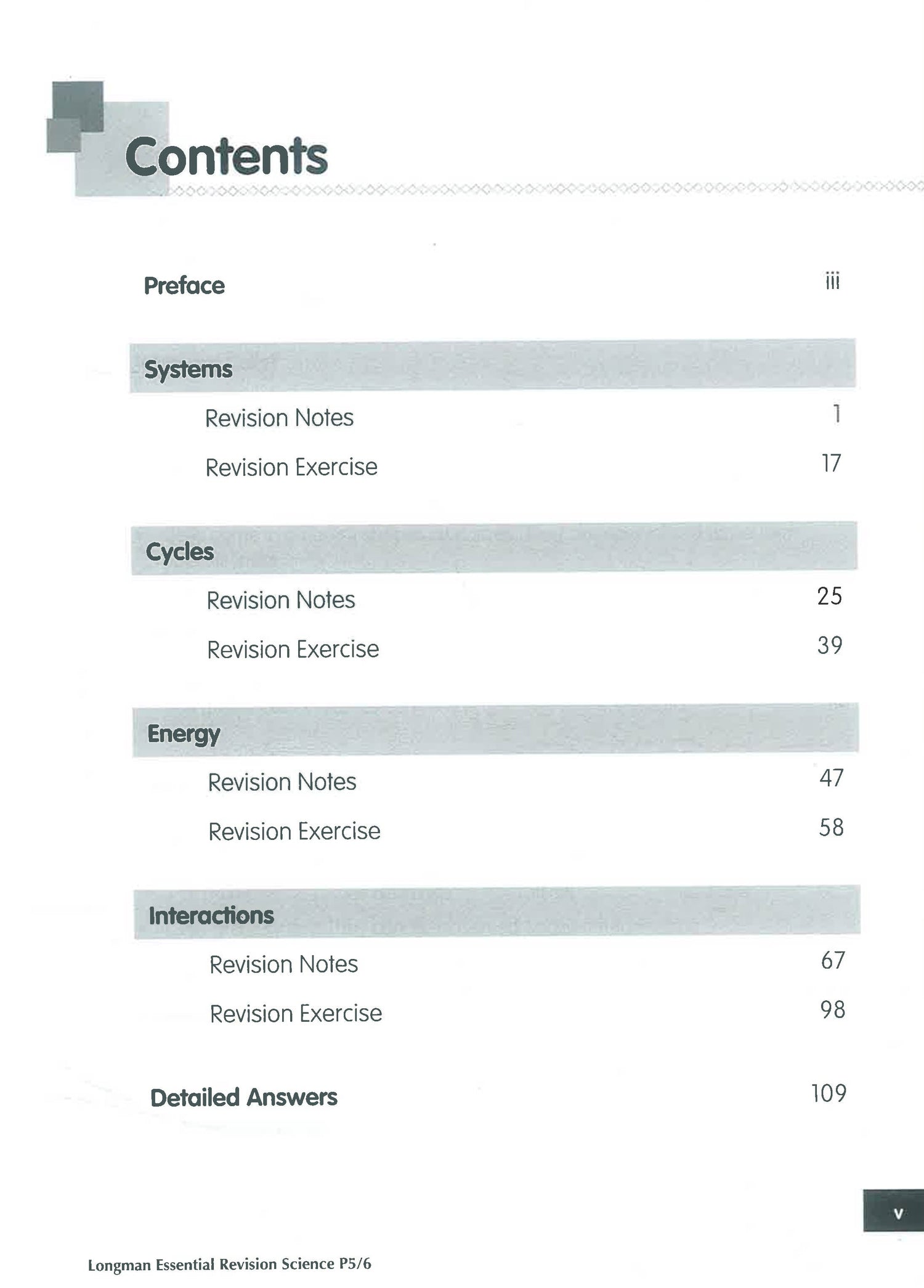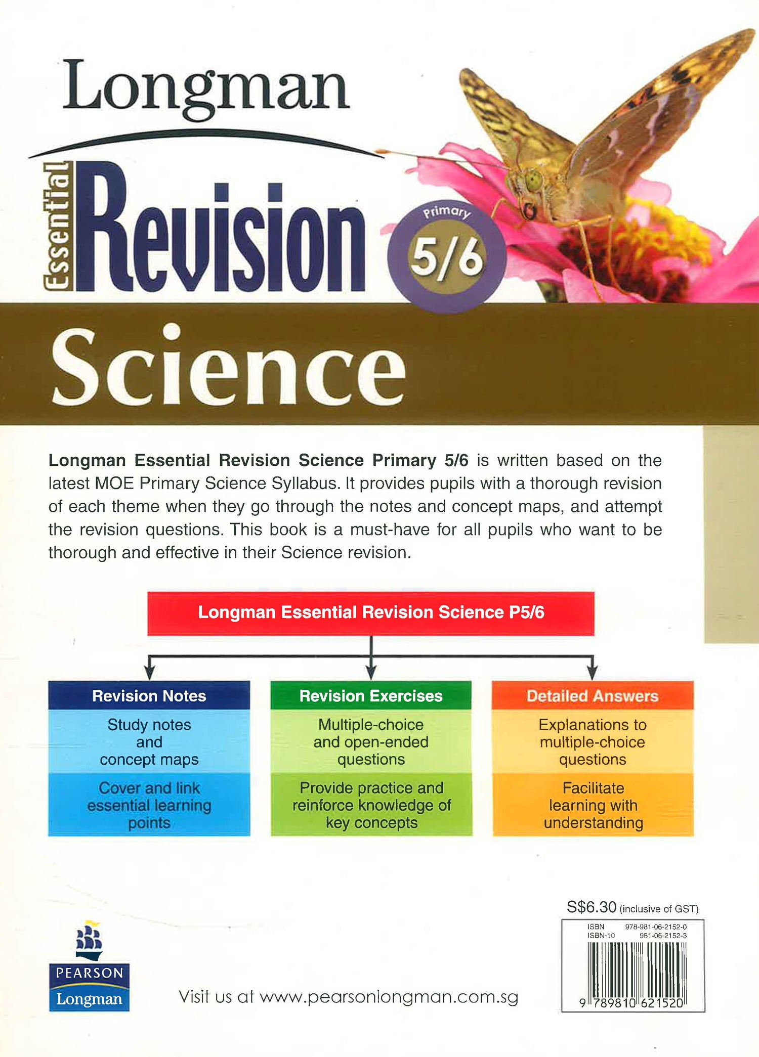 Longman Essential Revision Science Primary 5/6 is written based on the latest MOE Primary Science Syllabus. It provides pupils with a thorough revision of each theme when they go through the notes and concept maps, and attempt the revision questions. This book is a must-have for all pupils who want to be thorough and effective in their Science revision.