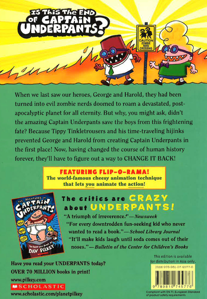 When we last saw our heroes, George and Harold, they had been turned into evil zombie nerds doomed to roam a devastated, postapocalyptic planet for all eternity. But why, you might ask, didn't the amazing Captain Underpants save the boys from this frightening fate? Because Tippy Tinkletrousers and his time-traveling hijinks prevented George and Harold from creating Captain Underpants in the first place! Now, having changed the course of human history forever, they'll have to figure out a way to CHANGE IT BACK.