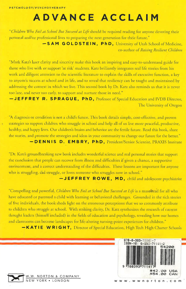 A number of people who failed in school currently enjoy meaningful and successful lives. These include, though by no means are limited to, those with Attention Deficit Hyperactivity Disorder (ADHD), those with executive function challenges, those with learning disabilities, those whose learning and behavioural challenges are linked to traumatic events in their lives; even those impacted by all of the above. What's more, they also include those who enjoyed years of access to excellent special education and mental health services. Up until recently, not much attention was paid to successful people who did poorly in school. Why not? One reason might be that few among us probably realised how many of them are actually out there. But another and even bigger reason might be that many of us doubted that it was actually possible. And those doubts are entirely understandable. After all, think of the thousands of hours parents, teachers and various healthcare professionals spent trying their hardest to help these failing children turn things around in school, sometimes with little or nothing to show for it. And if these children continued to struggle and fail in school with all this help and support, how could they ever succeed in the real world decades later without it? So what did we miss? Why were we so wrong about them? And most important perhaps, how can their life experiences help others avoid or overcome the years of school failure they endured decades ago? In his new book, Mark Katz answers these as well as other questions. Focusing on studies of five people who were considered school failures and drawing on fields such as clinical and social psychology, cognitive neuroscience and education, Katz presents new remedies to prevent learning, behavioural and emotional problems, and reduce juvenile crime, school dropout and substance abuse.
