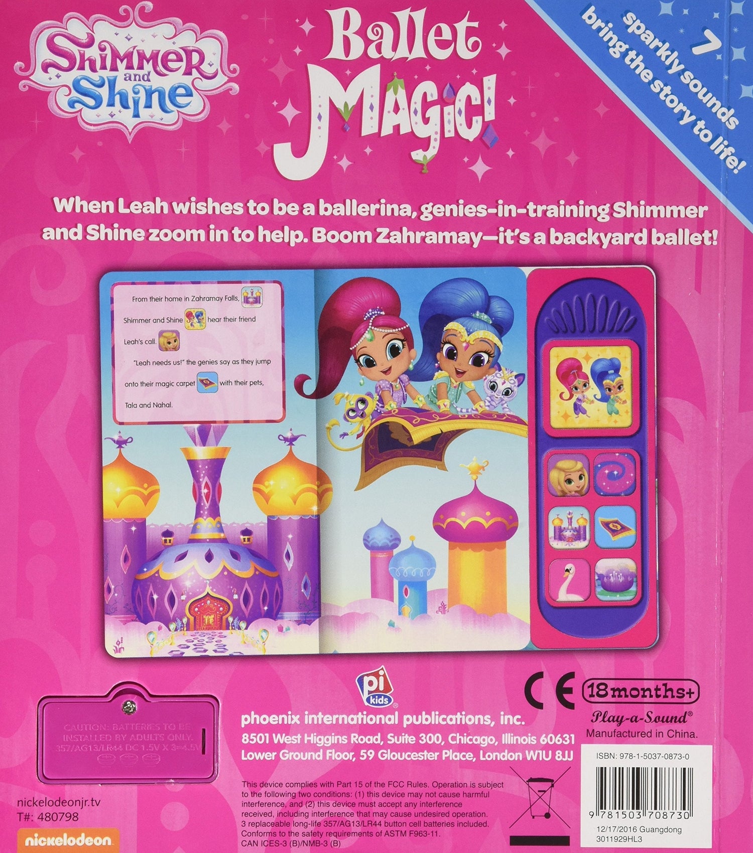 Boom Zahramay - it's a backyard ballet! When Leah wishes to be a ballerina, genies-in-training Shimmer and Shine zoom in to help. While Leah leaps and spins in Swan Lake, press 7 interactive buttons to bring the story to life with sparkly sounds! Matching words with pictures and sounds enhances reading comprehension and connecting with favorite characters engages young readers at story time.