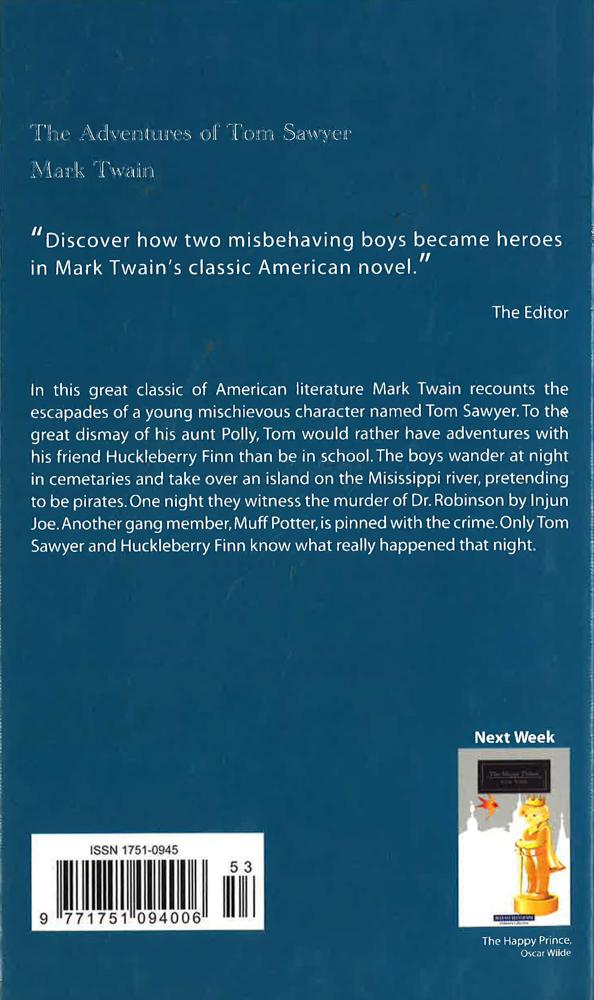 In this great classic of American literature mark Twaain recounts the escapades of a young mischievous character named Tom Sawyer. To the great dismay of his aunt Polly, Tom would rather have adventures with his friend Huckleberry Finn than be in school. The boys wander at night in cemeteries and take over an island on the Misissippi river, pretending to be pirated. One night they witness the murder of Dr. Robinson by Injun Joe. Another gang member, Muff Potter, is pinned with the crime. Only Tom Sawyer and Huckleberry Finn know what really happened that night. *This book may have minor shelfwear.