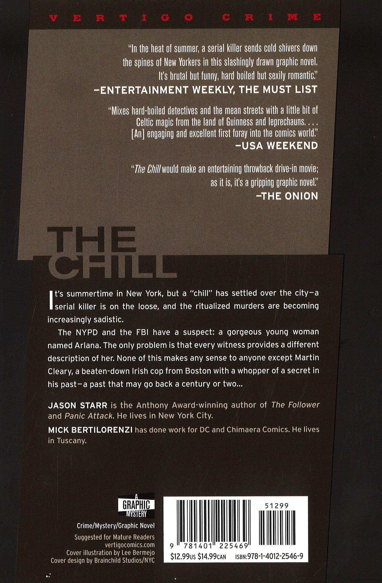 Written by JASON STARR Art by MICK BERTILORENZI Cover by LEE BERMEJO "Brutal but funny, hard-boiled but sexily romantic." - Entertainment Weekly "THE CHILL would make an entertaining throwback drive-in movie; as it is, it's a gripping graphic novel." - The Onion AV Club A modern thriller set in New York City, and now in trade paperback, THE CHILL is steeped in Irish mythology. A broken-down cop tracks a seductive killer who possesses the supernatural - and very deadly - power known as "The Chill." It's a power that provides her eternal life by absorbing the sexual energy of her victims. And he may be the next victim . . . On sale JANUARY 12 * 192 pg, B&W, 5.5" x 8"