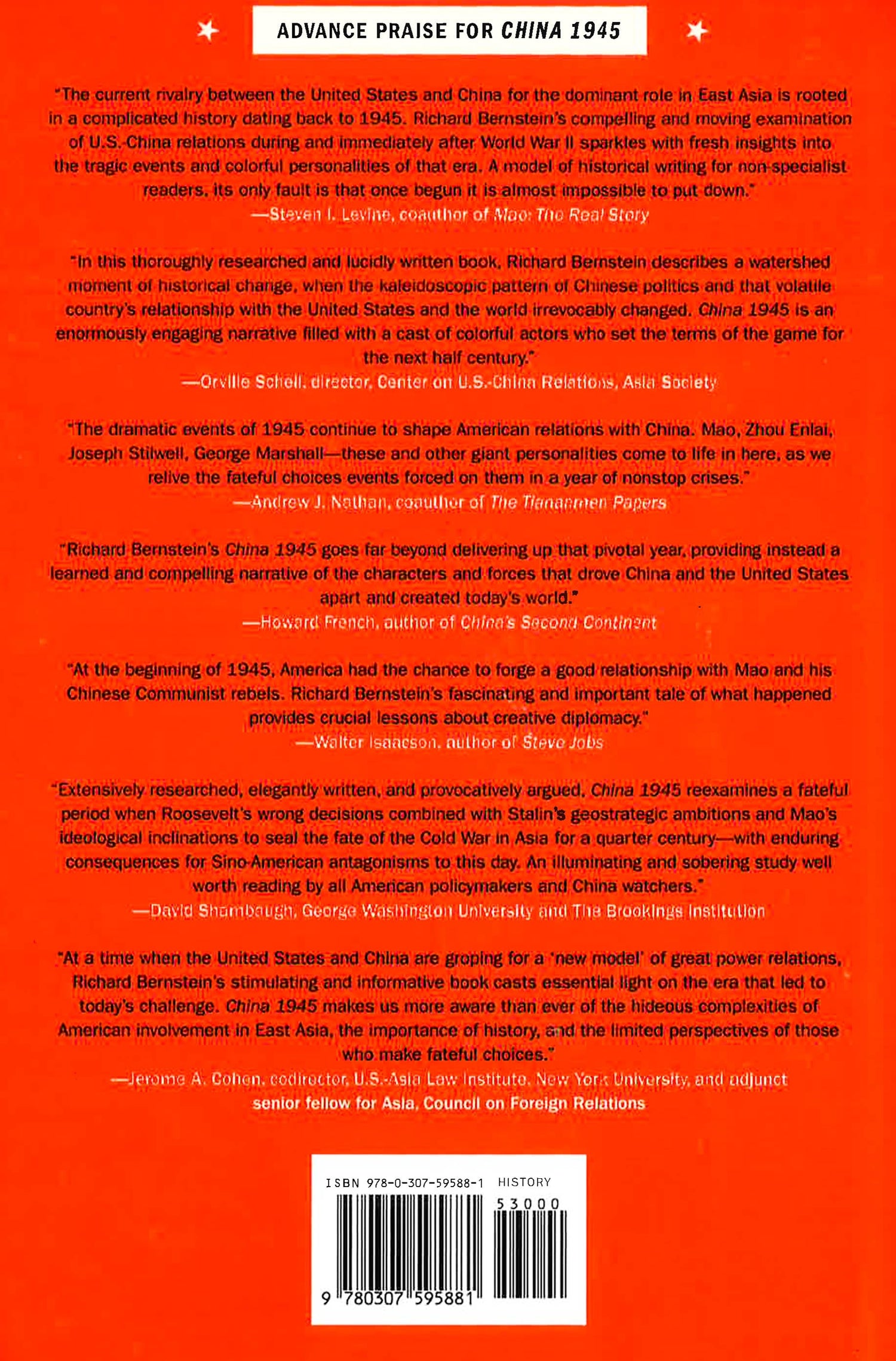 A riveting account of a watershed moment in history: when America's struggles with the despotic Chiang Kai-shek and the manipulative, ascendant Mao Zedong altered the course of East-West relations. As 1945 opened, America was on surprisingly congenial terms with Mao and his Communist rebels. But by year's end Communist diplomacy had all but frozen and America was resigned to unqualified support for China's Allied leader, General Chiang Kai-Shek, despite growing certainty that Mao was China's heir apparent-a political allegiance whose consequences would echo down the subsequent decades, most violently in the form of the Korean and Vietnam wars. What happened? Richard Bernstein brilliantly analyzes the many components of that year's sea change, from ideological infighting among U.S. diplomats, military leaders, and opinion makers, to Mao's opportunistic presentations of identity and ambition, to China's status as the crucible of a new world order, in which Soviet influence and intention were increasingly clearly manifest. Bernstein challenges familiar assumptions about the origins of modern Sino-American paradigms and meaningfully considers whether things could have turned out differently.