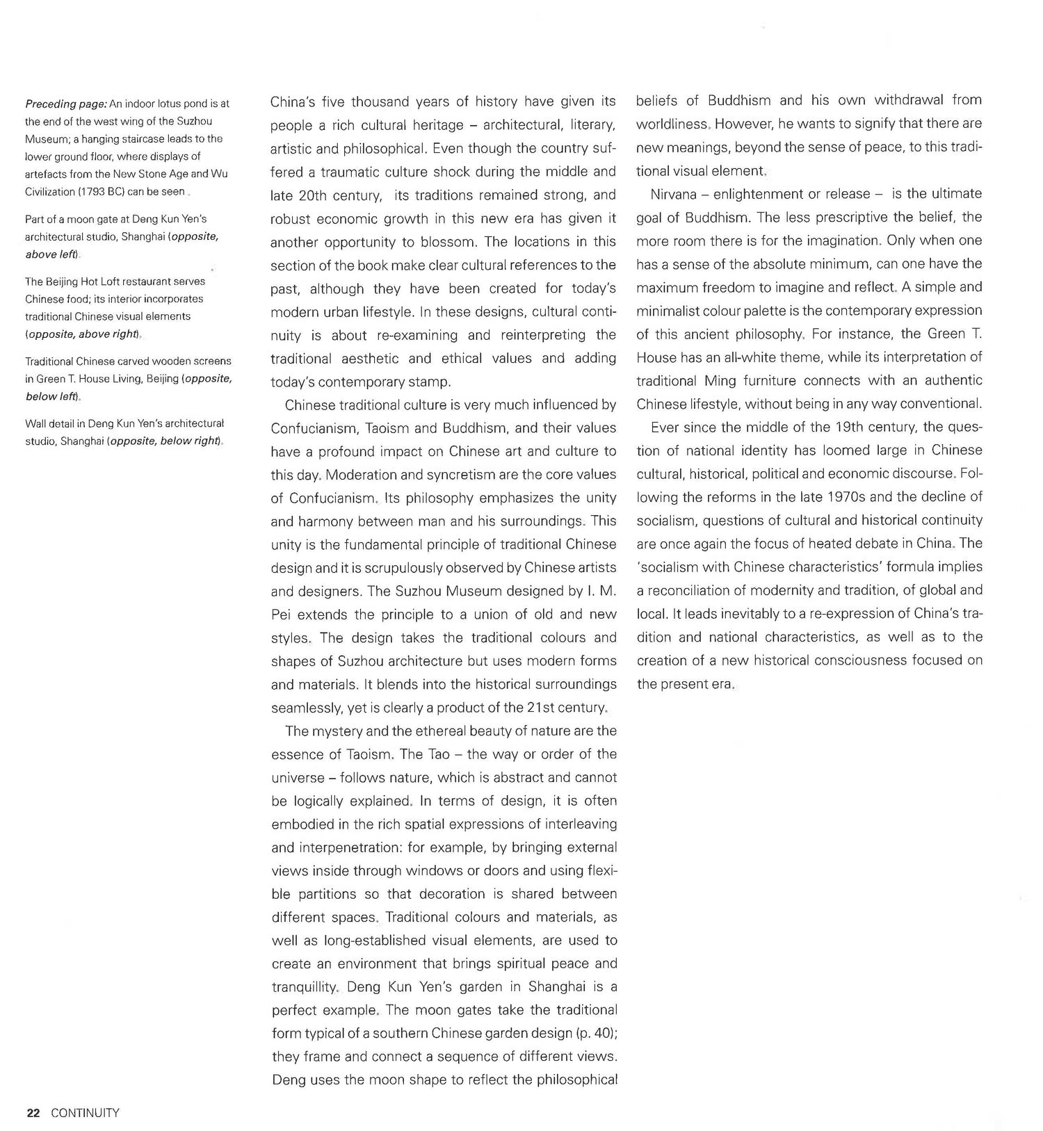 China is booming not only in the shape of a rapidly growing economy, but also in the decorative and fine arts, in interior design and in architecture. This book showcases 36 of the most exciting interiors that have been born of this second cultural revolution. Some of the structures have taken the traditional Chinese vernacular and reinvigorated it, while others show a distinctly western influence. But whatever the emphasis of their design principles, all the buildings and interiors have a distinctive air of visual excitement and vibrancy, and all are utterly contemporary.