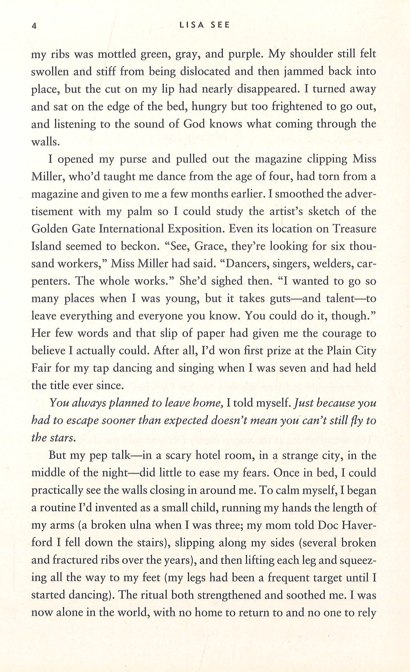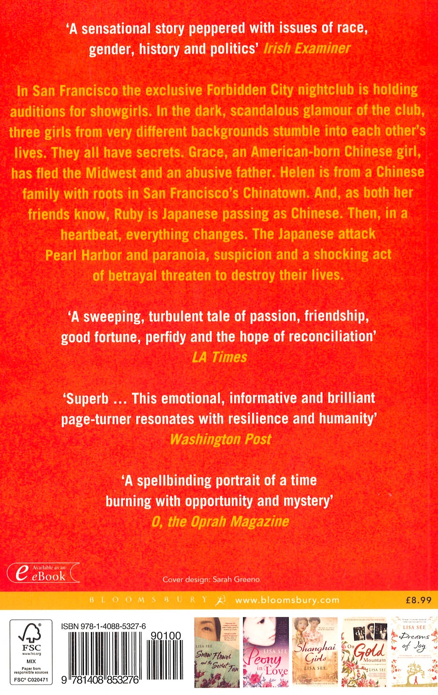 It's 1938 and the exclusive Oriental nightclub in San Francisco's Forbidden City is holding auditions for showgirls. In the dark, scandalous glamour of the club, three girls from very different backgrounds stumble into each other lives. All the girls have secrets. Grace, an American-born Chinese girl, has fled the Midwest and an abusive father. Helen is from a Chinese family which has deep roots in San Francisco's Chinatown. And, as both her friends know, Ruby is Japanese passing as Chinese. Then, in a heartbeat, everything changes. The Japanese attack Pearl Harbor and paranoia, suspicion, and a shocking act of betrayal, threaten to destroy their lives.