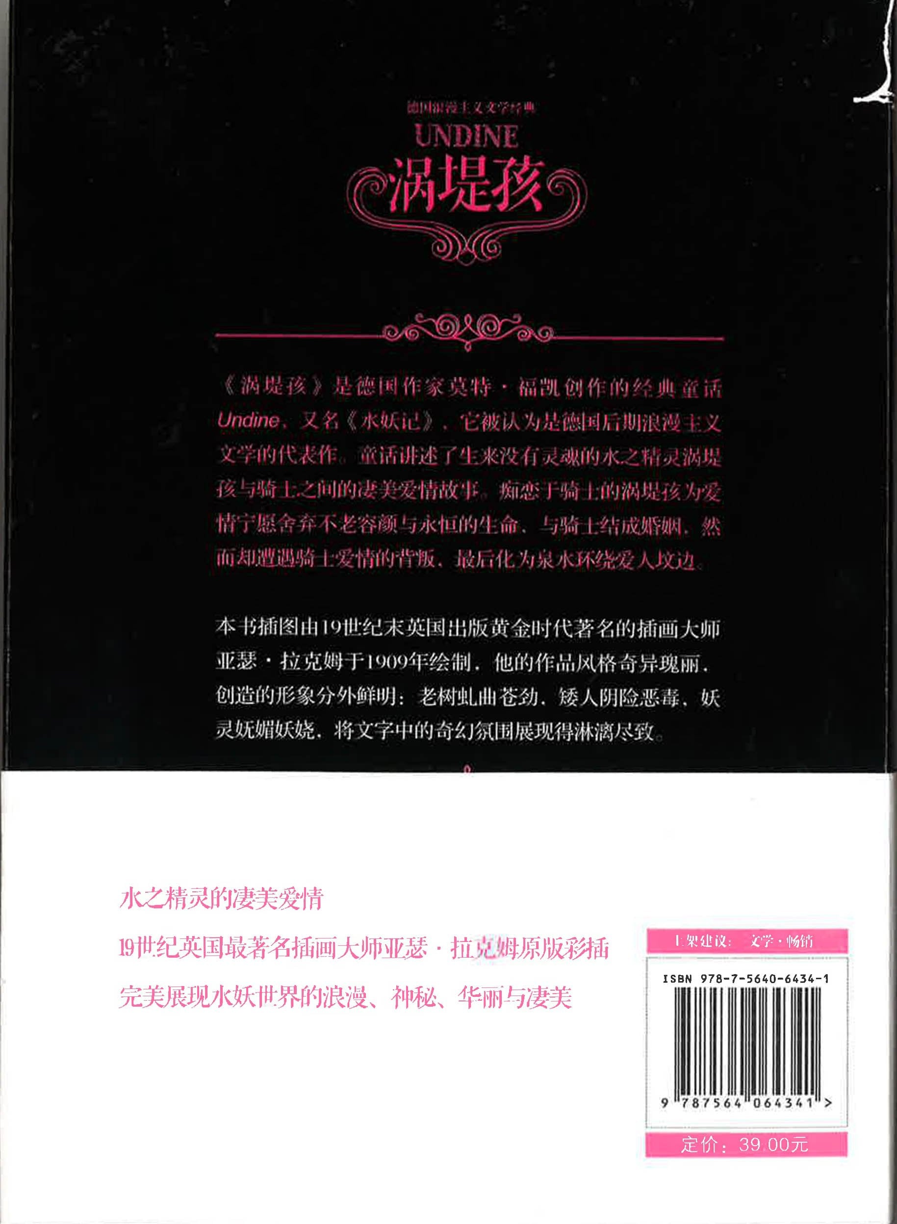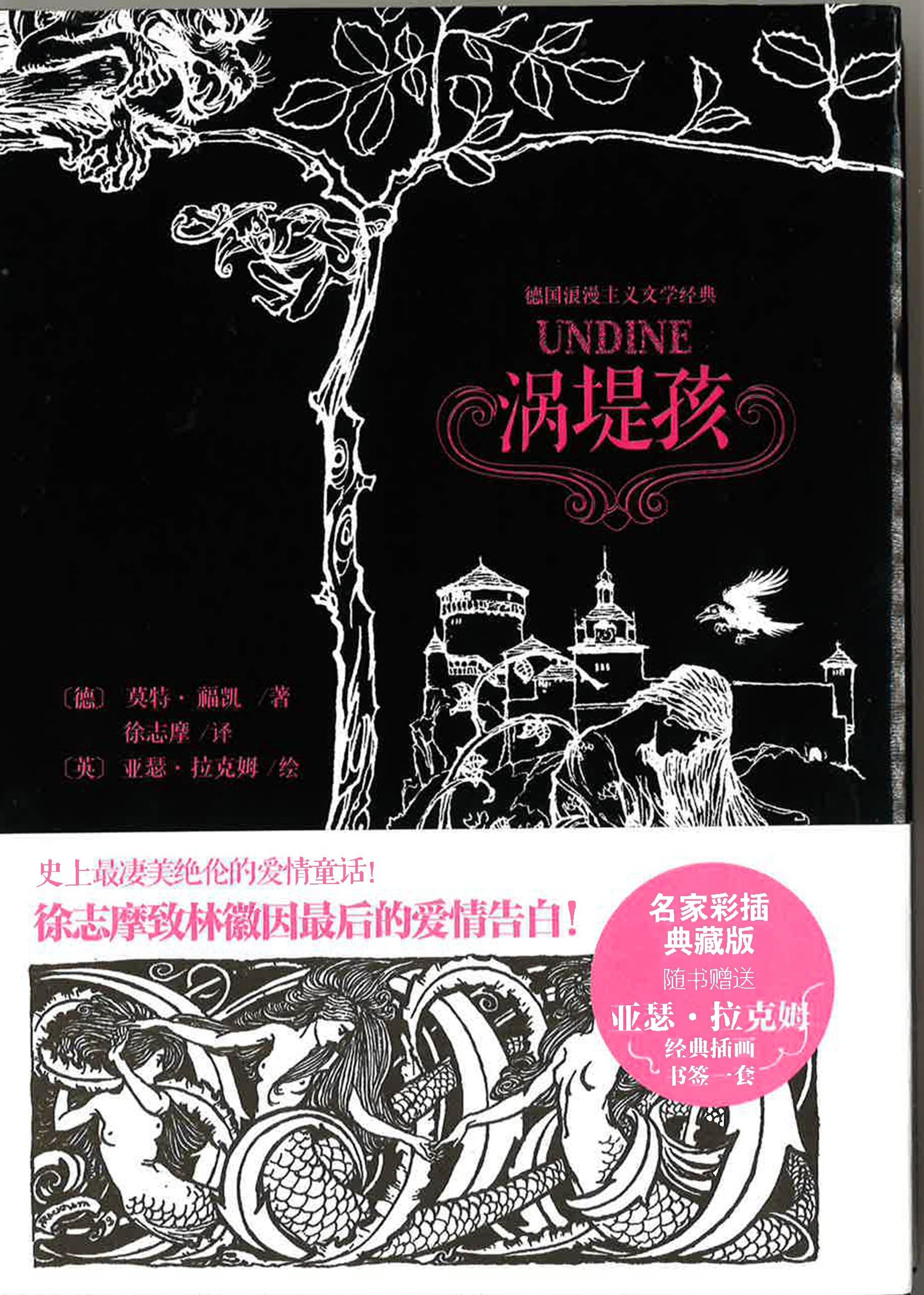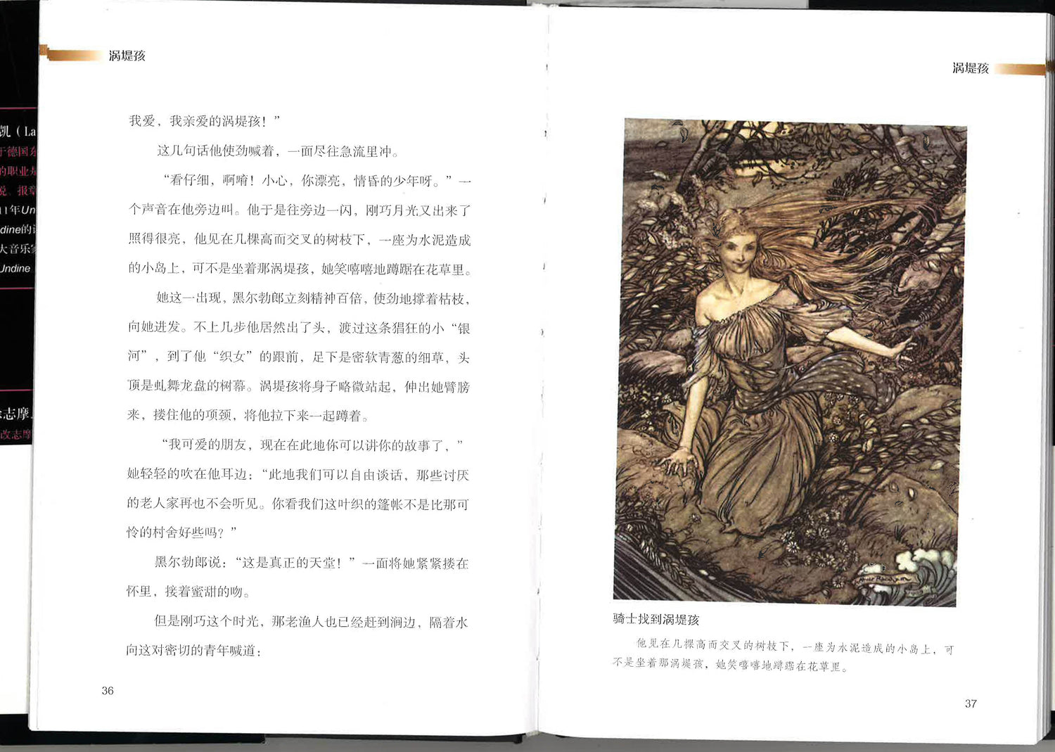《涡堤孩》德国作家莫特·福凯创作的经典童话Undine,又名《水妖记》,它被认为是德国后期浪漫主义文学的代表作。童话讲述了生来没有灵魂的水之精灵涡堤孩与骑士之间的凄美爱情故事。痴恋于骑士的涡堤孩为爱情宁愿舍弃不老容颜与永恒的生命,与骑士结成婚姻,然而却遭遇骑士爱情的背叛,最后化为泉水环绕爱人坟边。