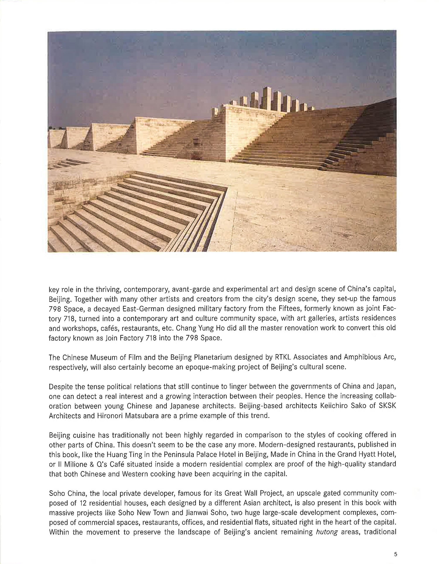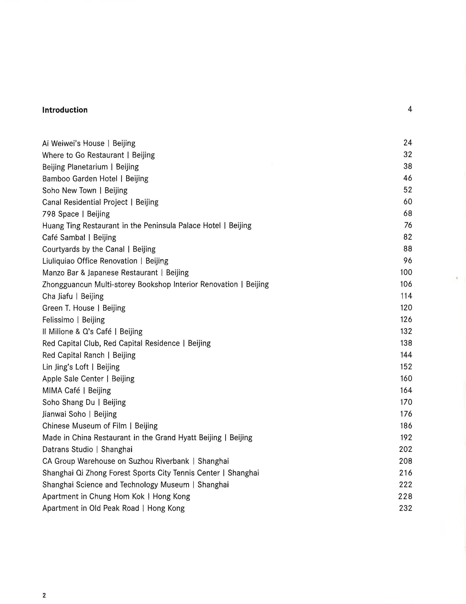 In this book Chinese Design, we are pleased to introduce a wide array of different architectural projects, and the various designers, architectural ateliers and developers that have made these works come to light. The distribution of the book has been done in three chapters according to the three main geographical areas - Beijing, Shanghai, and Hong Kong - where most of these projects are located. A fourth chapter covers the architectural projects located in other parts of the Chinese mainland. Like the Great Wall, which with its 2.400 km is the only built structure on earth visible from outer space, China is so huge and profound, that to make an attempt to analyse its design is practically impossible. The basic principle, however, that seemed to influence space design in China was related to a number of different philosophies like Confucianism, Taoism or Fengshui. Although nowadays, in general, people do not really like being bound by ancient tradition, still most of them follow, or at least cannot ignore, that Fengshui laws of space direction or some other philosophies. China's complex, harsh and hazardous history partly explains one of the reasons why many residential houses and buildings look often like solid fortresses, with its inner space clearly separated and differentiated from the outer part of the house. Inside the house compound, the patio serves not only as a source of visual delight, but it is used also for outdoor inner living throughout the various seasons of the year. Finally we would like to introduce a few distinctisyve examples of iconography in China, symbologie that plays a very important role within Chinese design. Colours like red, aside form being the colour of the Chinese national flag, have signified fortune and luck, since ancient times. Visually, sometimes it seems as if every single city of the country lies under the overriding spell of the Chinese character script. China's extraordinary appetite for the new was certainly a powerful driving force for its rapid change. The end product is as somewhat general retrofuristic urban landscape spreading all over its cities.