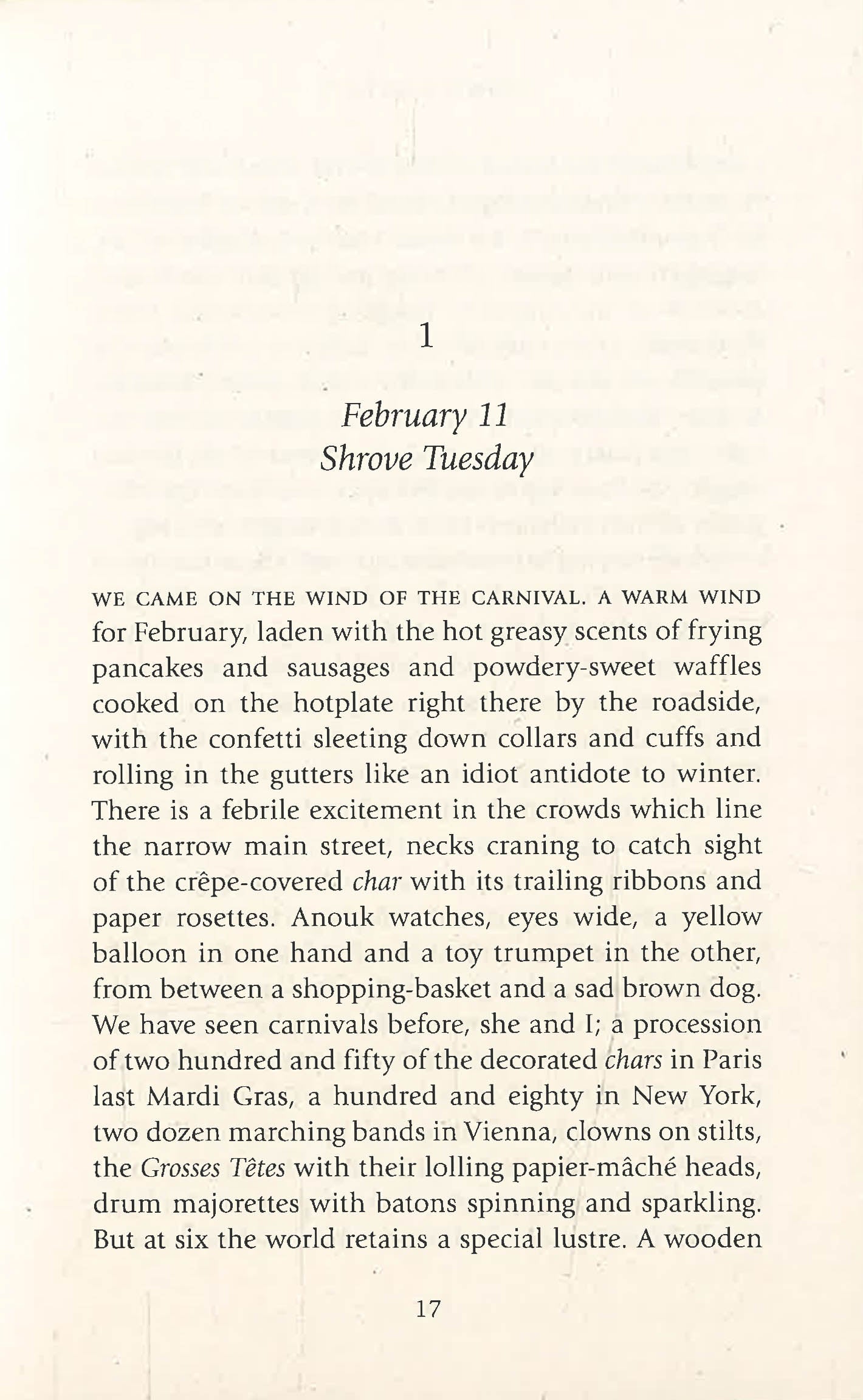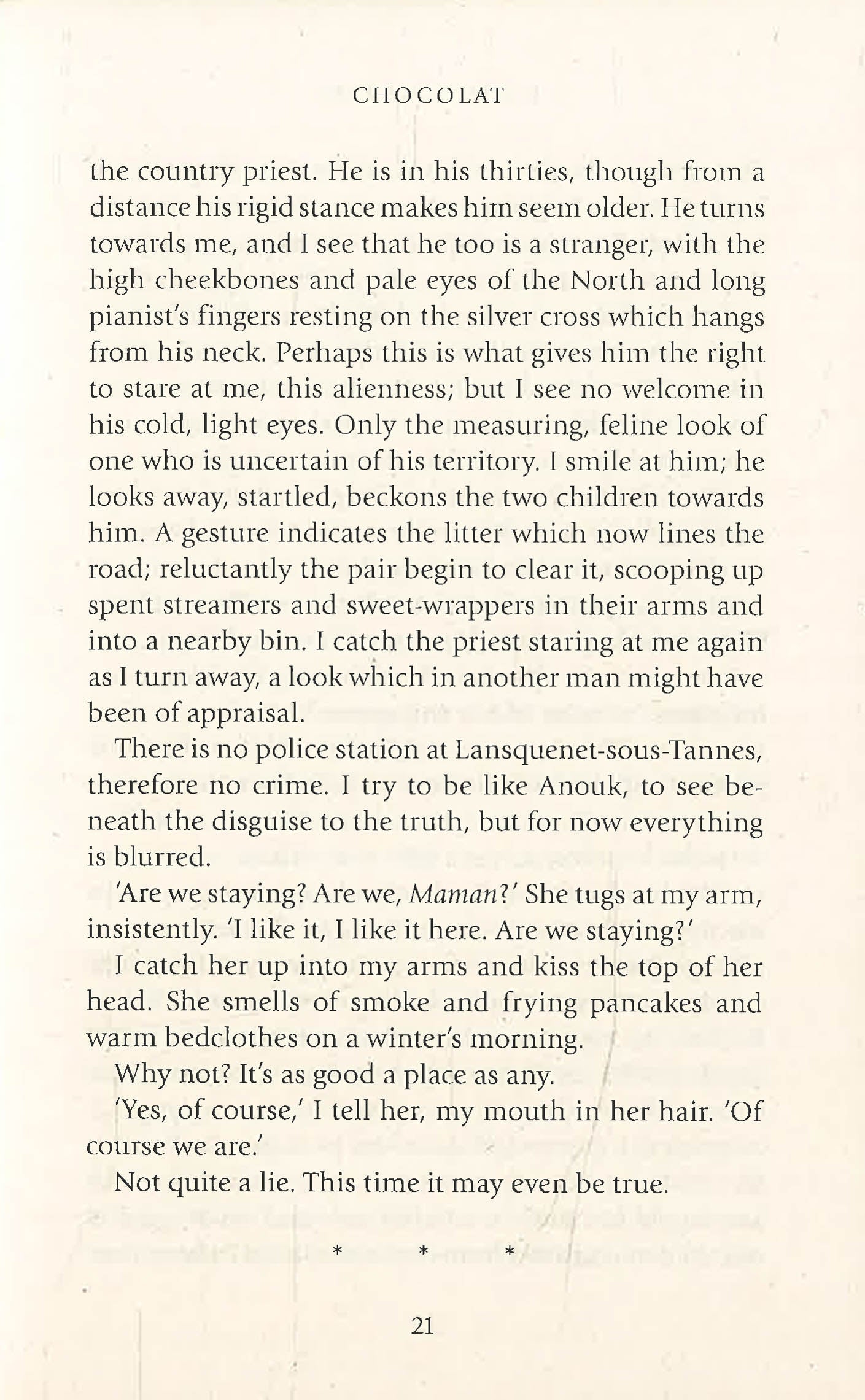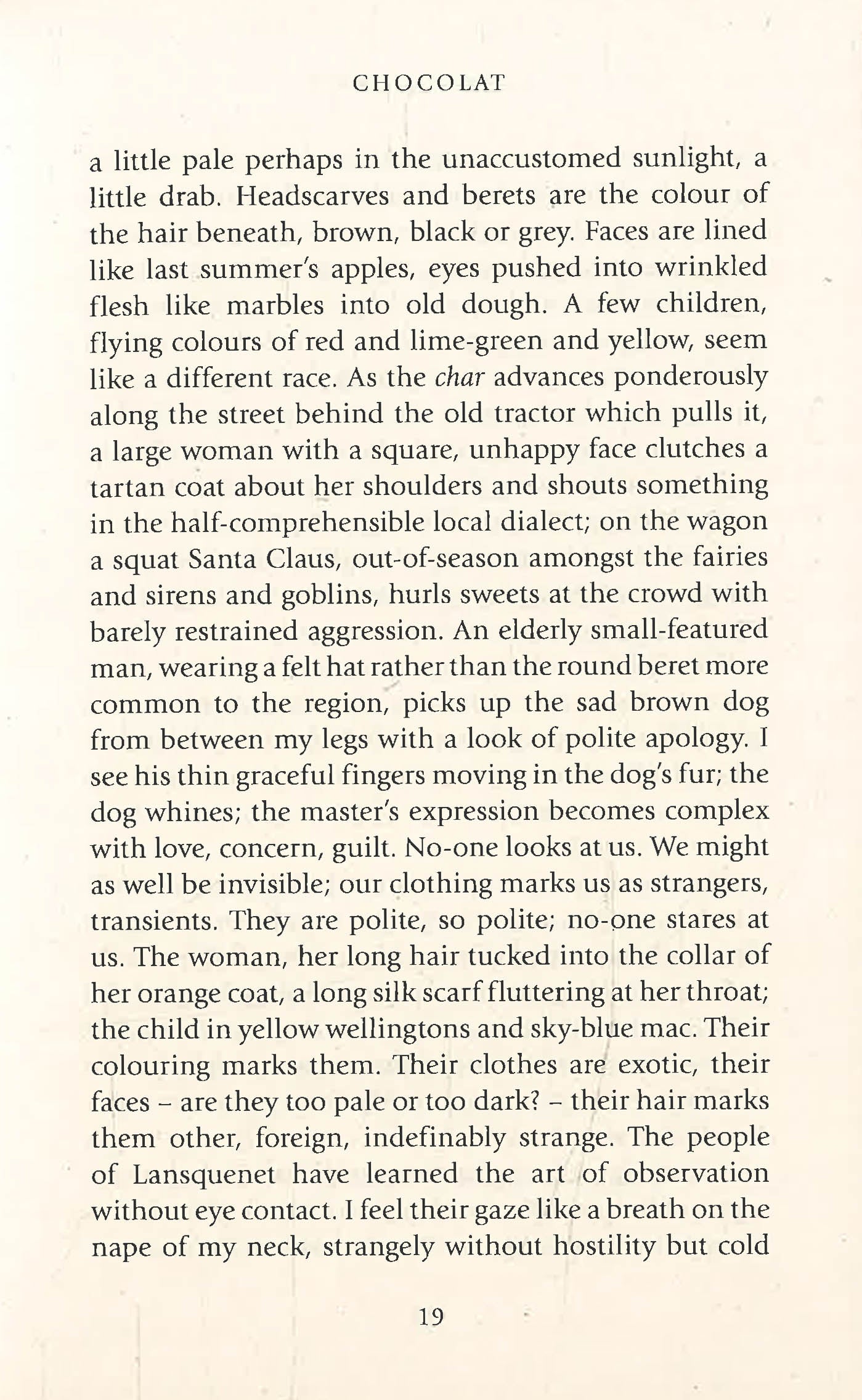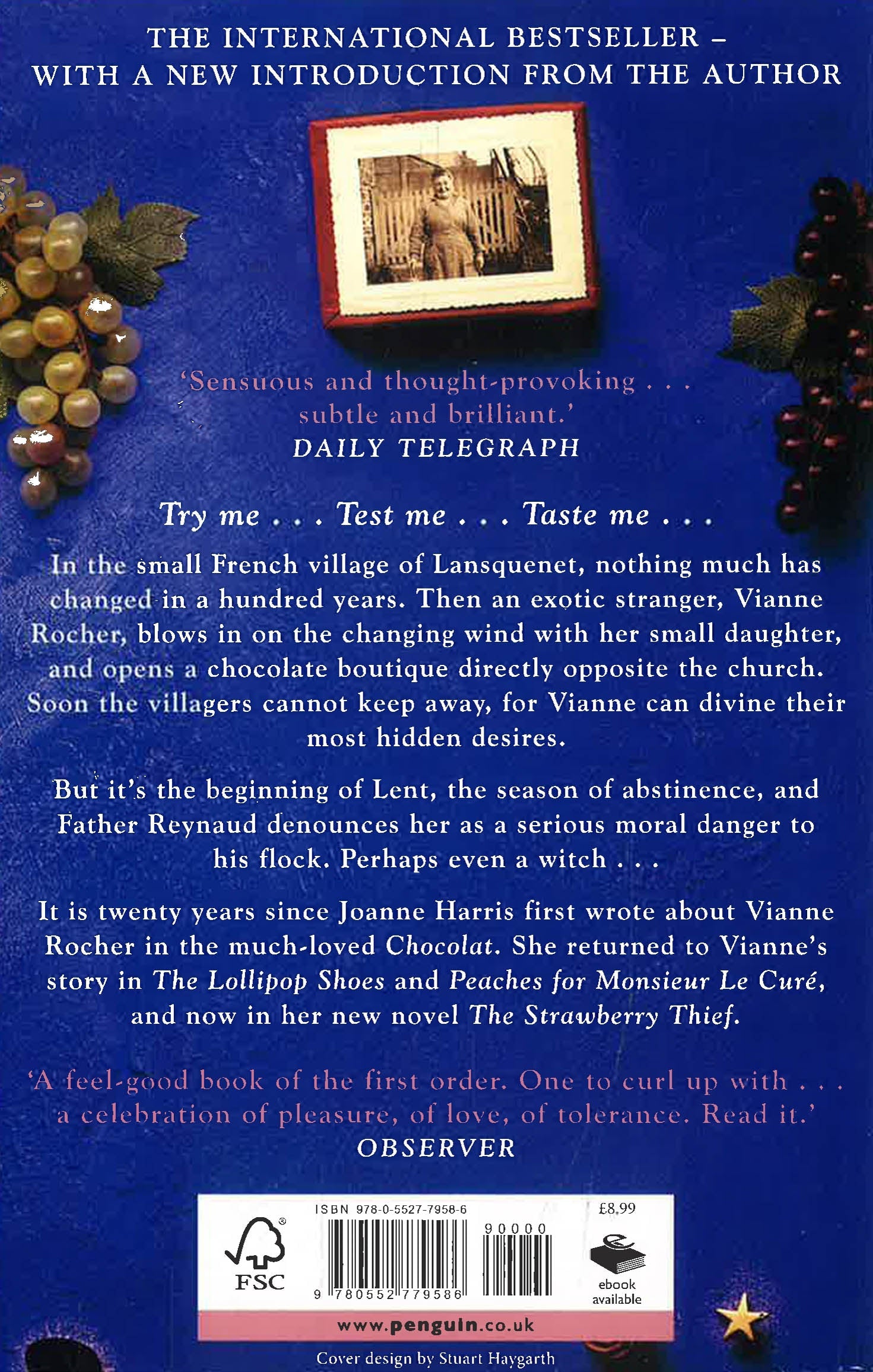 Suddenly Vianne's shop-cum-cafe means that there is somewhere for secrets to be whispered, grievances to be aired, dreams to be tested. But Vianne's plans for an Easter Chocolate Festival divide the whole community in a conflict that escalates into a "Church not Chocolate" battle. As mouths water in anticipation, can the solemnity of the Church compare with the pagan passion of a chocolate eclair?