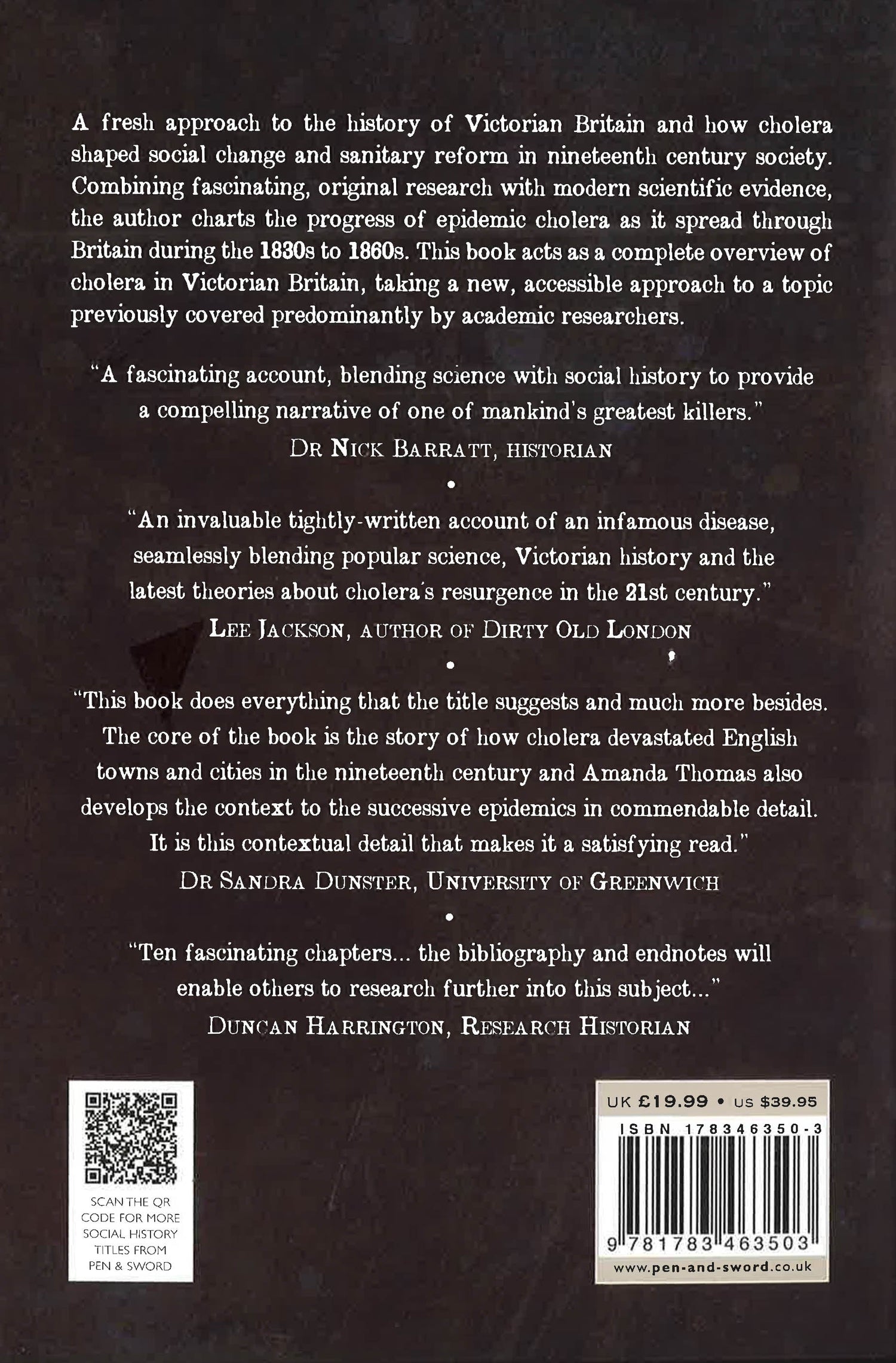 Discover the story of the disease that devastated the Victorian population, and brought about major changes in sanitation. Drawing on the latest scientific research and a wealth of archival material, Amanda Thomas uses firsthand accounts, blending personal stories with an overview of the history of the disease and its devastating after effects on British society. This fascinating history of a catastrophic disease uncovers forgotten stories from each of the major cholera outbreaks in 1831-3, 1848-9, 1853-4 and 1866. Amanda Thomas reveals that Victorian theories about the disease were often closer to the truth than we might assume, among them the belief that cholera was spread by miasma, or foul air.