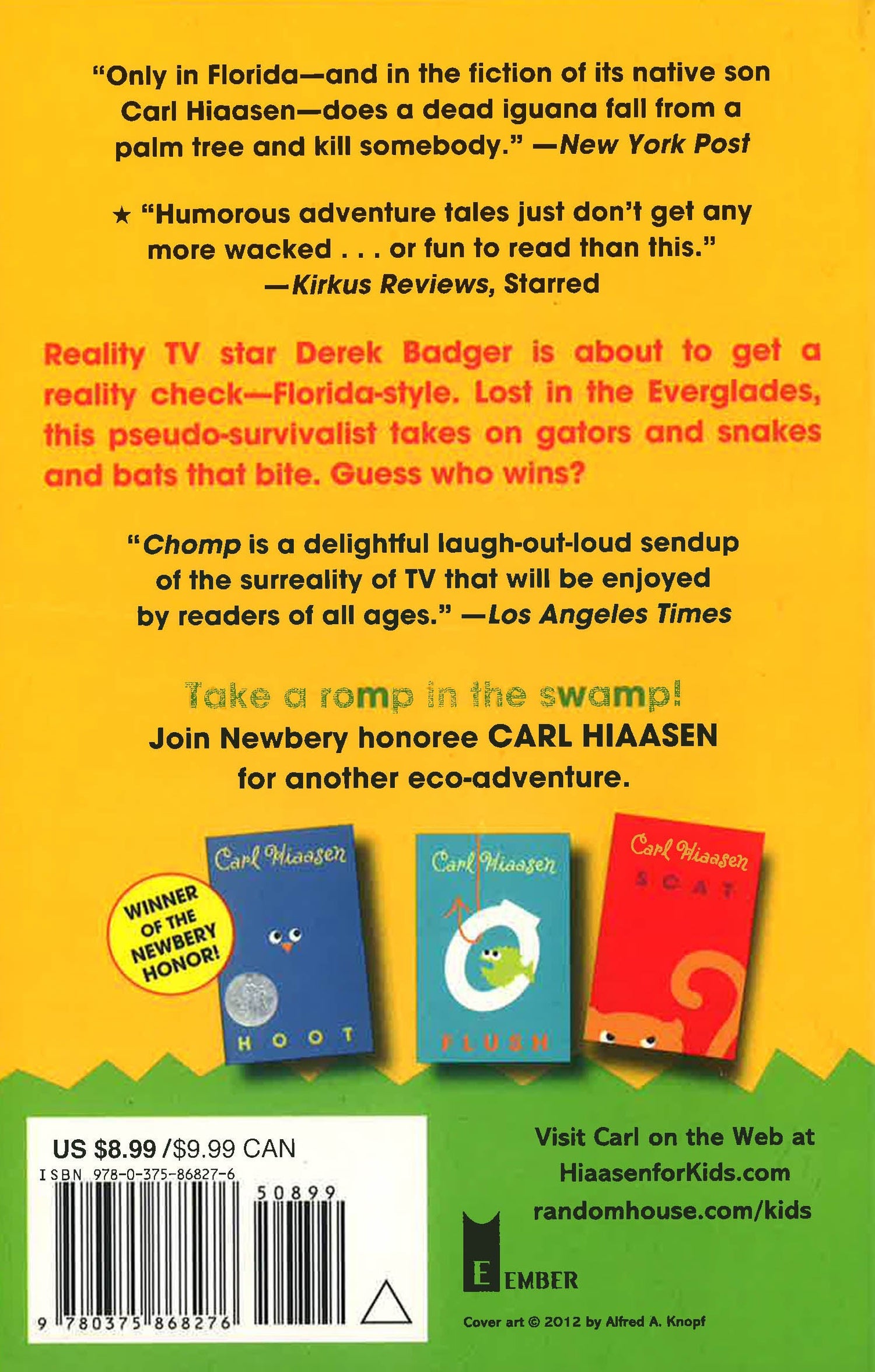 The hysterical #1 New York Times bestseller from Newbery honoree Carl Hiaasen featuring gators, snakes, bats that bite, and reality show hosts gone wild! When Wahoo Cray's dad--a professional animal wrangler--takes a job with a reality TV show called Expedition Survival!, Wahoo figures he'll have to do a bit of wrangling himself to keep his father from killing Derek Badger, the show's inept and egotistical star. But the job keeps getting more complicated: Derek Badger insists on using wild animals for his stunts; and Wahoo's acquired a shadow named Tuna--a girl who's sporting a shiner courtesy of her father and needs a place to hide out. They've only been on location in the Everglades for a day before Derek gets bitten by a bat and goes missing in a storm. Search parties head out and promptly get lost themselves. And then Tuna's dad shows up with a gun . . . It's anyone's guess who will actually survive Expedition Survival. . . "Only in Florida--and in the fiction of its native son Carl Hiaasen--does a dead iguana fall from a palm tree and kill somebody." --New York Post "Chomp is a delightful laugh-out-loud sendup of the surreality of TV that will be enjoyed by readers of all ages." --Los Angeles Times "Chomp shines in its humorous, subtle tweaks on pop culture. . . . The real satisfaction, however, is not so much in the book's humor but in its truth." --Time Out Chicago Kids