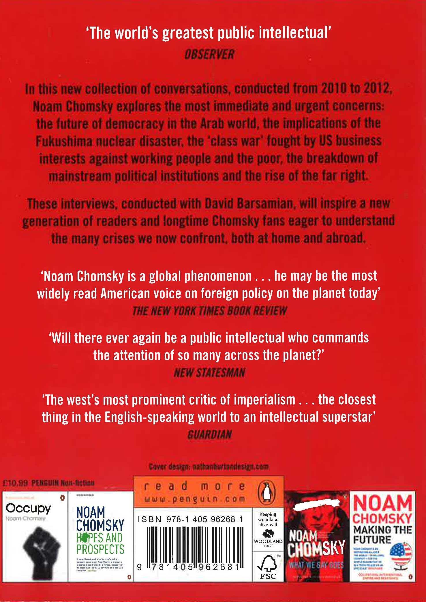 In this new collection of conversations, conducted from 2010 to 2012, Noam Chomsky explores the most immediate and urgent concerns: the future of democracy in the Arab world, the implications of the Fukushima nuclear disaster, the 'class war' fought by U.S. business interests against working people and the poor, the breakdown of mainstream political institutions and the rise of the far right.