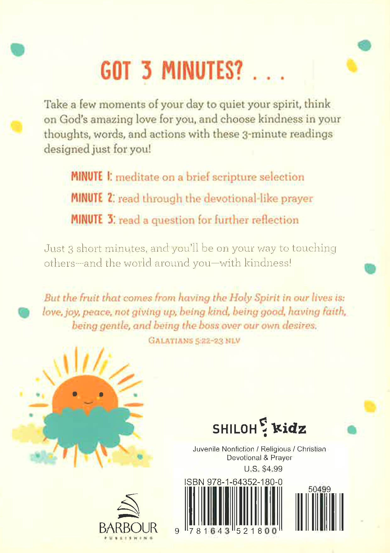 You'll love this delightful devotional that encourages the kids in your life, ages 8 and up, to take a few moments of their day to quiet their spirits, think on God's amazing love for them, and to choose kindness in their thoughts, words, and actions. Dozens of just-right-sized readings pack a powerful dose of comfort, encouragement, and inspiration and are designed to meet kids right where they are in life. Minute 1: meditate on a scripture selection; Minute 2: read through a devotional-like prayer created just for kids; Minute 3: read a question for further reflection. In only 3 short minutes, young hearts will be on their way to touching others--and the world around them--with kindness!