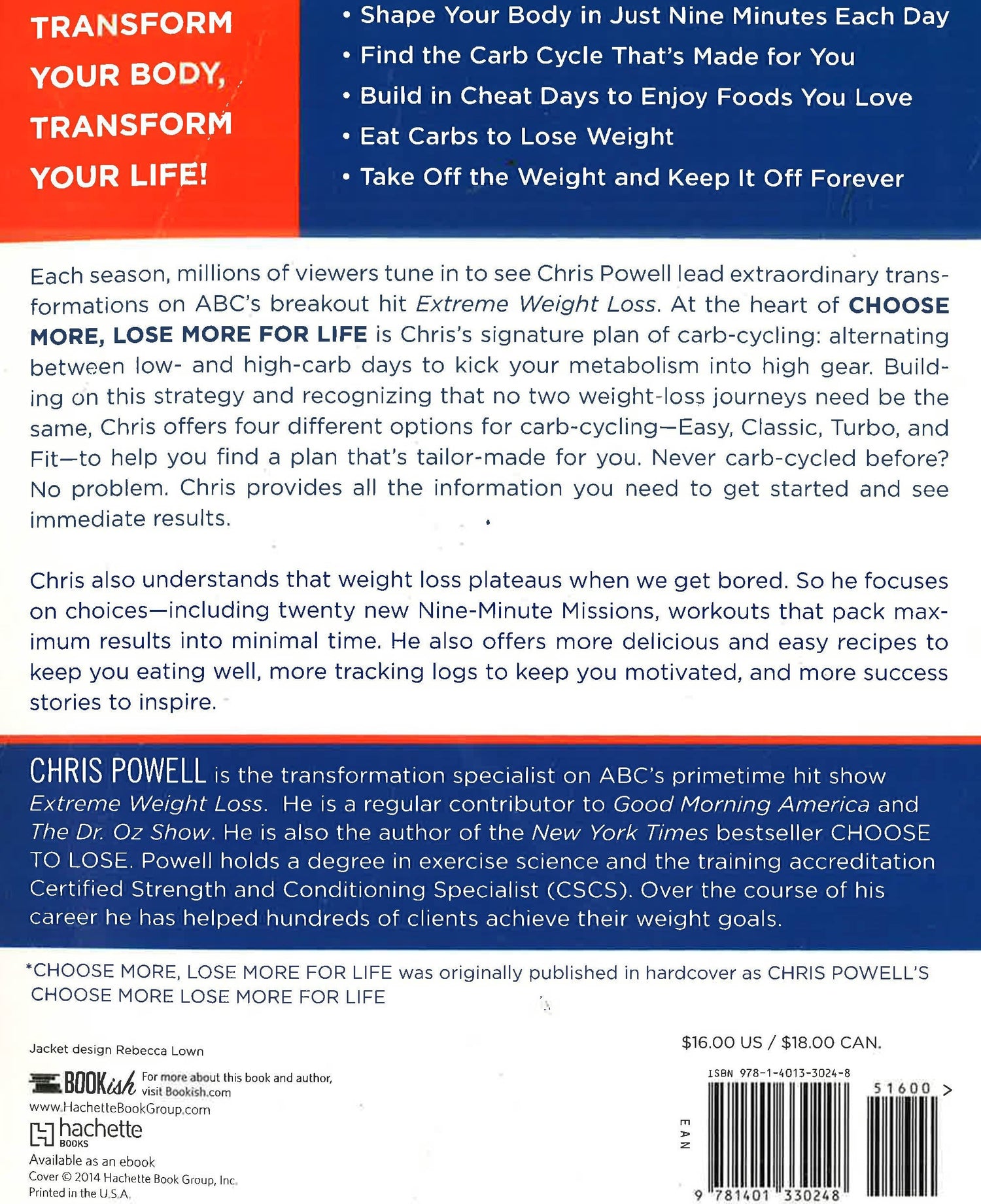 Transform Your Body, Transform Your Life! Each season, millions of viewers tune in to see Chris Powell lead extraordinary transformations on ABC's breakout hit reality-transformation show, Extreme Weight Loss. Now, building on the basic weight-loss philosophy introduced in his bestselling book Choose to Lose, Chris has created a transformation plan anyone can follow--one that recognizes that no weight-loss journey is the same, and that more options mean longer-lasting results. At the center of Chris Powell's Choose More, Lose More for Life is Chris's carb-cycling plan, which kicks your metabolism into full gear by alternating between low- and high-carb days. Never carb-cycled before? No problem. Powell provides all the information you need to get started and see immediate results. Been carb-cycling but need to shake things up? This book provides four different cycles--Easy, Classic, Turbo, and Fit--to help you find a plan that fits you. Chris also understands that weight loss plateaus when we get bored. So in this book, he focuses on choices--including more than twenty new workouts called Nine-Minute Missions--that pack maximum results into minimal time. He also offers more delicious and easy recipes to keep you eating well, more tracking logs to keep you motivated, and more success stories to inspire you as you write your own--one that lasts for the rest of your life!