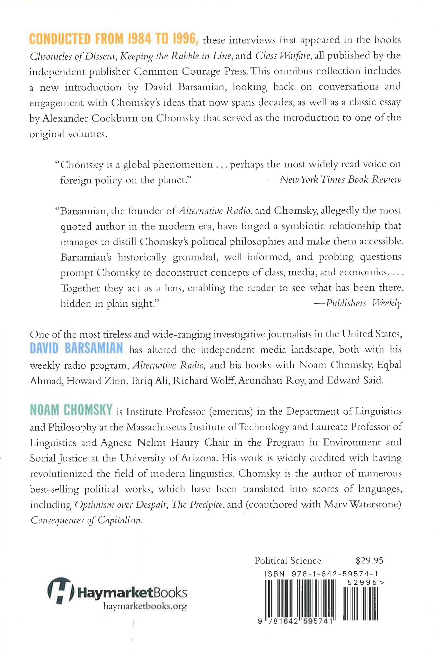 Conducted from 1984 to 1996, these interviews first appeared in the books Chronicles of Dissent, Keeping the Rabble in Line, and Class Warfare, all published by the independent publisher Common Courage Press in Monroe, Maine.