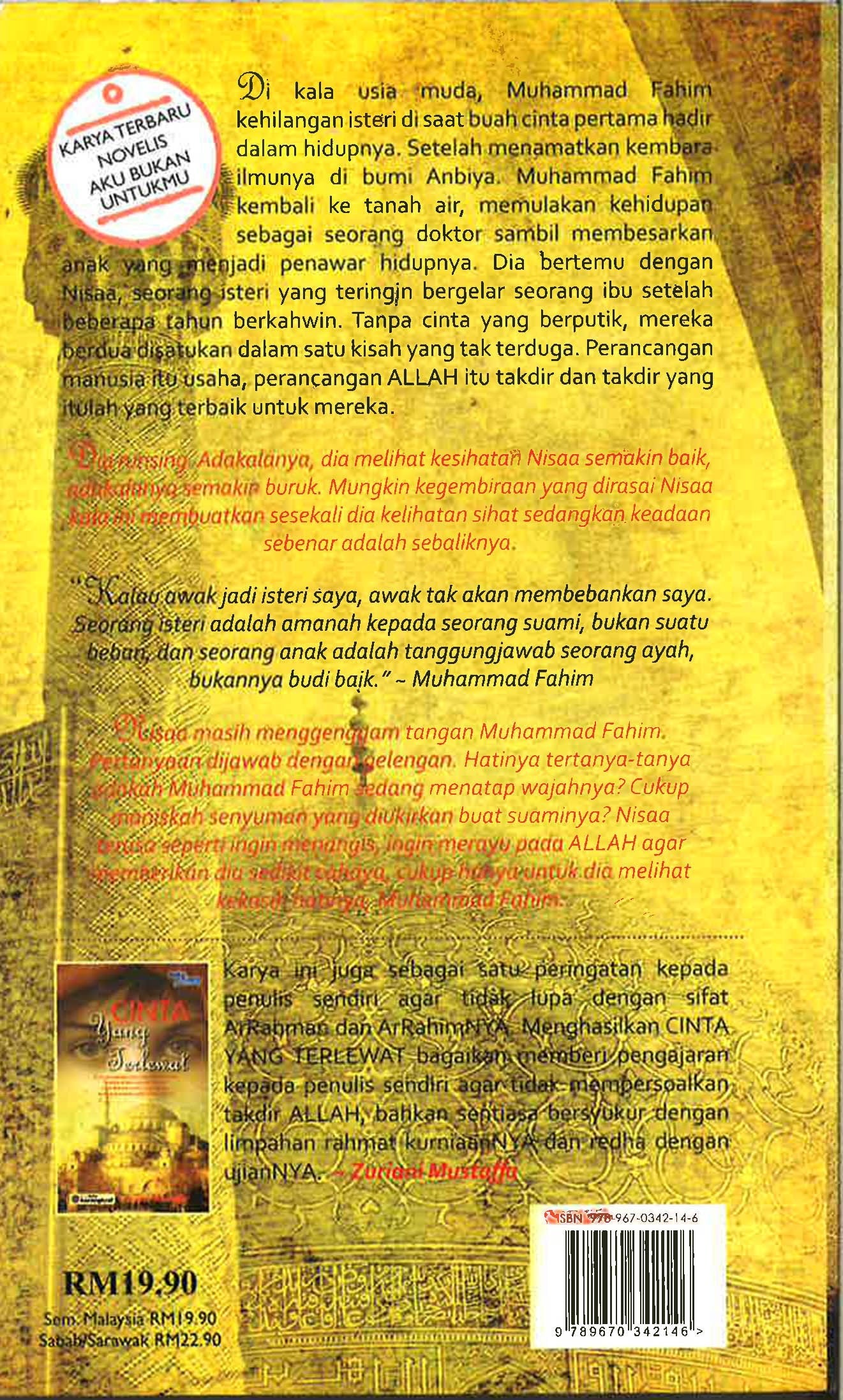 Di kala usia muda, Muhammad Fahim kehilangan isteri di saat buah cinta pertama hadir dalam hidupnya. Setelah menamatkan kembara ilmunya di bumi Anbiya. Muhammad Fahim kembali ke tanah air, memulakan kehidupan sebagai seorang doktor sambil membesarkan anak yang menjadi penawar hidupnya. Dia bertemu dengan Nisaa, seorang isteri yang teringin bergelar seorang ibu setelah beberapa tahun berkahwin. Tanpa cinta yang berputik, mereka berdua disatukan dalam satu kisah yang tak terduga. Perancangan manusia itu usaha, perancangan ALLAH itu takdir dan takdir yang itulah yang terbaik untuk mereka.3