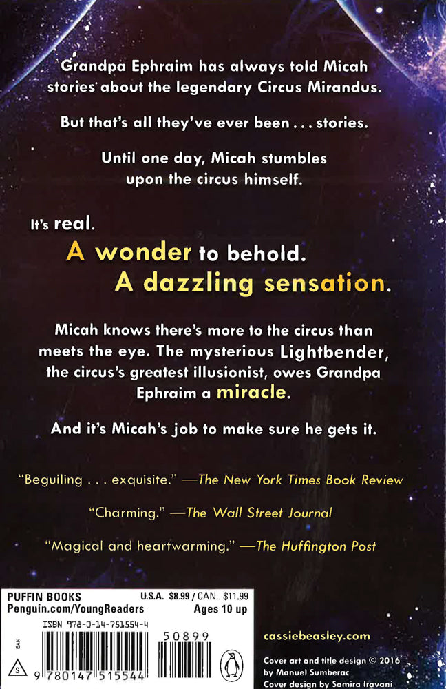 Even though his awful Great-Aunt Gertrudis doesn't approve, Micah believes in the stories his dying Grandpa Ephraim tells him of the magical Circus Mirandus: the invisible tiger guarding the gates, the beautiful flying birdwoman, and the magician more powerful than any other--the Man Who Bends Light. Finally, Grandpa Ephraim offers proof. The Circus is real. And the Lightbender owes Ephraim a miracle. With his friend Jenny Mendoza in tow, Micah sets out to find the Circus and the man he believes will save his grandfather. The only problem is, the Lightbender doesn't want to keep his promise. And now it's up to Micah to get the miracle he came for.