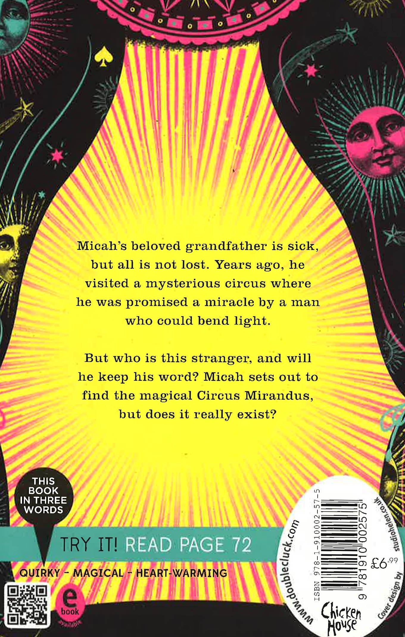 Micah's beloved grandfather is gravely sick, but all is not lost. Years ago, his grandfather visited a mysterious circus where he was promised a miracle by a man who could bend light. But who is this stranger, will he keep his promise, and does the magical Circus Mirandus really exist?