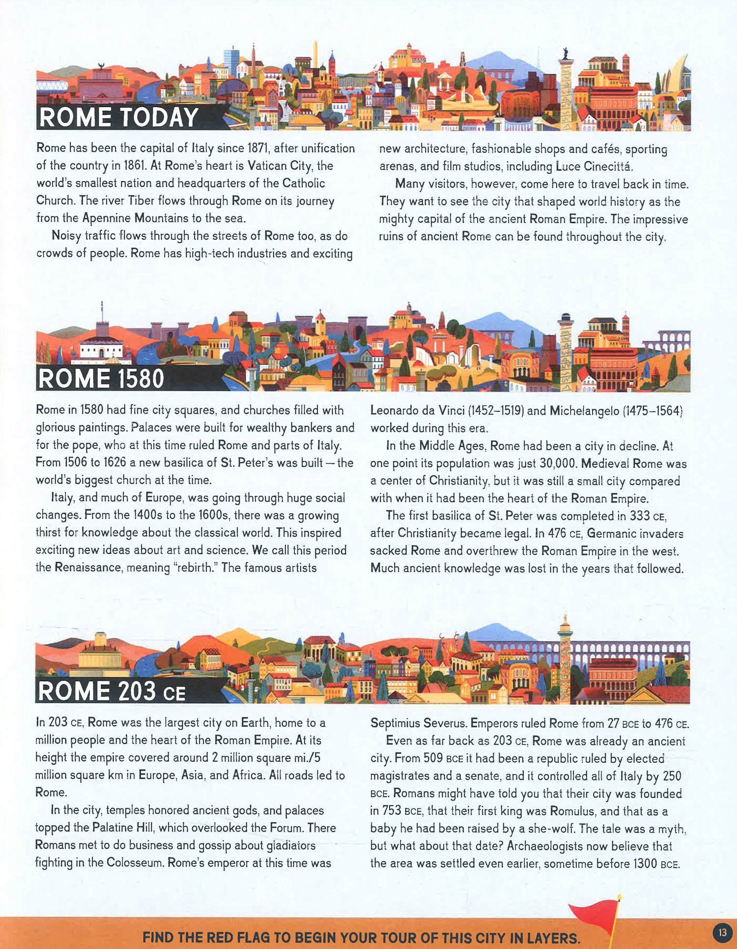 In Cities in Layers: Six Famous Cities Through Time, six major world cities are shown at different stages throughout history. A clever die-cut element allows readers to really peel back layers of time.