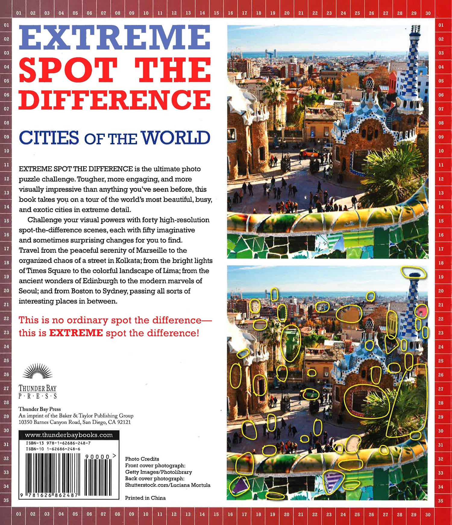 Metropolitan challenges for the discerning eye. Take a look--a close look--at the world's most beautiful cityscapes, from Mumbai to Manhattan, and everywhere in between. Cities of the World: Extreme Spot the Difference features forty-two stunning images of these metropolitan wonders. Designed to challenge experienced "spot-the-difference" puzzlers, these seemingly identical side-by-side photos contain nearly 100 incongruities each. From an obvious firework added to one skyline, to a tricky-to-spot now-you-see-it-now-you-don't bridge in the mid-ground of Manhattan, each find brings the puzzle closer to completion. The perfect mental challenge to keep brain synapses firing, Cities of the World: Extreme Spot the Difference even includes a unique and reusable spotter's grid that lies overtop the pages and can be written on and erased, keeping the beautiful images pristine and ready to be used time and time again.