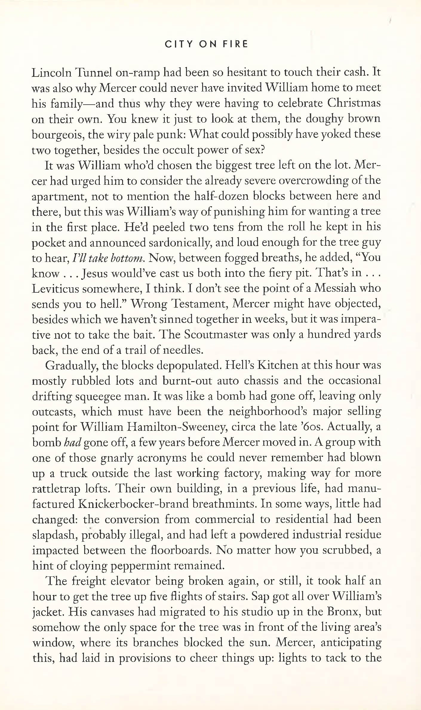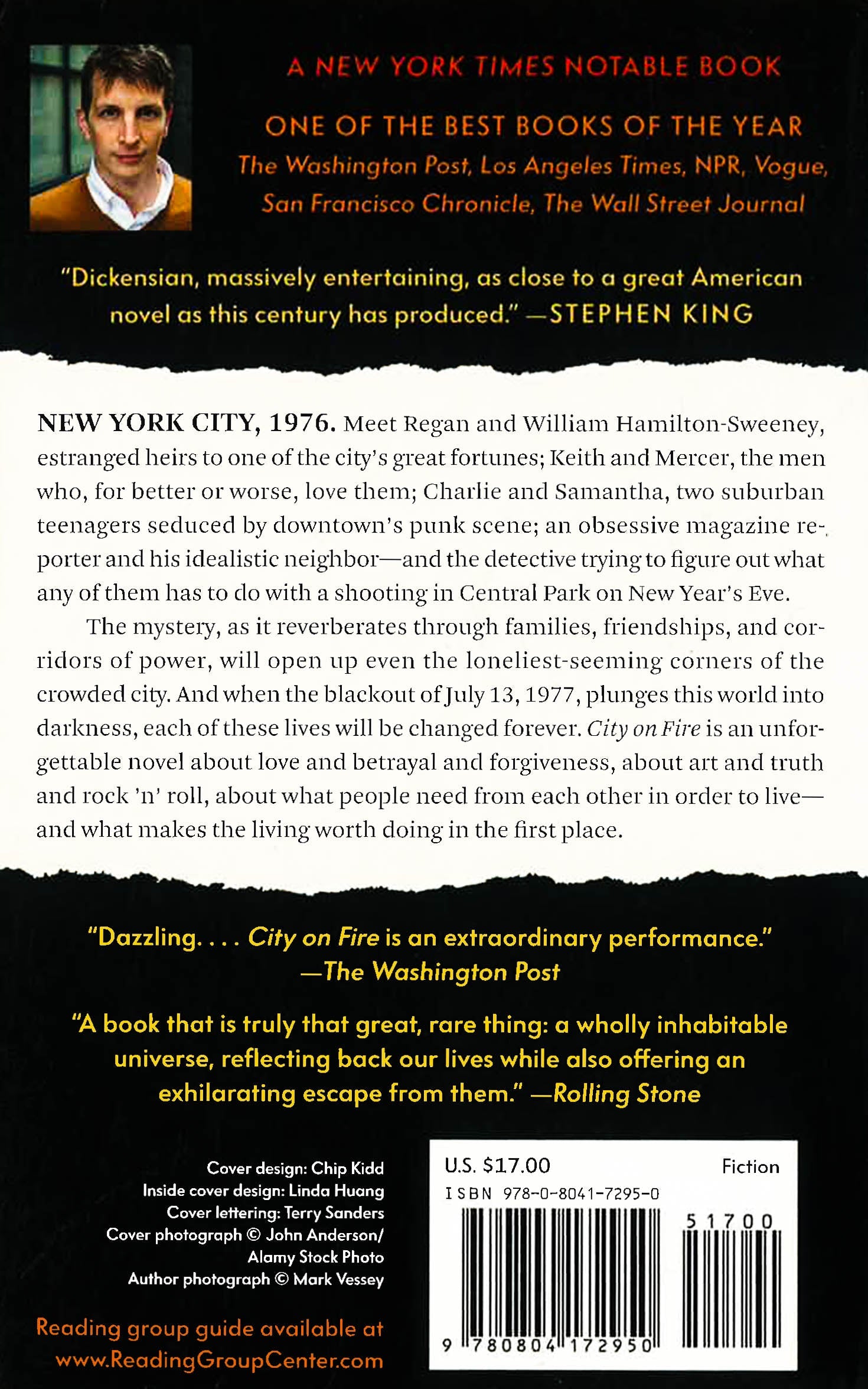 A novel of head-snapping ambition and heart-stopping power?a novel that attests to its young author?s boundless and unflagging talents.? ?Michiko Kakutani, New York Times New York City, 1976. Meet Regan and William Hamilton-Sweeney, estranged heirs to one of the city?s great fortunes; Keith and Mercer, the men who, for better or worse, love them; Charlie and Samantha, two suburban teenagers seduced by downtown?s punk scene; an obsessive magazine reporter and his idealistic neighbor?and the detective trying to figure out what any of them have to do with a shooting in Central Park on New Year?s Eve. The mystery, as it reverberates through families, friendships, and the corridors of power, will open up even the loneliest-seeming corners of the crowded city. And when the blackout of July 13, 1977, plunges this world into darkness, each of these lives will be changed forever. City on Fire is an unforgettable novel about love and betrayal and forgiveness, about art and truth and rock ?n? roll: about what people need from each other in order to live . . . and about what makes the living worth doing in the first place.