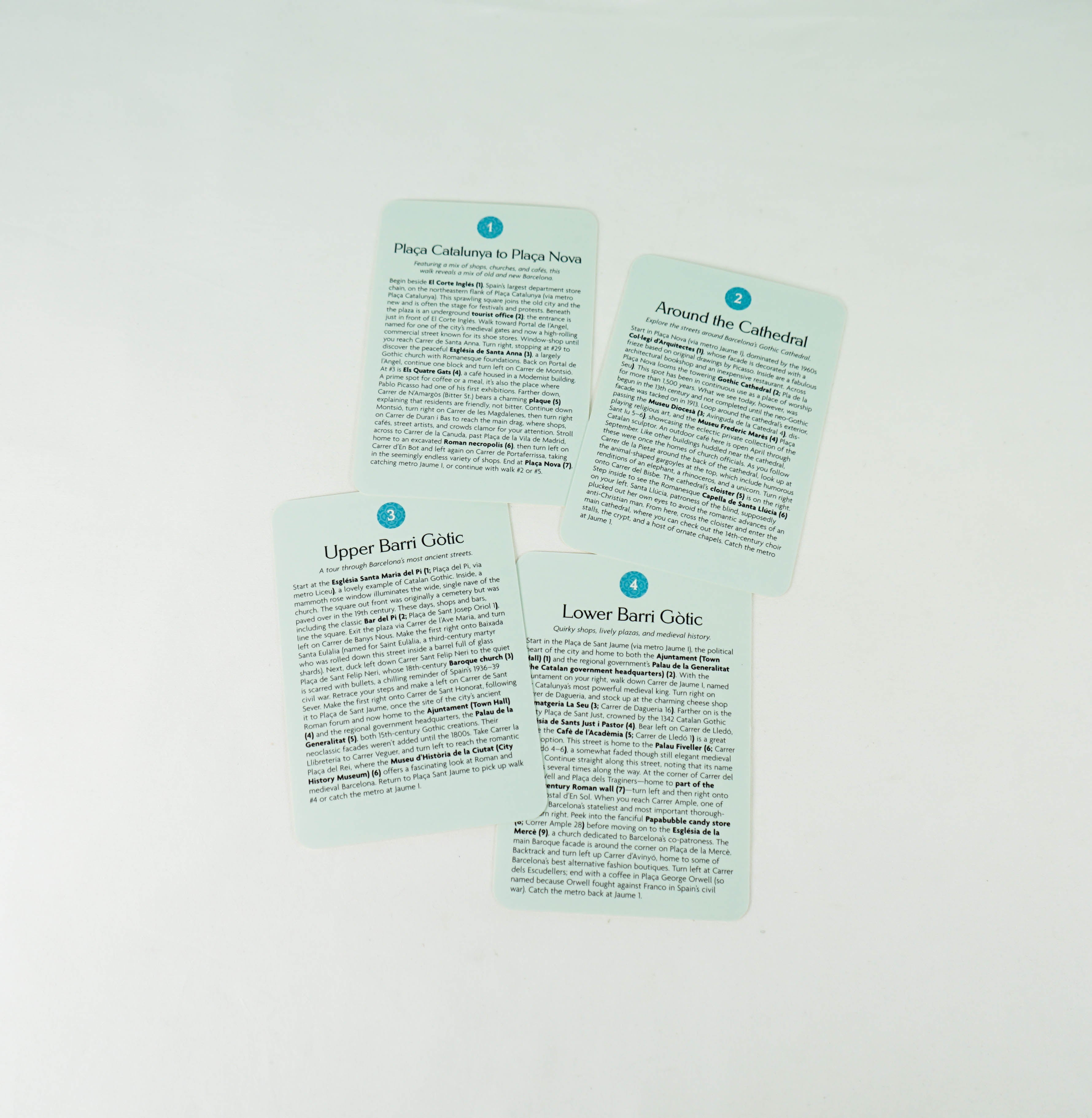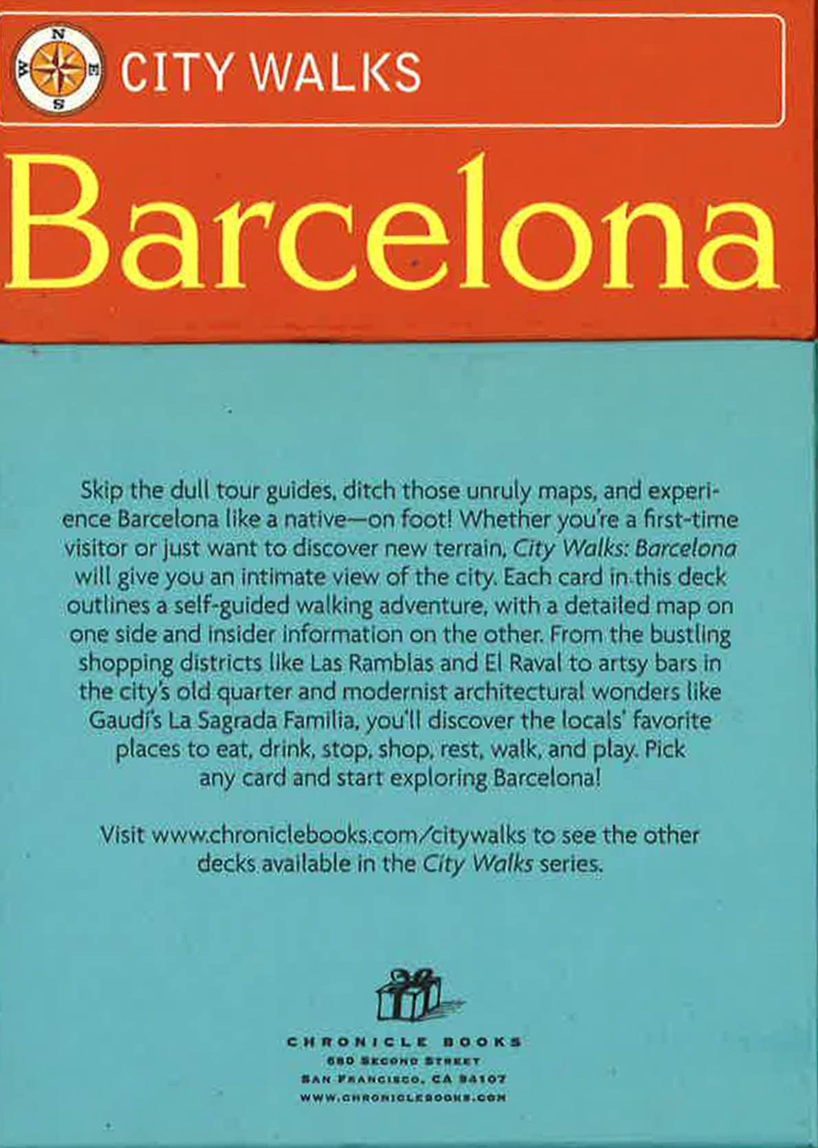 Perfect for both first time and returning tourists, the "City Walks Deck: Barcelona" offers an intimate view of the city. Each card in this deck outlines a self-guided walking adventure, with a detailed map on one side and insider information on the other. Noteworthy sites and attractions are numbered on both sides of the cards for easy reference. Details on and suggestions for using public transportation, information on local history and customs, and an overview map of the city are also included on a handy intro card.