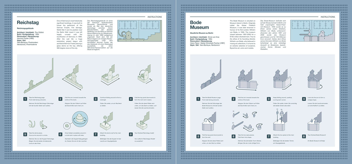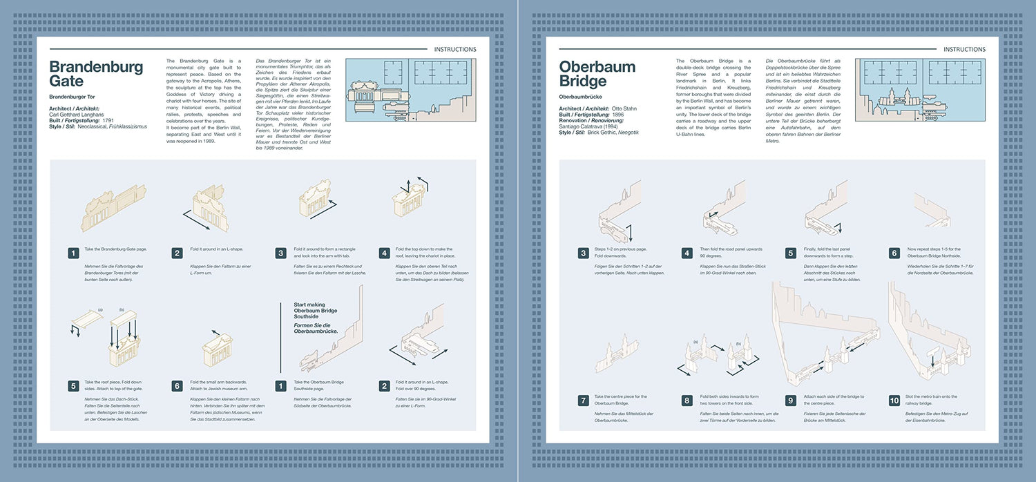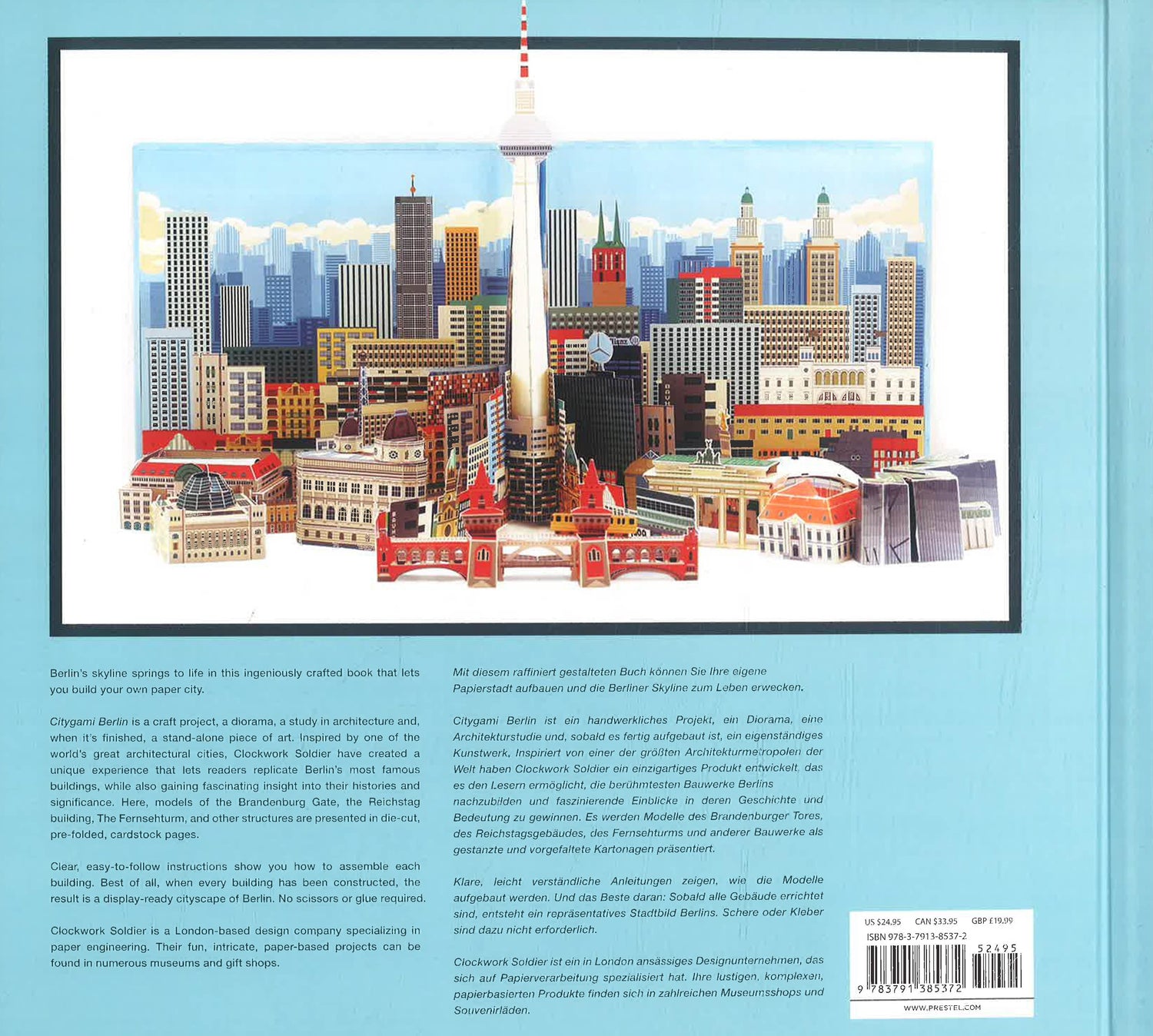 Berlin's skyline springs to life in this ingeniously crafted book that lets you build your own paper city. Citygami Berlin is a craft project, a diorama, a study in architecture, and, when it's finished, a stand-alone piece of art. Inspired by one of the world's great architectural cities, Clockwork Soldier have created a unique experience that lets readers replicate Berlin's most famous buildings, while also gaining fascinating insight into their individual histories and significance. Here, scale models of the Brandenburg Gate, the Reichstag building, The Fernsehturm, and other structures are presented on die-cut, pre-folded, cardstock pages. Clear, easy-to-follow instructions show you how to assemble each building, with no glue or scissors required, and when every building has been constructed, the result is a fabulous displayready cityscape of Berlin. Accompanying the models are a set of 40 interlocking construction cards, featuring details from the city's architecture, allowing readers to get creative and make structures of different shapes and sizes. As fun as it is educational, this craft book promises hours of absorbing activity and a lasting keepsake for years to come.