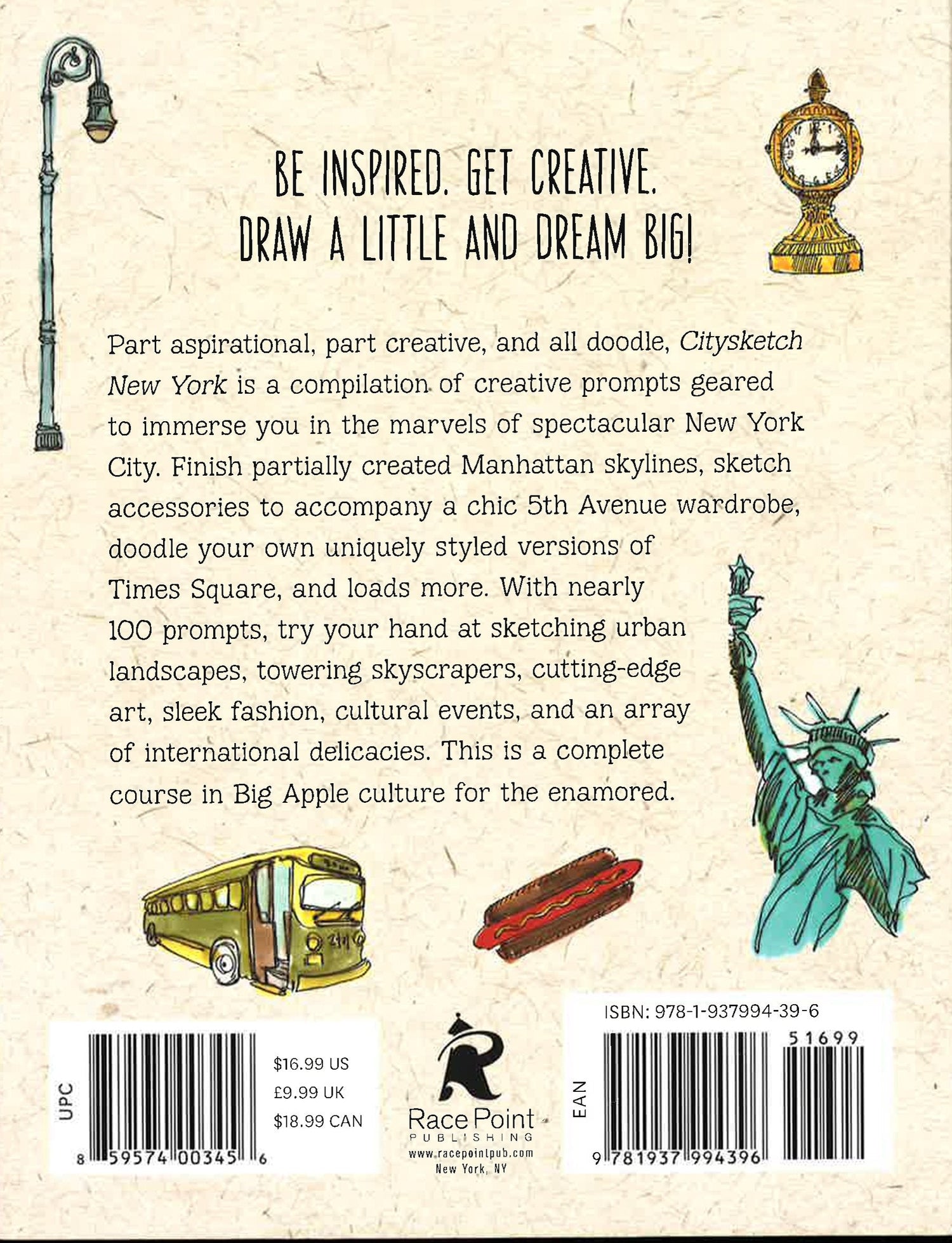 Part aspirational, part creative, and all doodle. Citysketch New York is a compilation of creative prompts geared to immerse you in the marvels of brilliant New York City. Finish partially created Manhattan skylines, sketch accessories to accompany a 'chic' 5th Ave wardrobe, doodle your own uniquely styled versions of Times Square, and loads more. With guided tips from a New York-based artist on the contours of New York architecture and art, from a fashion designer on the subtleties of New York fashion, and from a cultural expert on the people of New York as well as the food and culture. This is a complete course in Big Apple culture for the enamored. Be inspired. Get creative. After all, a little drawing will help you dream big.