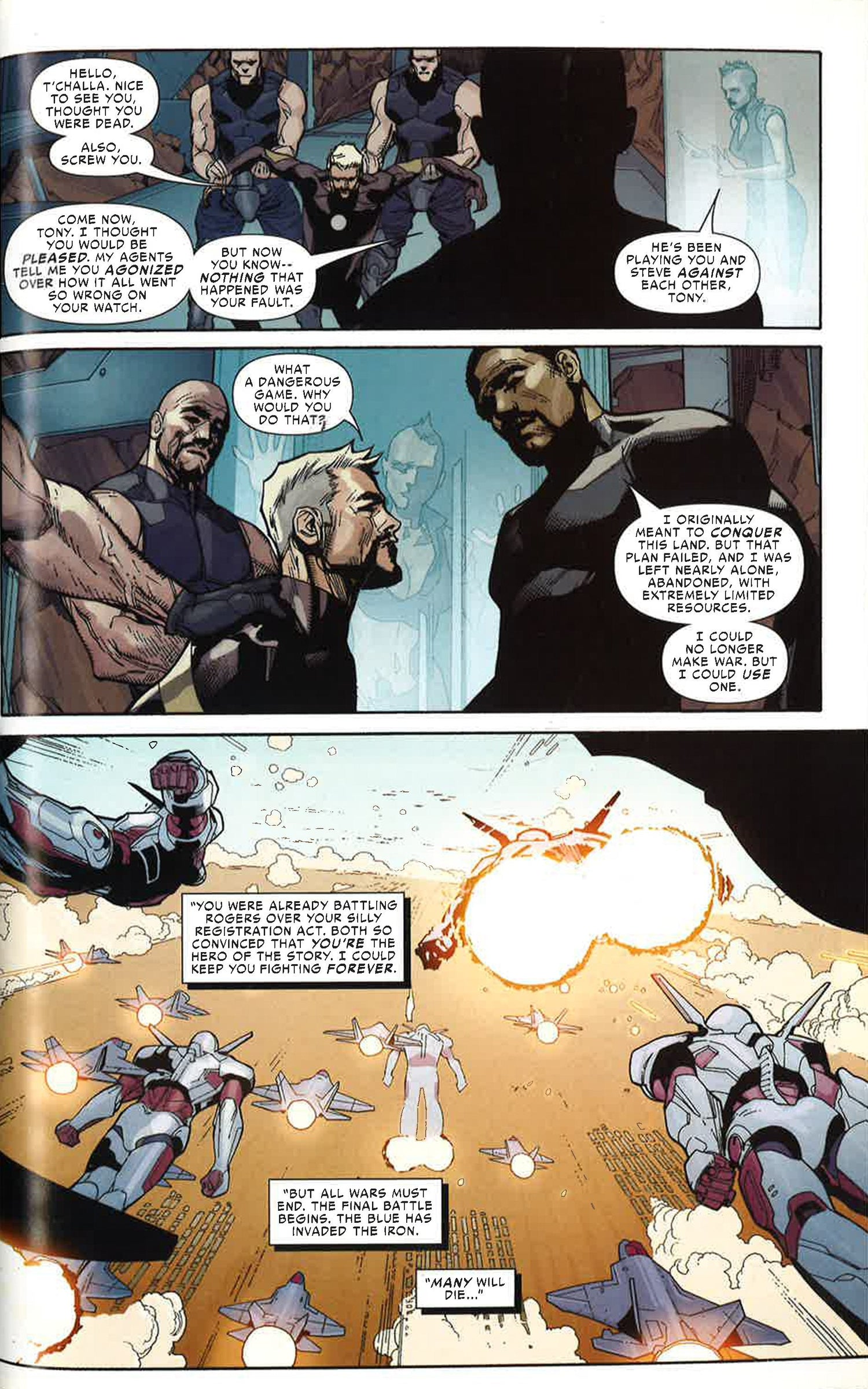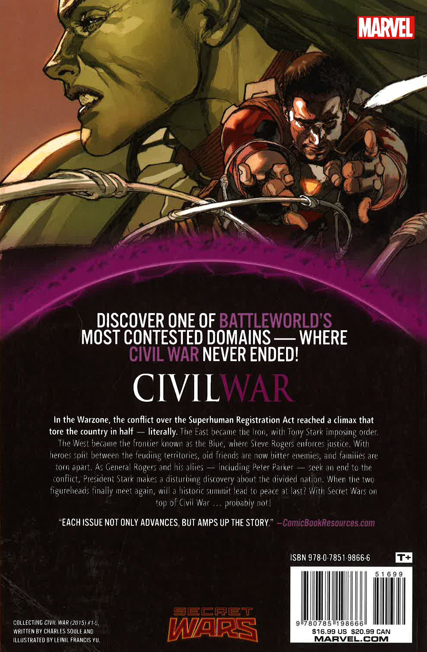 Prepare to discover one of Battleworld's most contested zones - where CIVIL WAR never ended! In this Domain, the conflict over the Superhuman Registration Act reached a climax that physically tore the country in half. The East became the Iron, with Tony Stark imposing order. The West became the frontier known as the Blue, with Steve Rogers enforcing justice. Each may have his throne, but this is no game. The nation's heroes are split between the feuding territories - old friends now bitter enemies, and families torn apart. But, six years later, the two fi gureheads meet at the Divide that scars the landscape. Could this historic summit mean there is fi nally hope for peace? CIVIL WAR plus SECRET WARS equals probably not! COLLECTING: CIVIL WAR (2015)