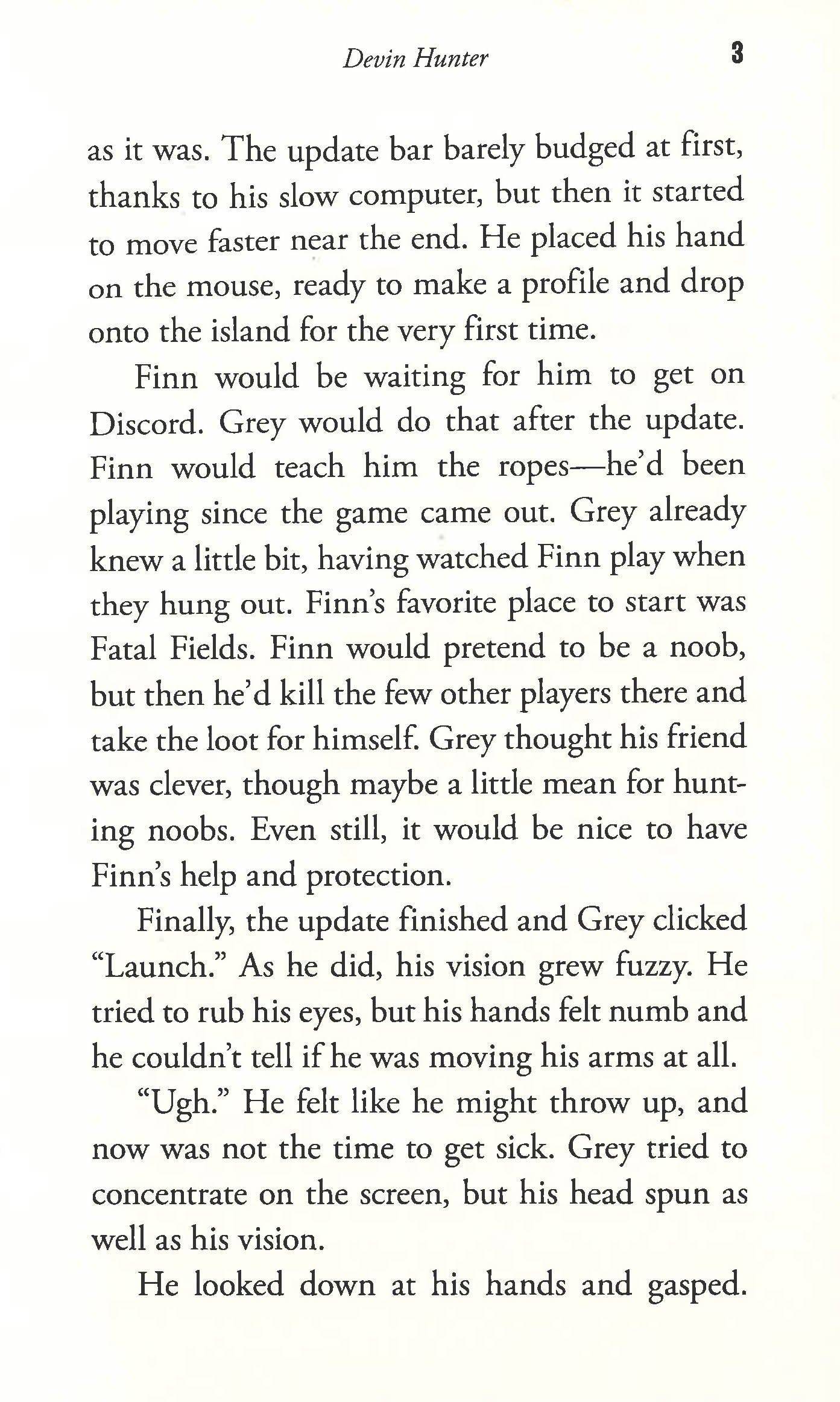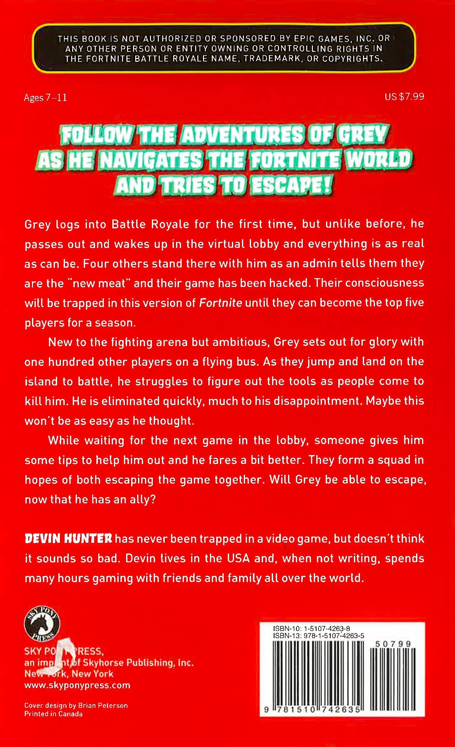 What is more fun for boys and girls than reading? More fun that playing the world's most popular game? Reading an adventure set in the world of Fortnite! Twelve-year-old Grey gets sucked into a hacked, virtual reality version of Fortnite Battle Royale along with one hundred other players. To get home, he must become one of the top five players before the season ends, or he's stuck in Fortnite for another two months. Grey logs into Battle Royale as usual, but unlike before he passes out and wakes up in the lobby and everything is as real as can be. Four others stand there with him as an admin tells them they are the "new meat" and their game has been hacked. Their consciousness will be trapped in this version of Fortnite until they can become the top five players for a season. New to the fighting arena but ambitious, Grey sets out for glory with one hundred other players on a flying bus. As they jump and land on the island to battle, he struggles to figure out the tools as people come to kill him. He dies quickly, much to his disappointment. Maybe this won't be as easy as he thought. While waiting for the next game in the lobby, someone gives him some tips to help him out and he fares a bit better. They form a duo in hopes of both escaping the game together. Will Grey be able to escape, now that he has an ally?
