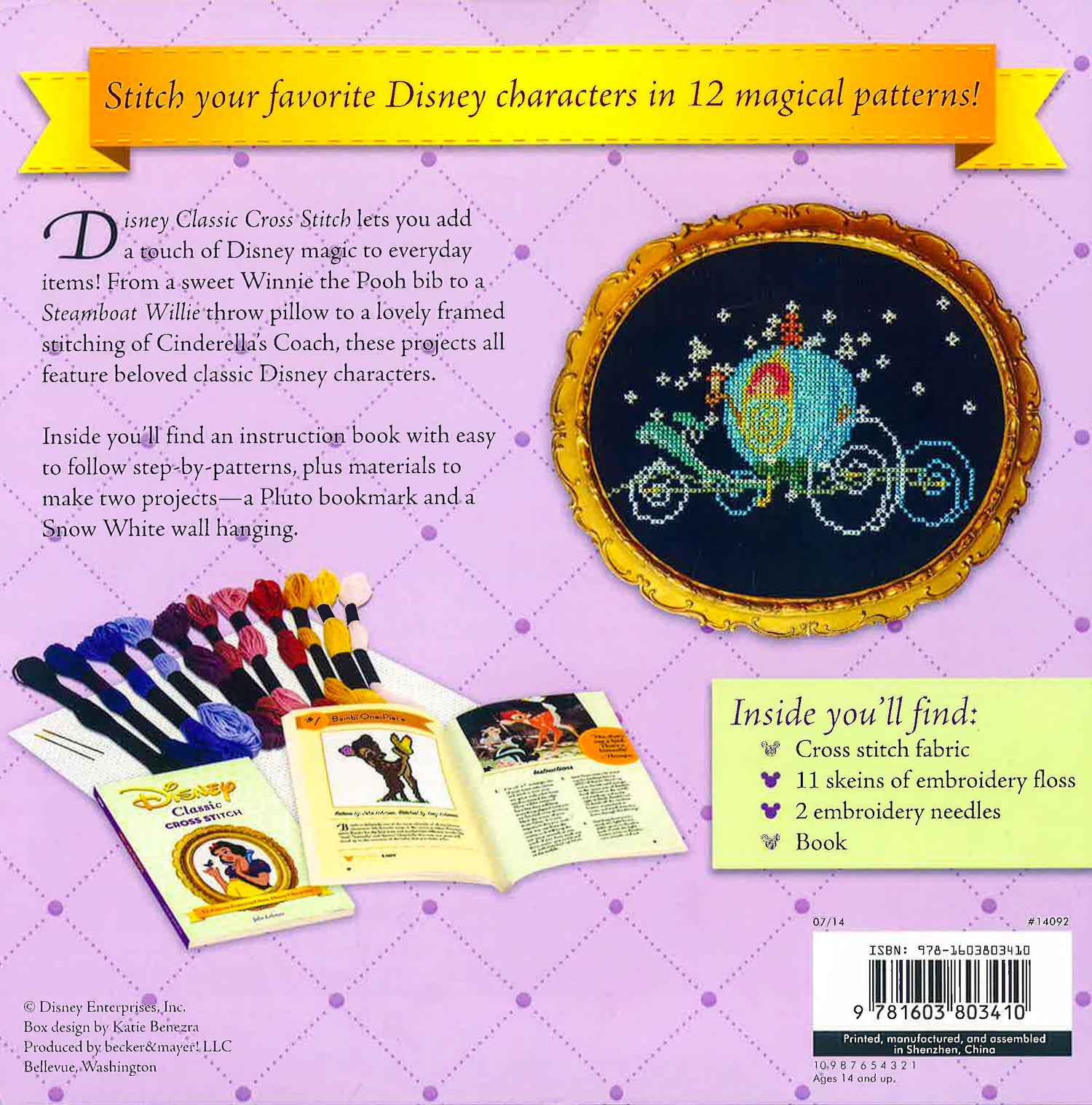 From a sweet Winnie the Pooh bib to a Steamboat Willie throw pillow to a lovely framed stitching of Cinderella's Coach, these projects all feature beloved classic Disney characters.