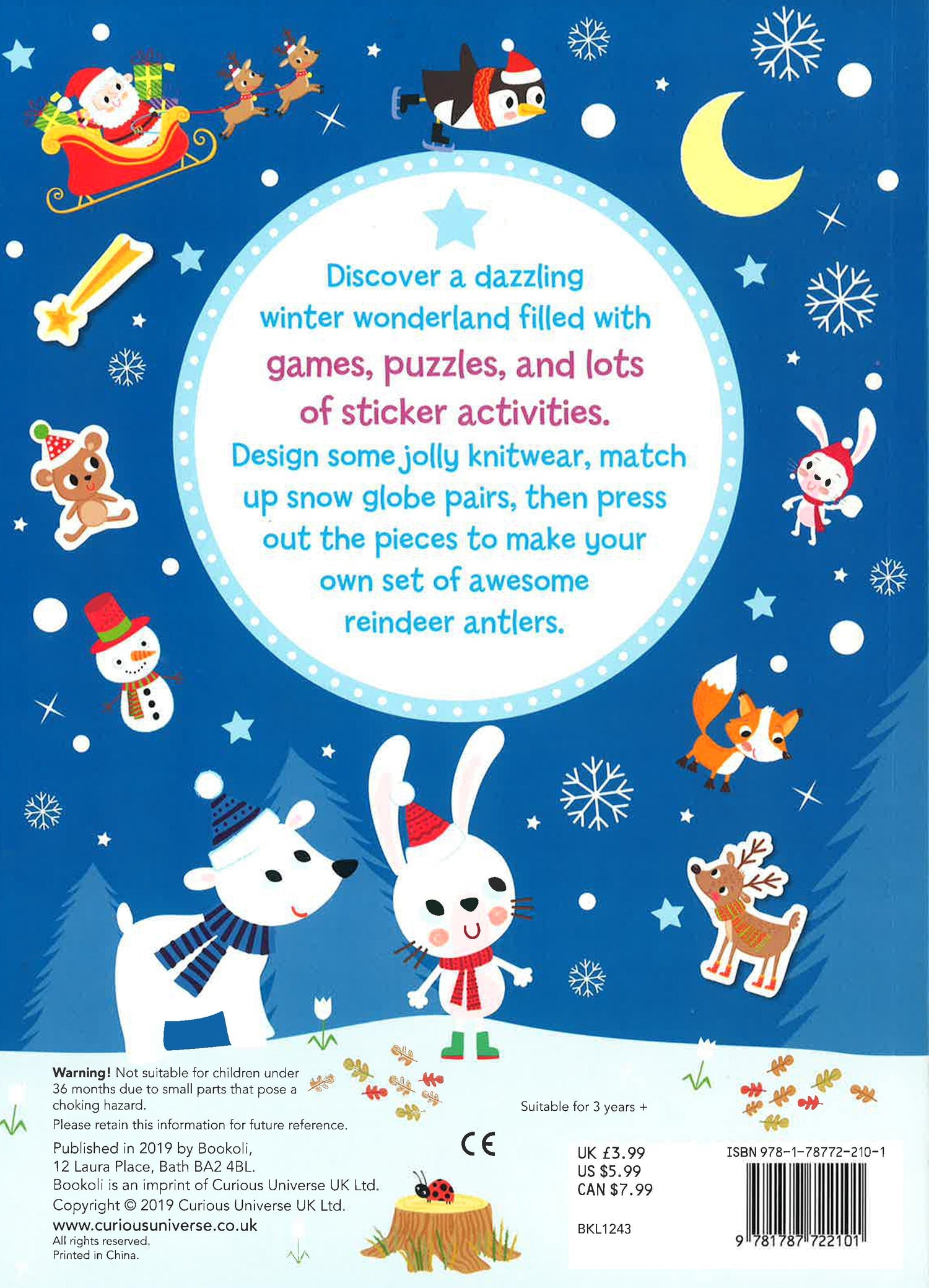 Doodle puzzle and enjoy some sticker play with this wintry Christmas activity book. Packed with engaging activities 300 stickers and festive press-out pieces children will have everything they need to create wonderful Christmas scenes play board games and make their own Christmassy craft projects. The colourful stickers are perfect for little fingers to find peel off and stick. Get ready for some frosty festive fun.