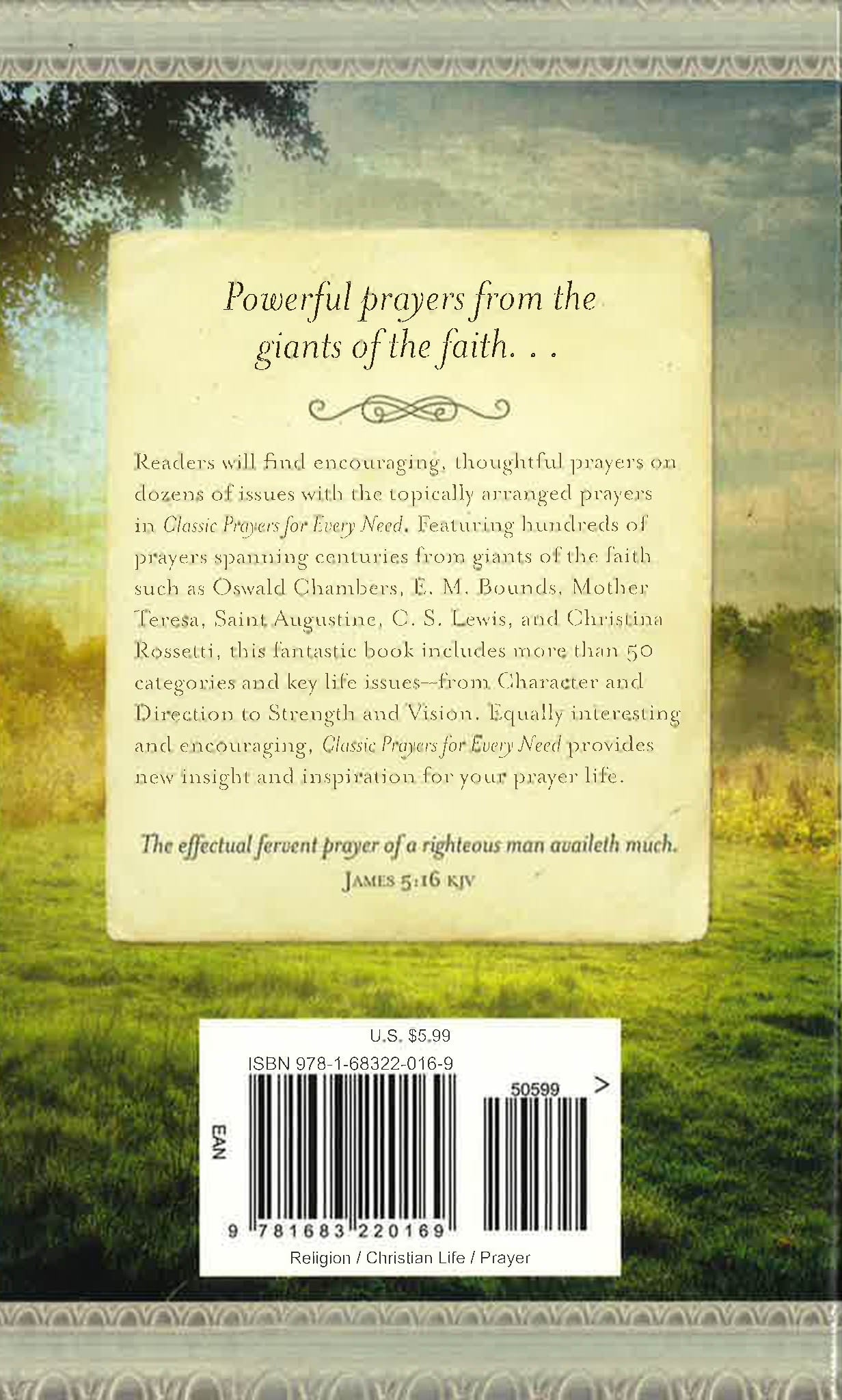 Readers will find encouraging, thoughtful prayers on dozens of issues with the topically arranged prayers in Classic Prayers for Every Need. Featuring hundreds of prayers from giants of the faith spanning centuries such as Oswald Chambers, E. M. Bounds, Mother Teresa, Saint Augustine, C.S. Lewis, and Christina Rossetti, this fantastic book includes dozens of categories and key life issues--from Character and Direction to Suffering and Worry. Equally interesting and encouraging, Classic Prayers for Every Need provides new insight and inspiration for your prayer life.