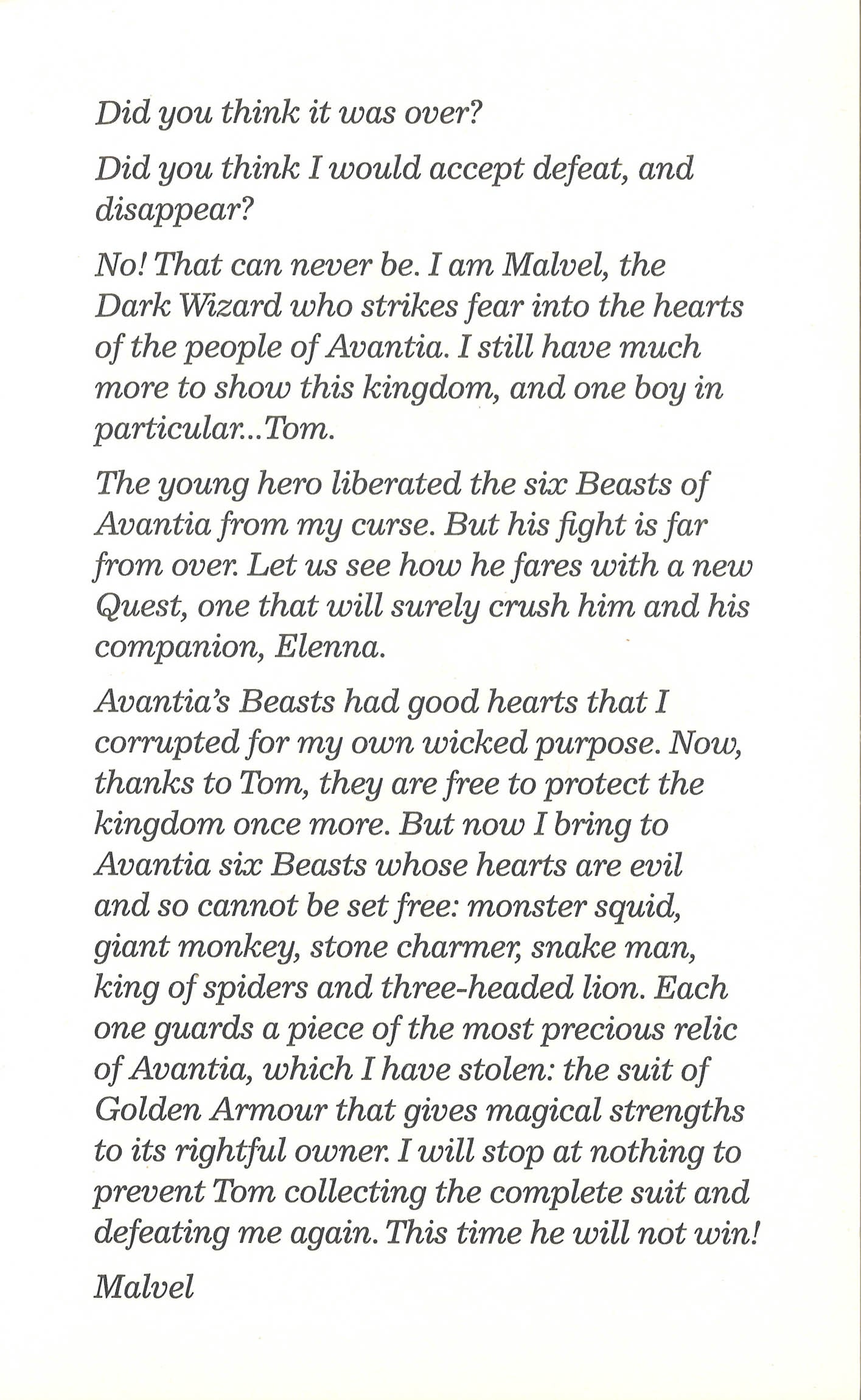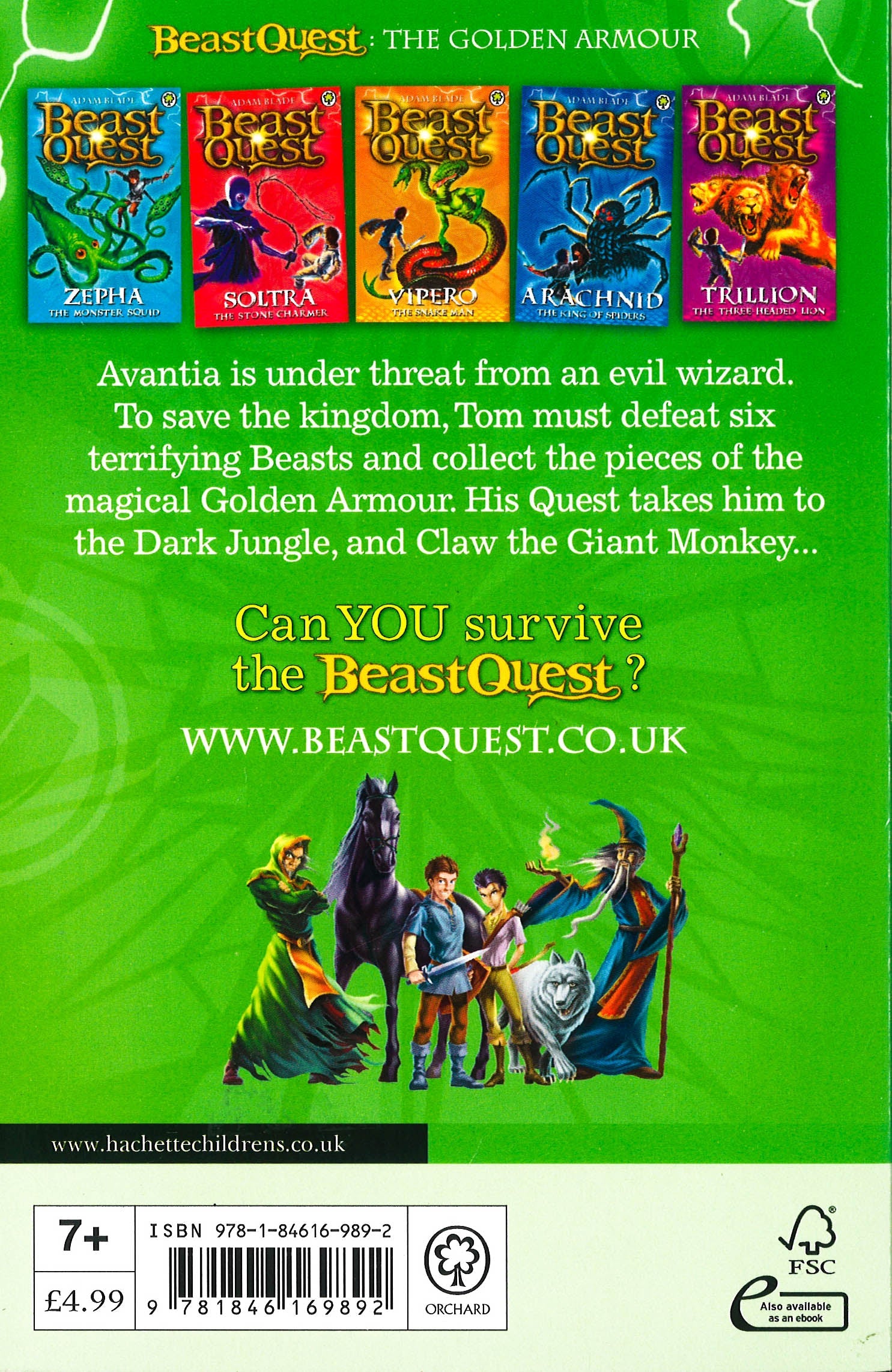 Battle fearsome beasts and fight evil with Tom and Elenna in the bestselling adventure series for boys and girls aged 7 and up. The Evil Wizard Malvel has stolen the magical suit of golden armour and scattered it throughout Avantia. Tom vows to find the pieces - but they are guarded by six terrifying new Beasts! Join Tom and Elena as they journey into the Dark Jungle to do battle with Claw the Giant Monkey...There are SIX thrilling adventures to collect in the Beast Quest: The Golden Armour series: Zepha the Monster Squid; Claw the Giant Monkey; Soltra the Stone Charmer; Vipero the Snake Man; Arachnid the King of Spiders; Trillion the Three-Headed Lion.If you like Beast Quest, check out Adam Blade's other series: Team Hero, Sea Quest and Beast Quest: New Blood!