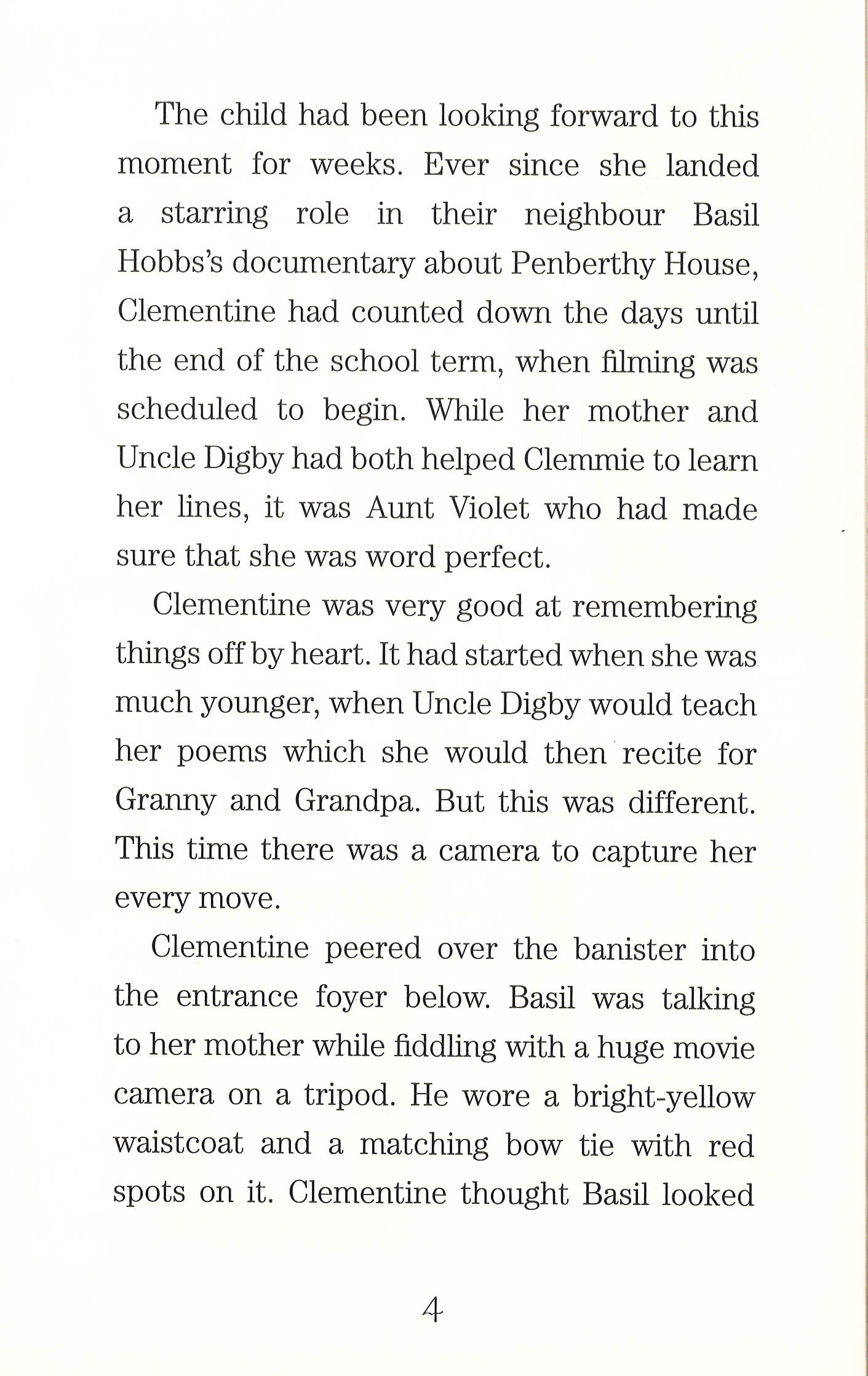Clementine Rose is going to be on the big screen! Her neighbour, Basil Hobbs, is making a documentary about Penberthy House and has given her a starring role. Clementine can't wait to uncover the magic of motion picture. And when a surprise present comes her way, Clemmie's interest in filmmaking grows.