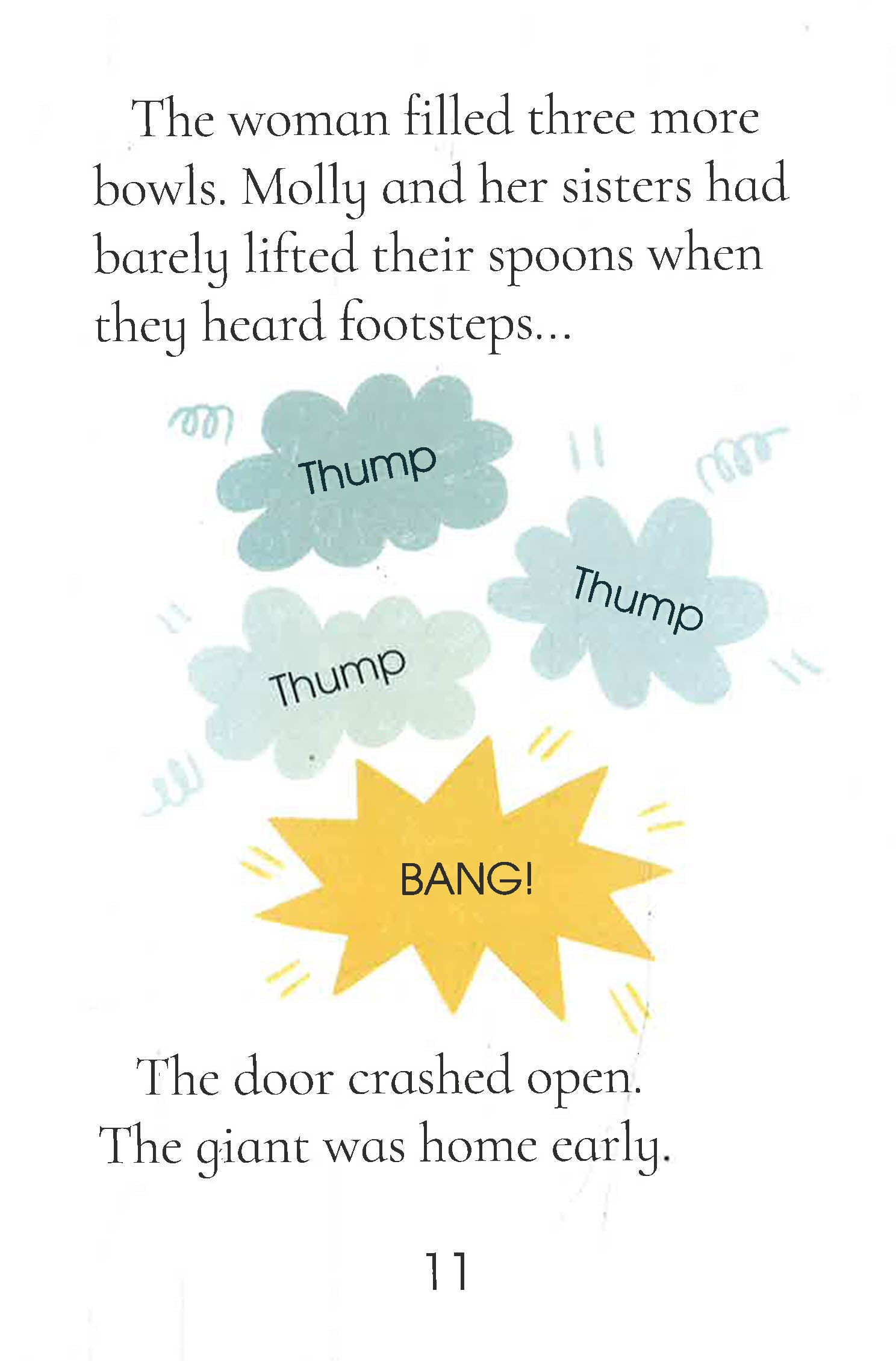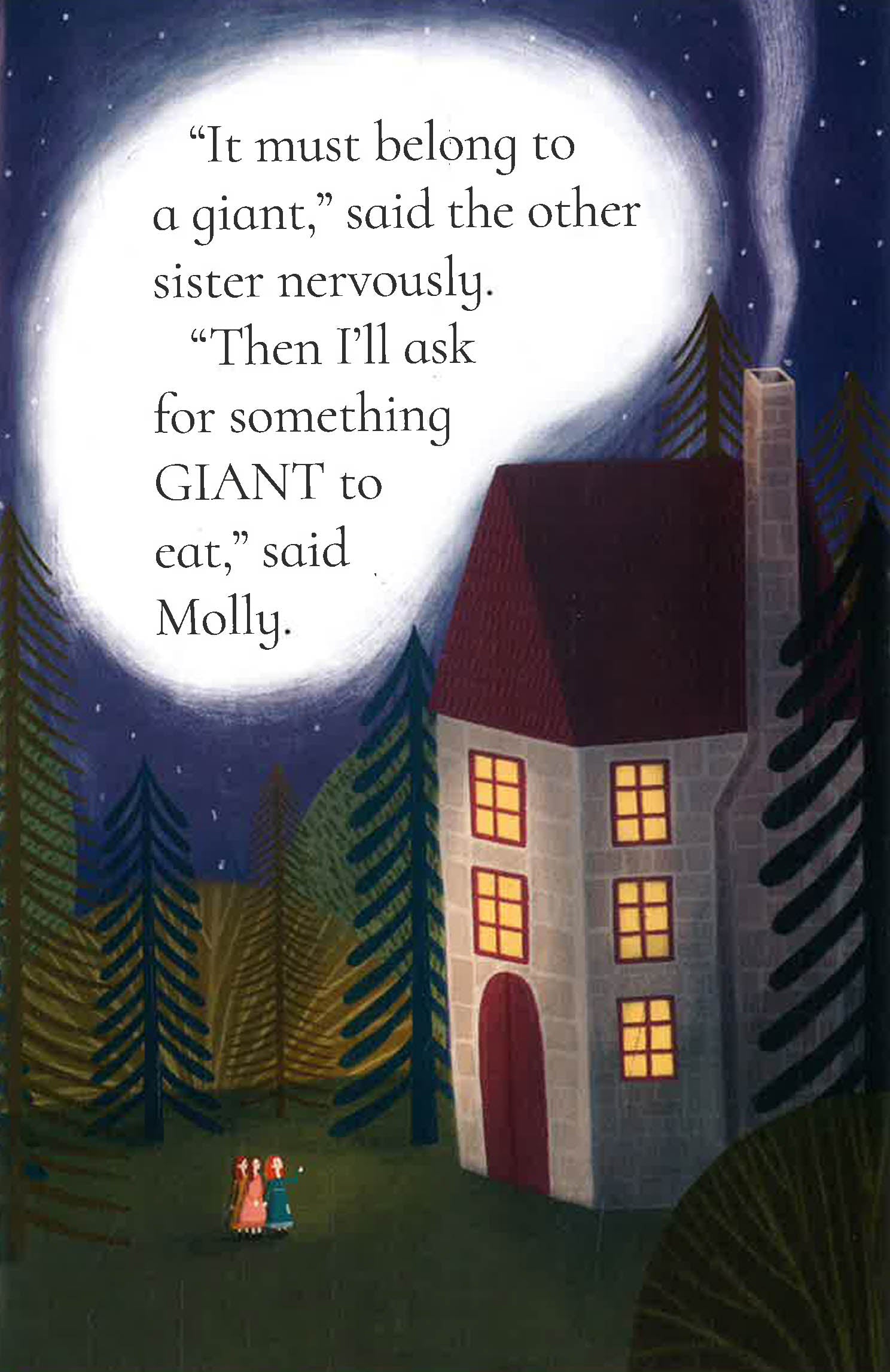 Molly and her sisters meet a wicked giant who wants to eat them. Molly's quick thinking saves them... but to defeat the giant forever, Molly will have to return and steal three magical treasures. Based on an old Scottish tale, sometimes known as Molly Whuppie.
