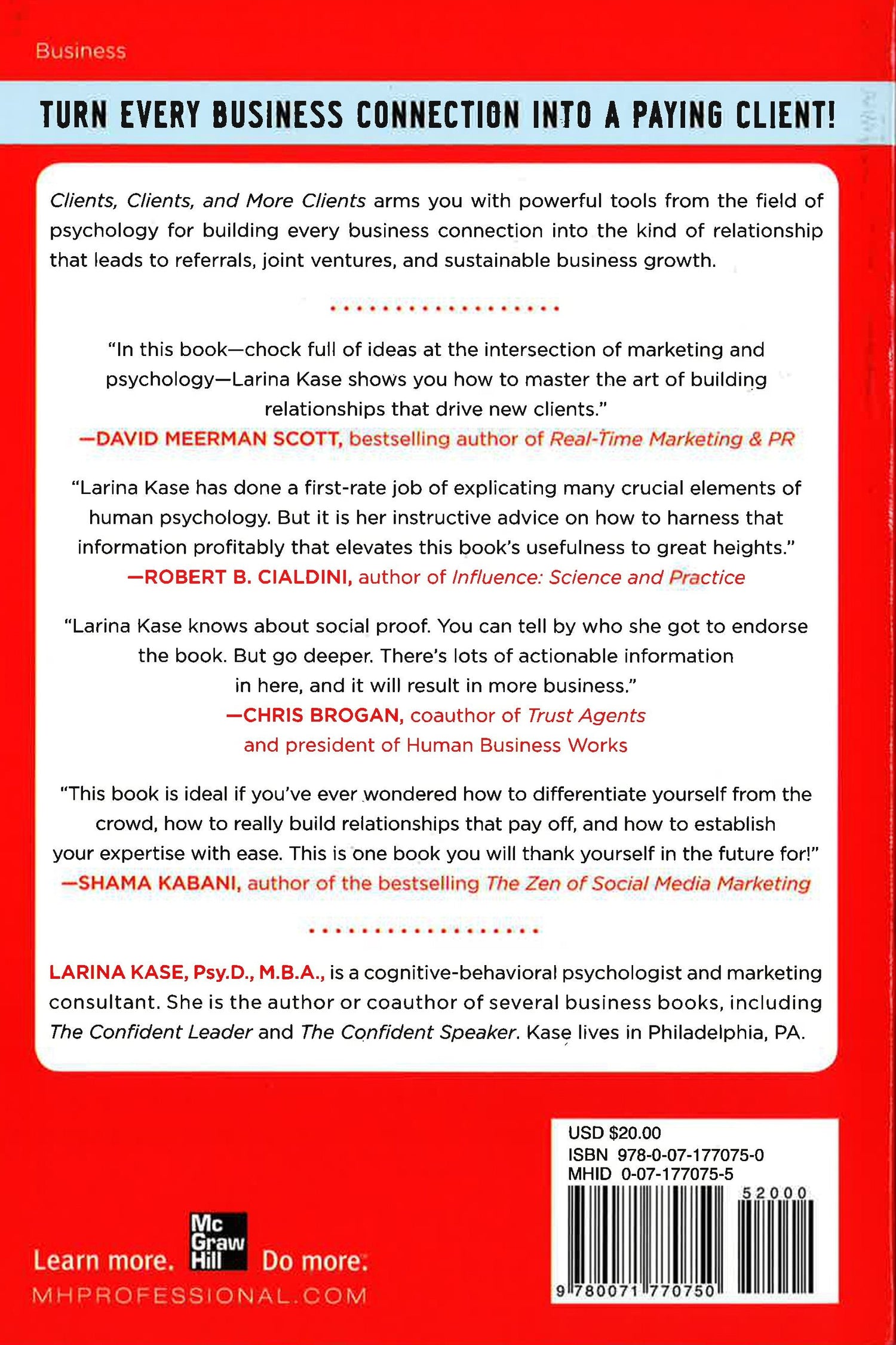 TURN EVERY BUSINESS CONNECTION INTO A PAYING CLIENTWith a Foreword by Michael Port, bestselling author of Book Yourself SolidClients, Clients, and More Clients arms you with powerful tools from the field of psychology for building every business connection into the kind of relationship that leads to referrals, joint ventures, and sustainable business growth."In this book-chock full of ideas at the intersection of marketing and psychology-Larina Kase shows you how to master the art of building relationships that drive new clients."-David Meerman Scott, bestselling author of Real-Time Marketing & PR"Larina Kase has done a first-rate job of explicating many crucial elements of human psychology. But it is her instructive advice on how to harness that information profitably that elevates this book's usefulness to great heights."-Robert B. Cialdini, author of Influence: Science and Practice"Larina Kase knows about social proof. You can tell by who she got to endorse the book. But go deeper. There's lots of actionable information in here, and it will result in more business."-Chris Brogan, coauthor of Trust Agents and president of Human Business Works"This book is ideal if you've ever wondered how to differentiate yourself from the crowd, how to really build relationships that pay off, and how to establish your expertise with ease. This is one book you will thank yourself in the future for!"-Shama Kabani, author of the bestselling The Zen of Social Media Marketing"If 'who you know' and making a meaningful connection with them is truly part of the success factor in business (and it is), I promise you that Larina Kase's Clients, Clients, and More Clients will have your phone ringing and e-mail box full of people who truly want to do business with you. A savvy, wise, and value-based text allows the reader to learn what few others understand: the Science and Art of Connecting. I've read and reviewed a dozen books on building a solid client base. Most completely miss the target. This book is a handbook to meet, connect with, and build a valuable relationship with just about anyone you want to."-Kevin Hogan, Psy.D., author of The Science of Influence and The Psychology of Persuasion"This is a remarkable, readable, and instantly practical book packed with leading-edge tips on attracting new clients fast. I loved it!"-Dr. Joe Vitale, author of The Attractor Factor"In Clients, Clients, and More Clients, Larina Kase shows you how to find and influence prospects so they'll understand the value of your work and readily do business with you. The research-based strategies in this important and engaging book are worth any businessperson's time, close study, and dedicated application. The book is true to its promises."-Mark Levy, founder of Levy Innovation and author of Accidental Genius: Using Writing to Generate Your Best Ideas, Insight, and Content"Clients, Clients, and More Clients is a must-read for every sales executive, sales manager, and company executive. This is not your typical how-to sales guide, as it digs deep into how to change a losing sales strategy into a winning success. Larina uncovers the psychology behind the sales mentality, and breaks the process down, step-by-step; making it crystal clear the direction you'll need to take to achieve long-term success."-Shawn Jennings Edgington, CIC, CEO, and founder of Granite Insurance Brokers, Cyber Safety Academy Fundraiser, and author of The Parent's Guide to Texting, Facebook and Social Media