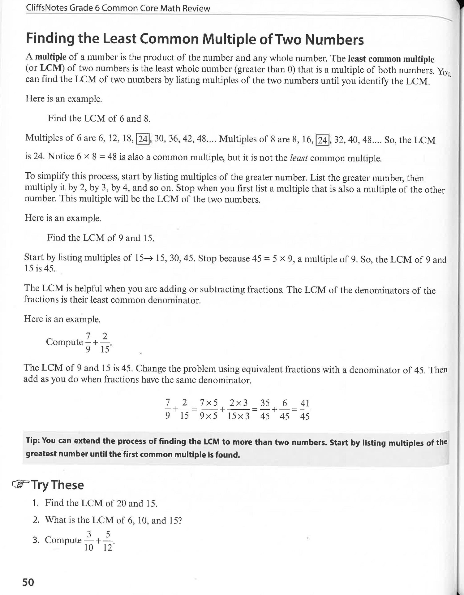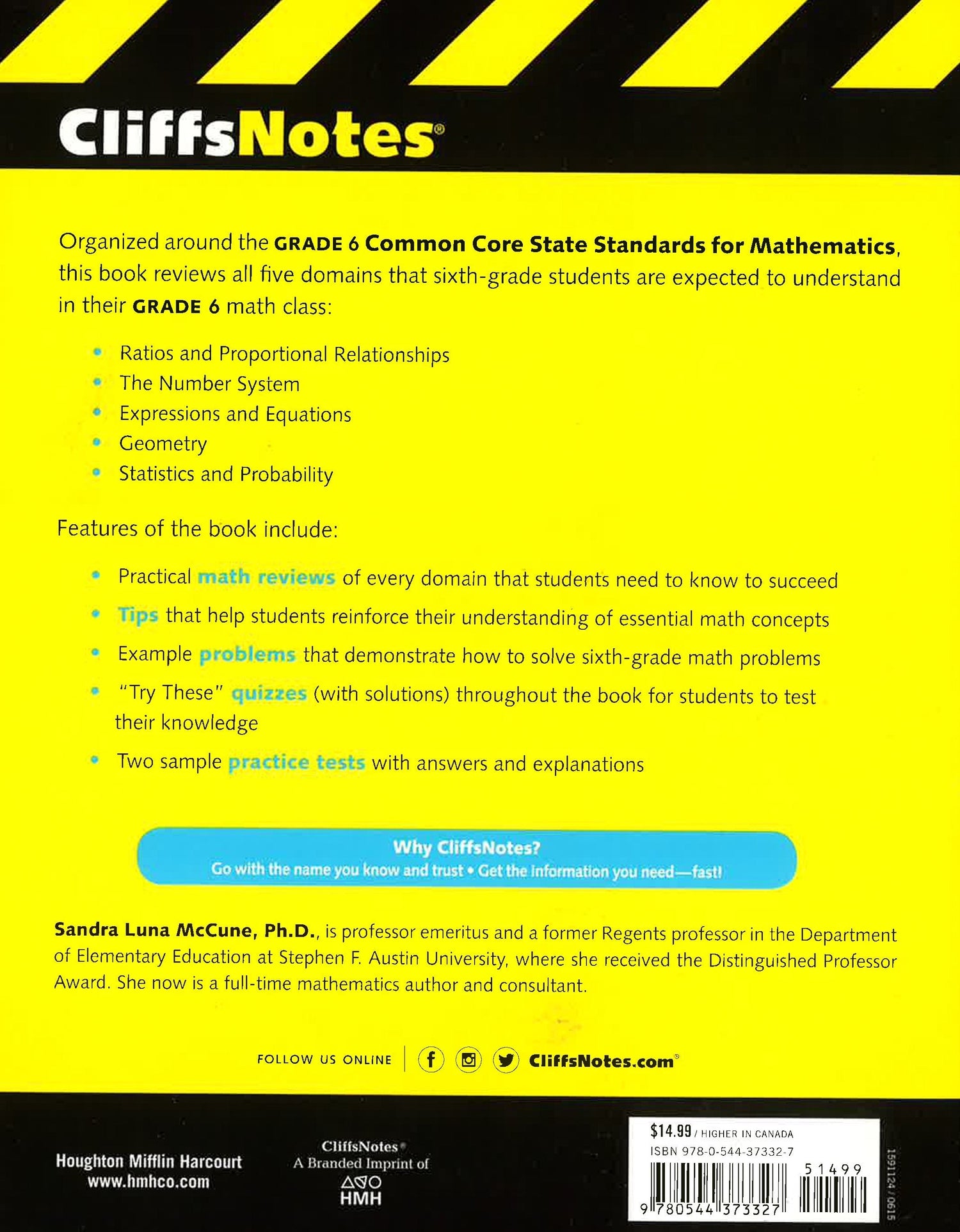 Nearly half of adults, including parents of middle-school students, have never heard of the Common Core State Standards, let alone have a working knowledge of what exactly their children face when it comes to middle-school math. Even teachers acknowledge struggling with how best to teach their students these math standards. CliffsNotes comes to the rescue with this Grade 6 Common Core Math Review. Aligned to the state standards, this book provides essential coverage of the Grade 6 CCSS math that's challenging middle-school students, teachers, and parents alike. The material covers all of the math standards that comprise Grade 6 CCSS math: - Ratios and proportional relationships - The number system - Geometry - Expressions and equations - Statistics and probability Two practice tests round out the book, plus every review chapter includes example problems.