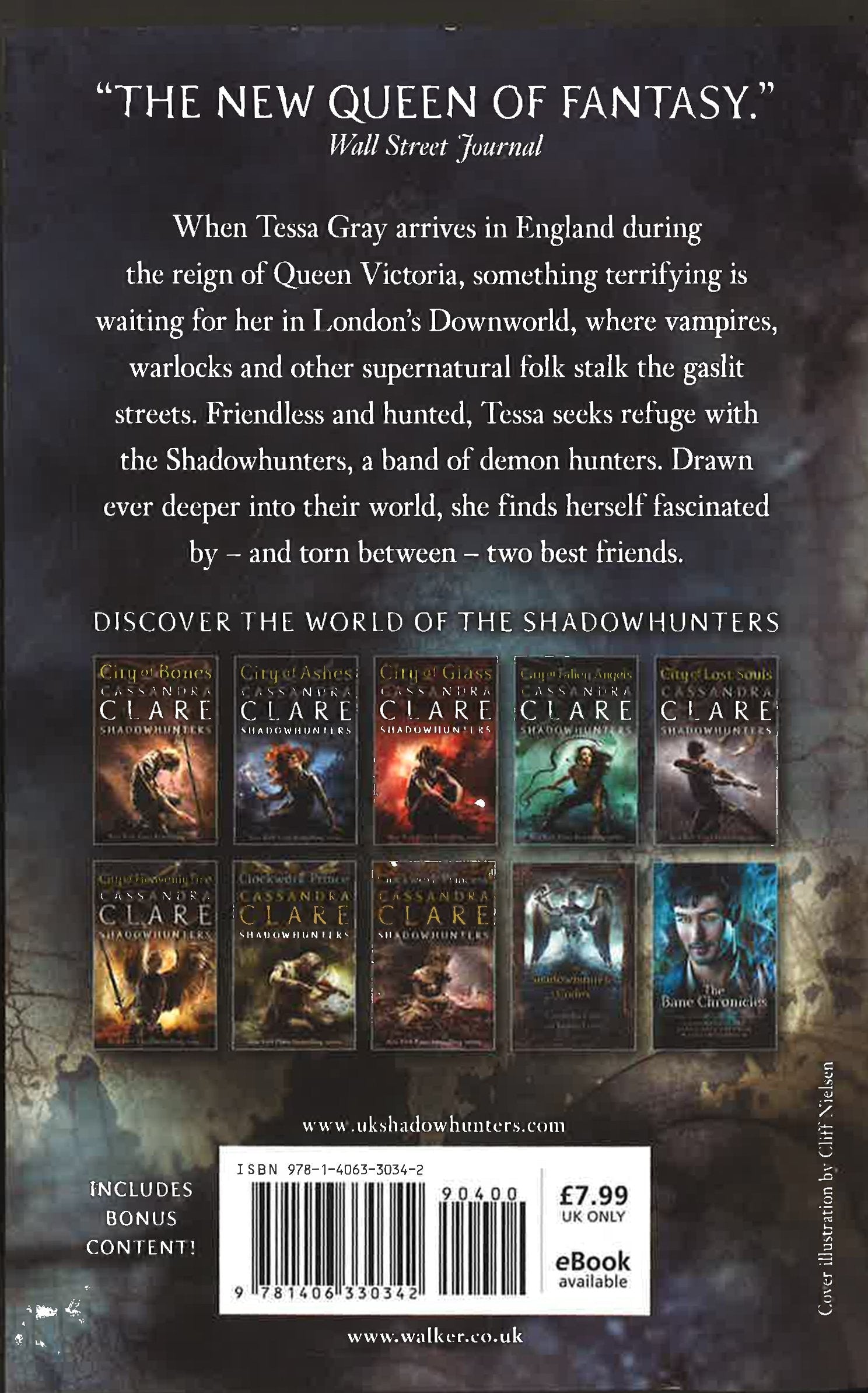 When sixteen-year-old Tessa Gray arrives in England during the reign of Queen Victoria, something terrifying is waiting for her in London's Downworld, where vampires, warlocks and other supernatural folk stalk the gaslit streets. Friendless and hunted, Tessa seeks refuge with the Shadowhunters, a band of worriors dedicated to ridding the world of demons. Drawn ever deeper into their world, she finds herself fascinated by - and torn between - two best friends and quickly realizes that love may be the most dangerous magic of all.