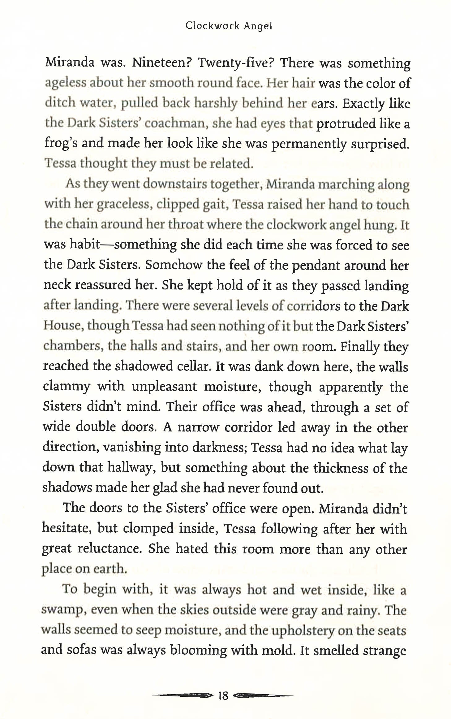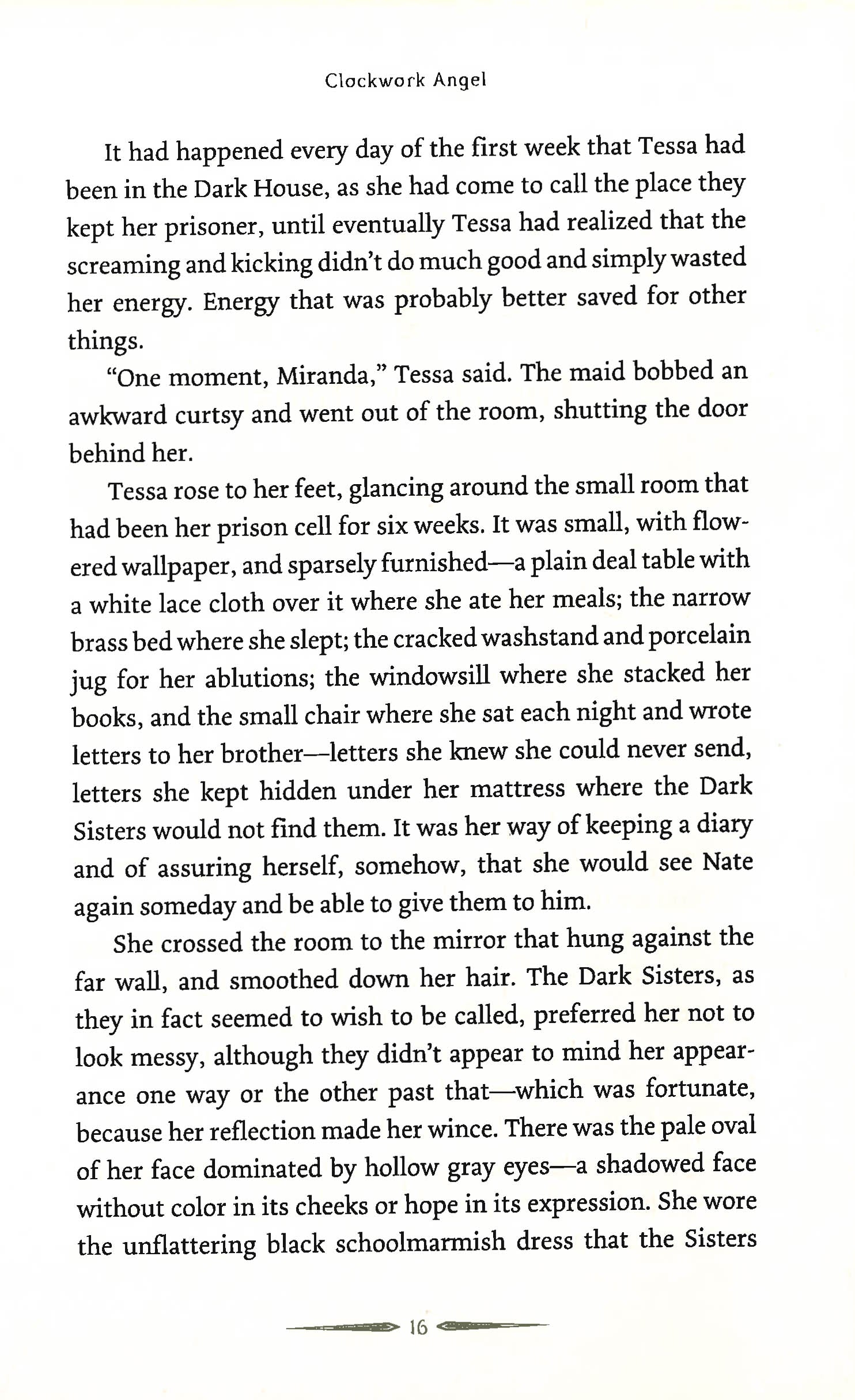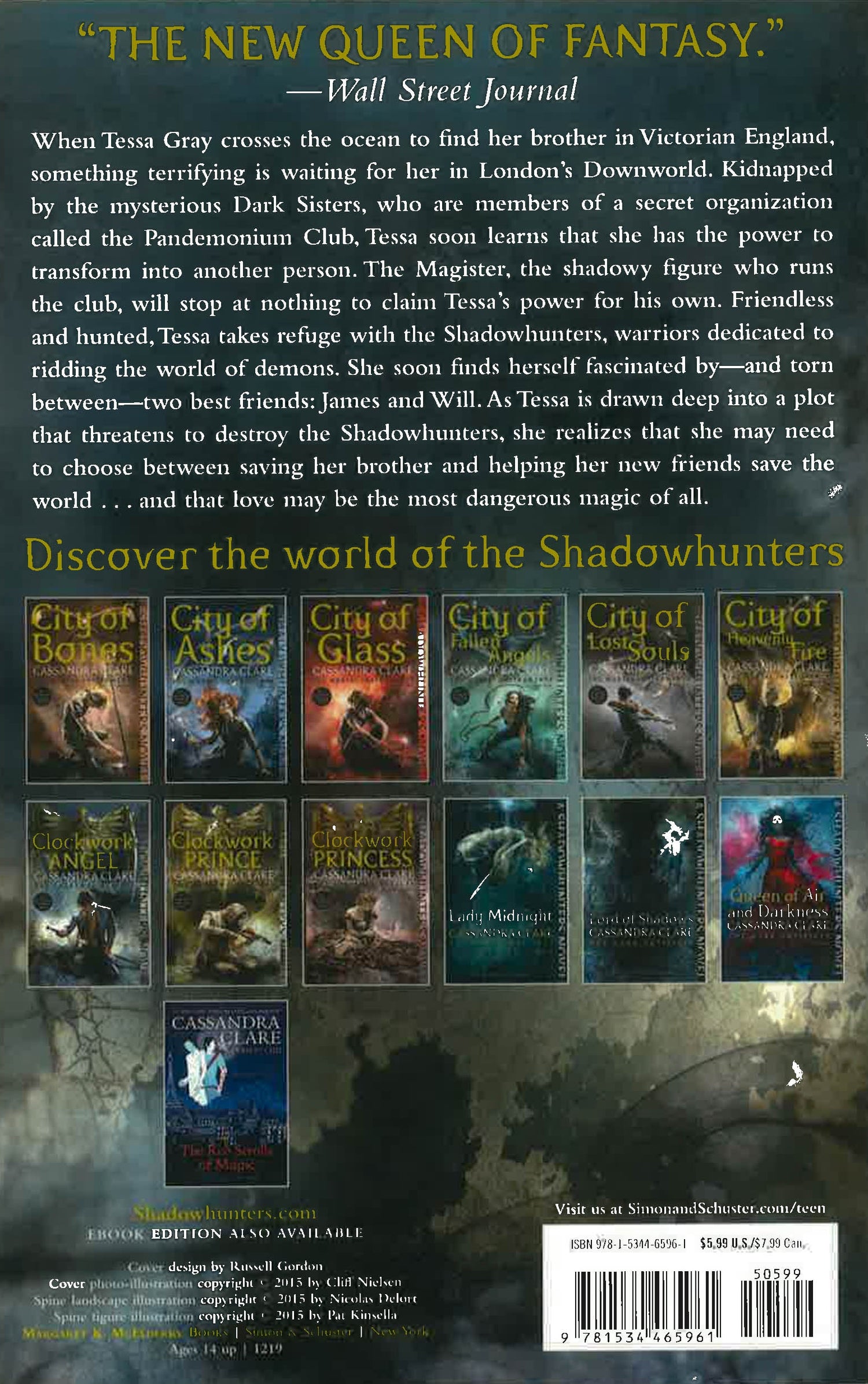 The #1 New York Times and USA TODAY bestseller is now available at an incredible low price for a limited time only! Discover the "compulsively readable" (Booklist) first book in the Infernal Devices trilogy, prequel to the internationally bestselling Mortal Instruments series! Clockwork Angel is a Shadowhunters novel. When Tessa Gray crosses the ocean to find her brother, her destination is England, the time is the reign of Queen Victoria, and something terrifying is waiting for her in London's Downworld, where vampires, warlocks, and other supernatural folk stalk the gaslit streets. Only the Shadowhunters, warriors dedicated to ridding the world of demons, keep order amidst the chaos. Kidnapped by a secret organization called The Pandemonium Club, Tessa learns that she herself is a Downworlder with a rare ability: the power to transform into another person. What's more, the Magister, the shadowy figure who runs the Club, will stop at nothing to claim Tessa's power for his own. Friendless and hunted, Tessa takes refuge with the Shadowhunters of the London Institute, who swear to find her brother if she will use her power to help them. She soon finds herself fascinated by--and torn between--two best friends: James, whose fragile beauty hides a deadly secret, and Will, whose caustic wit and volatile moods keep everyone in his life at arm's length...everyone, that is, but Tessa. As their search draws them deep into the heart of an arcane plot that threatens to destroy the Shadowhunters, Tessa realizes that she may need to choose between saving her brother and helping her new friends save the world...and that love may be the most dangerous magic of all.