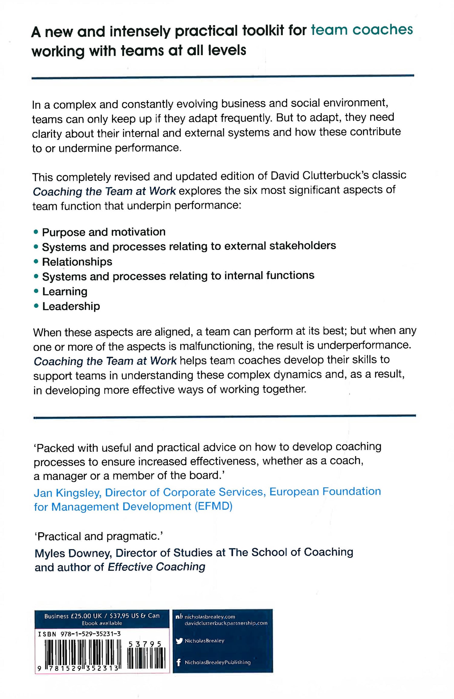 Coaching the Team at Work 2 is the result of research over 20 years with practising team coaches and with major corporations around the world. It recognises that in a complex and constantly evolving business and social environment, teams can only keep up if they adapt frequently. But to adapt, they must have clarity about their internal and external systems and how these contribute to or undermine performance. There are multiple aspects of team function that underpins performance - and each influences and is influenced by the others. This revised edition explores the six most significant aspects: