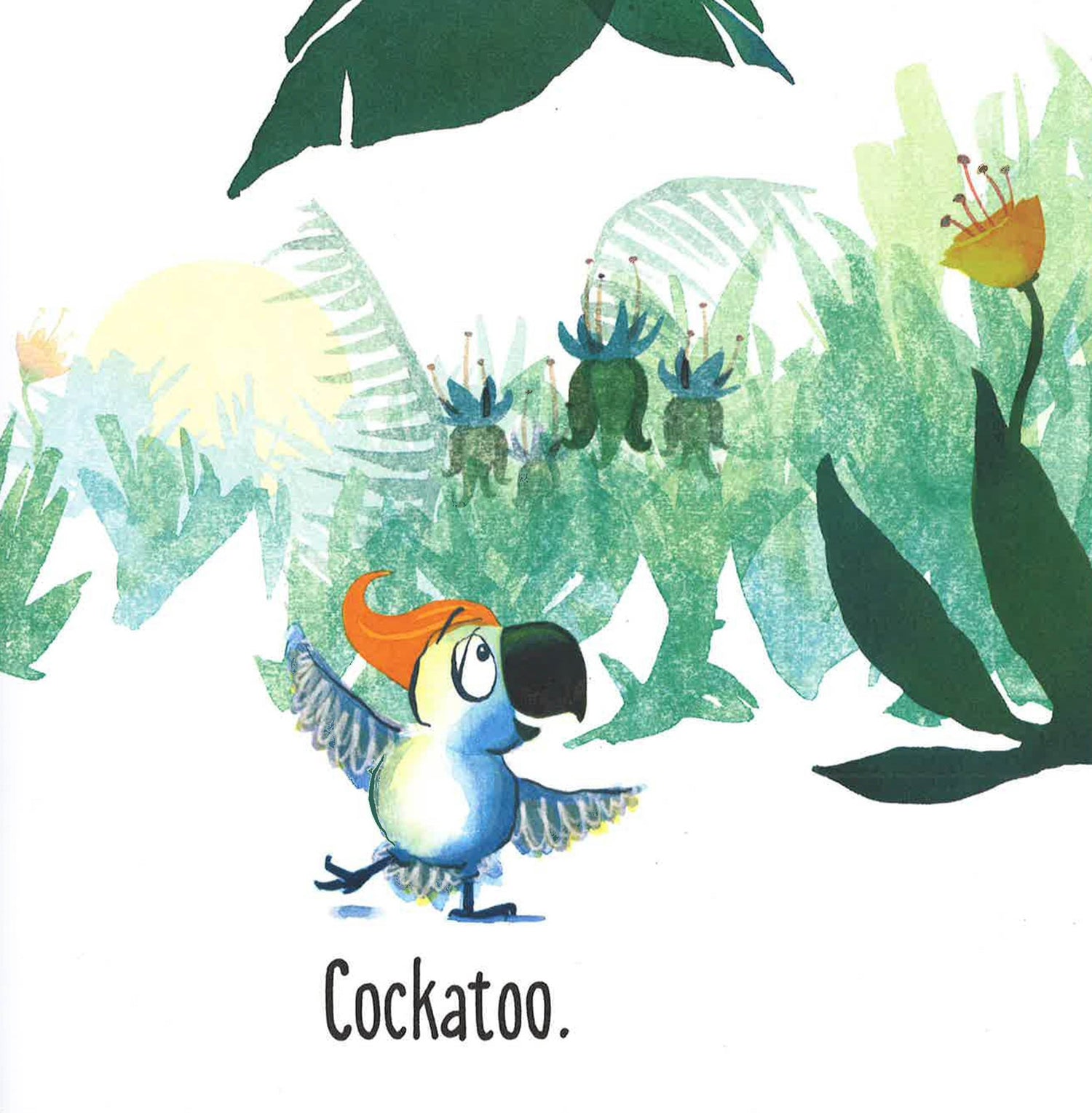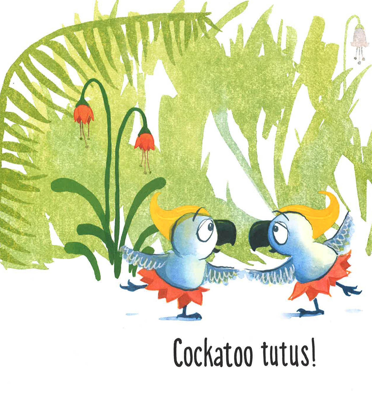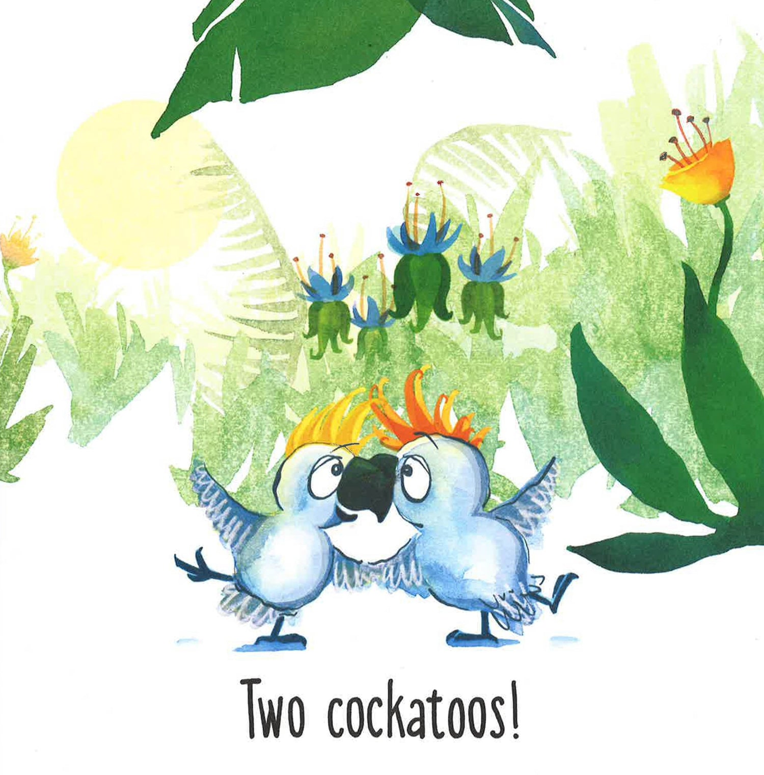 Cockatoo. Cockatoo two?Cockatoo, too?Two cockatoos!Two cockatoos, too?Cockatoo tutus!Two cockatoos meet two more cockatoos in tutus and two tutued toucans. And then two more! Can they all can-can? They can! The cockatoos and toucans join together for a dance and ask the reader: "Can you can-can too?" Bethanie Deeney Murguia's fabulous book combines fantastically funny wordplay with lush, vibrant illustrations that will make readers want to can-can along!Kids will love the wordplay and the funny storyline this book creates. The bright and vibrant watercolor illustrations complement the story's humour. The wordplay makes this the perfect read-aloud book that kids will enjoy participating in. Kids will delight in Bethanie's energetic cockatoos and toucans!