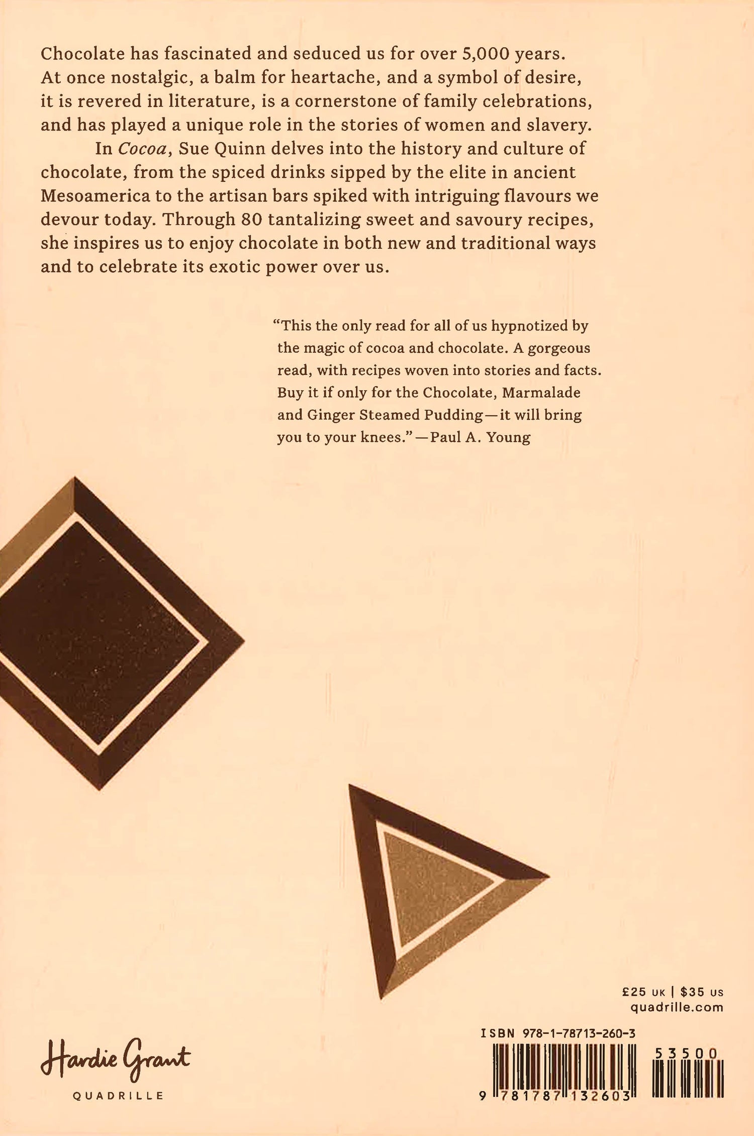 Chocolate has beguiled us for millennia. From the spiced drinks sipped by the elite in ancient Mesoamerica to the artisan bars spiked with intriguing flavours we devour today, chocolate has always had a magical pull on our senses. Exotic, indulgent, hedonistic and sensual, its power over us somehow exceeds the sum of its parts.This ground-breaking exploration of chocolate, by award-winning writer and lifelong cocoa enthusiast Sue Quinn, will intrigue, inspire, surprise and fascinate you in equal measure.In these pages is a wealth of cultural, historical and culinary information about the story of chocolate through the ages and across the world, illustrated with vintage packaging, iconic adverts and stunning illustrations.Interspersed throughout the book are 80 tantalising sweet and savoury recipes, such as Salted Caramel and Lime Chocolate Sauce; Triple Chocolate and Liquorice Cake with Treacle Syrup; Spelt, Cranberry and Cocoa Nib Crackers; and Sticky Slow-Roasted Beef Short Ribs with Cocoa and Maple.