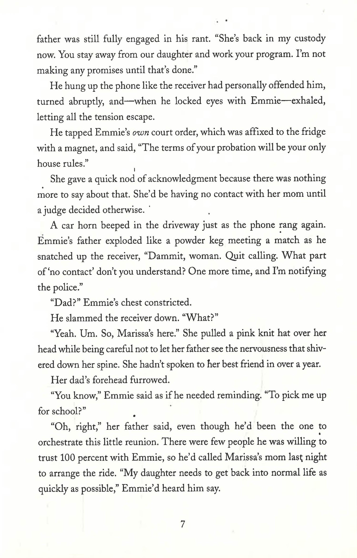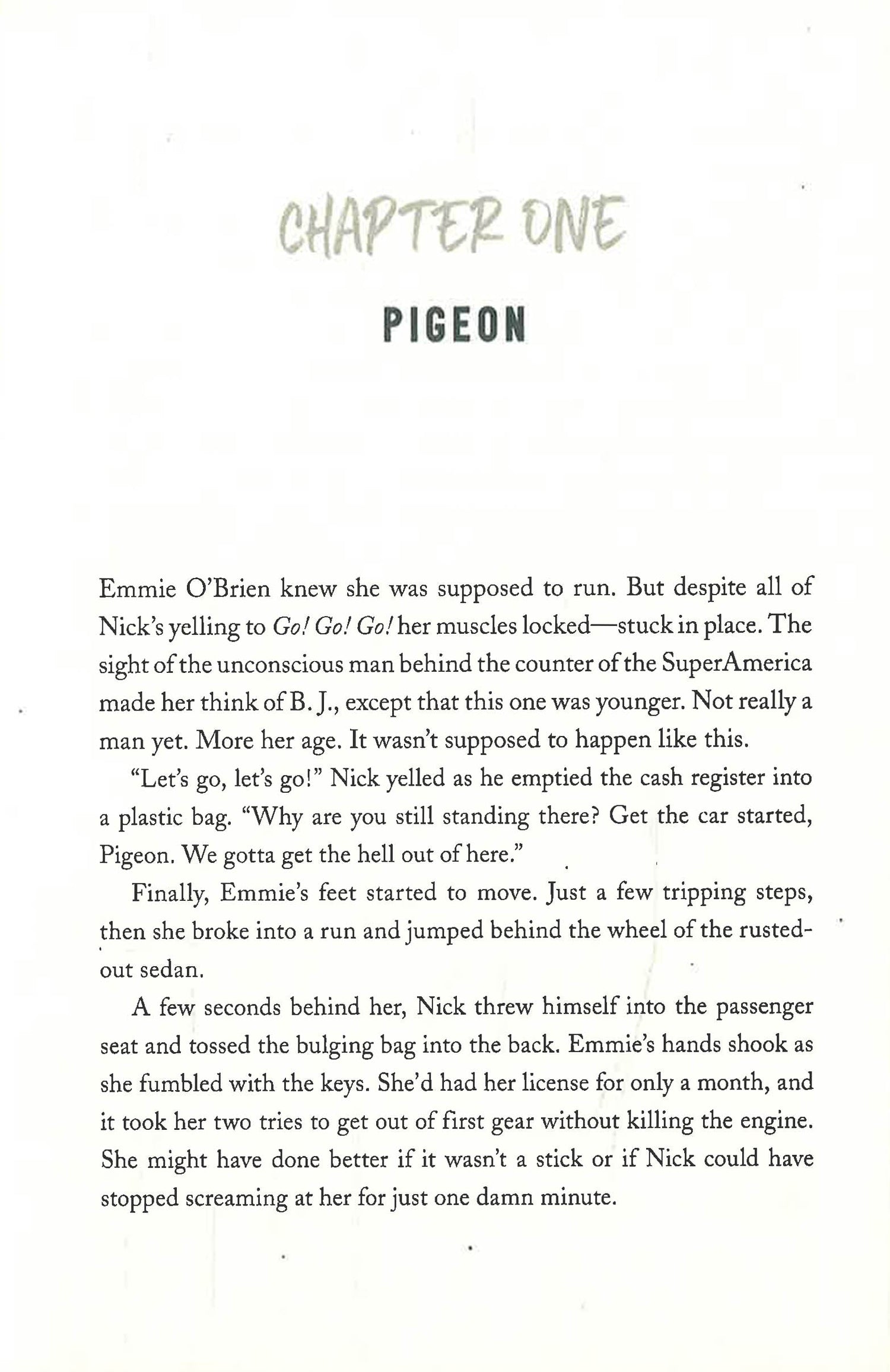 Emmie O'Brien is a former good girl now on the fringe. She spent a crazy year involved with Nick, her mom's drug dealer; after her arrest she was lucky to go back to her old life. But she's haunted by the choices she made--first, to be with Nick, and then later, to testify against him. Max Shepherd is a senior varsity hockey player with serious anger issues. His grief over the death of his girlfriend causes him to see injustice wherever he looks. When they meet in community service, Max is drawn to Emmie's calm energy, but Emmie knows better than to get too close to anyone. When friends of Nick show up seeking revenge, Emmie is forced to come to terms with her past, while Max has to control his protective instincts. They must trust one another, especially when Emmie's situation takes a dangerous turn.