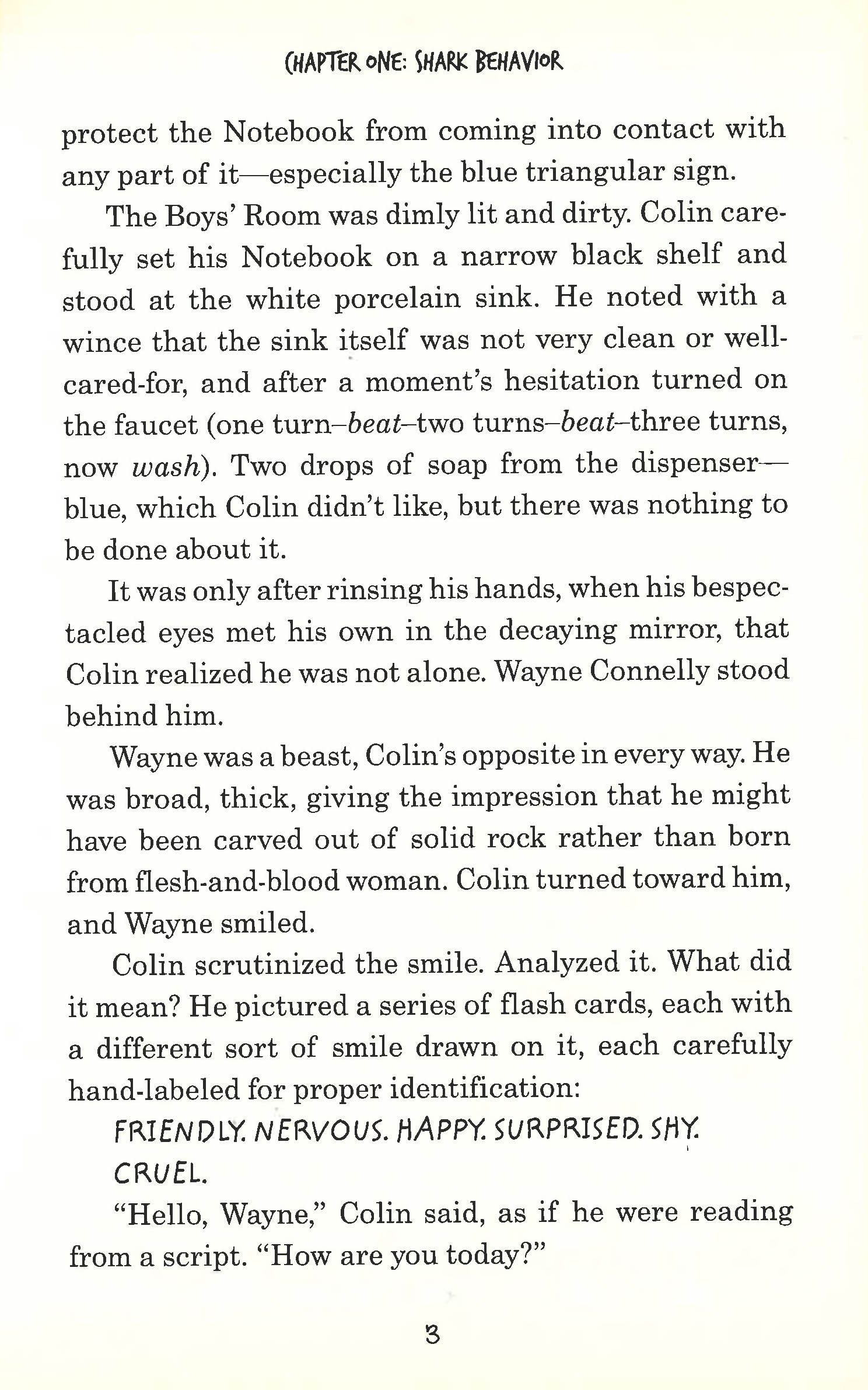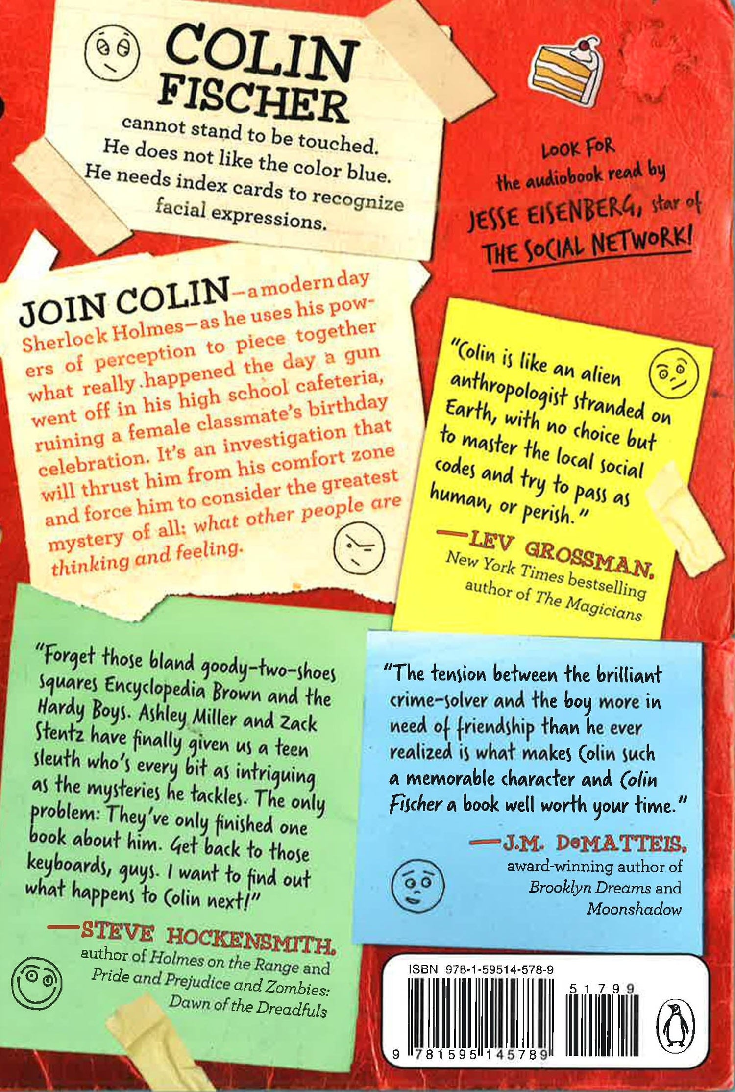 SOLVING CRIME, ONE FACIAL EXPRESSION AT A TIME Colin Fischer cannot stand to be touched. He does not like the color blue. He needs index cards to recognize facial expressions. But when a gun is found in the school cafeteria, interrupting a female classmate's birthday celebration, Colin is the only for the investigation. It's up to him to prove that Wayne Connelly, the school bully and Colin's frequent tormenter, didn't bring the gun to school. After all, Wayne didn't have frosting on his hands, and there was white chocolate frosting found on the grip of the smoking gun... Colin Fischer is a modern-day Sherlock Holmes, and his story--as told by the screenwriters of X-Men: First Class and Thor--is perfect for readers who have graduated from Encyclopedia Brown and who are ready to consider the greatest mystery of all: what other people are thinking and feeling.